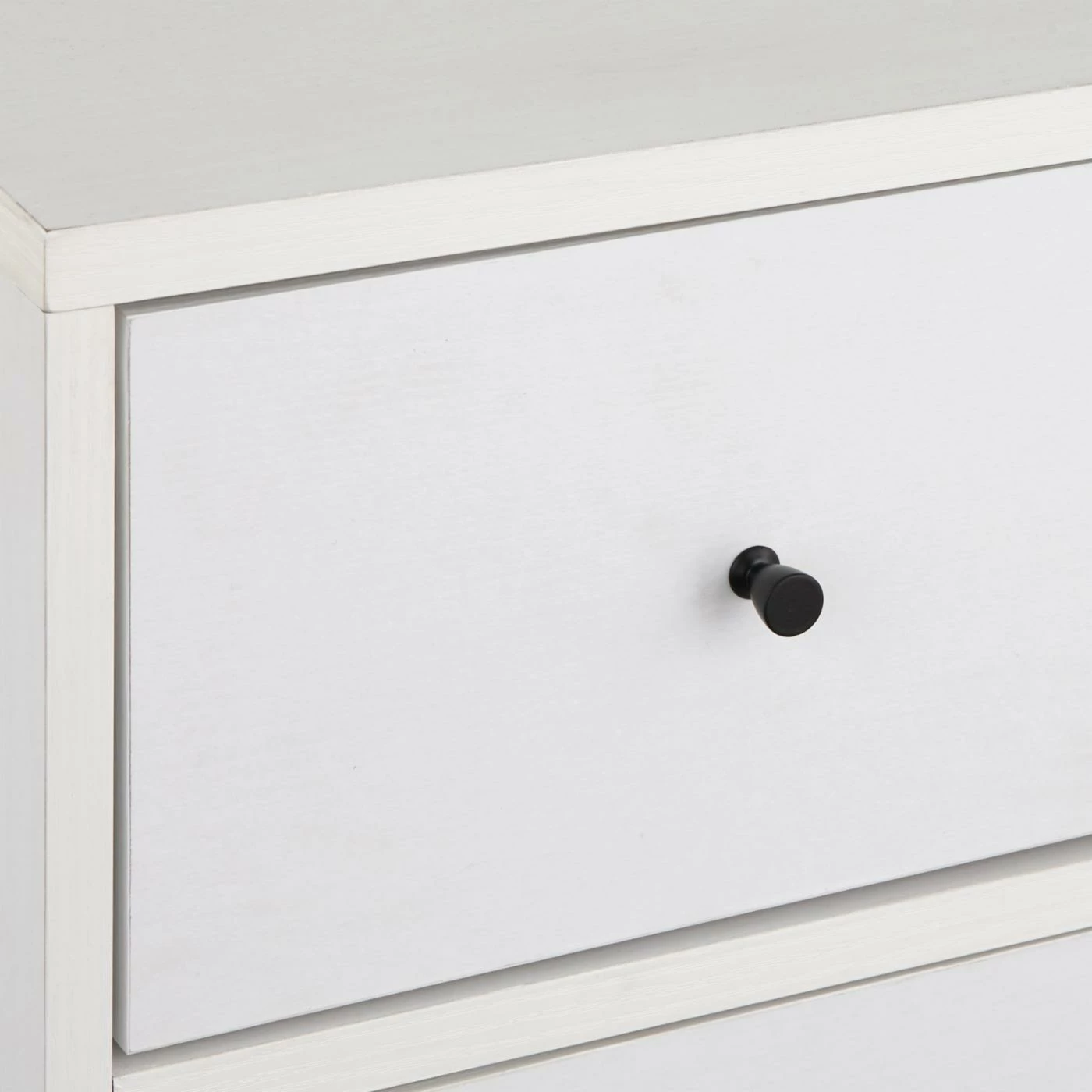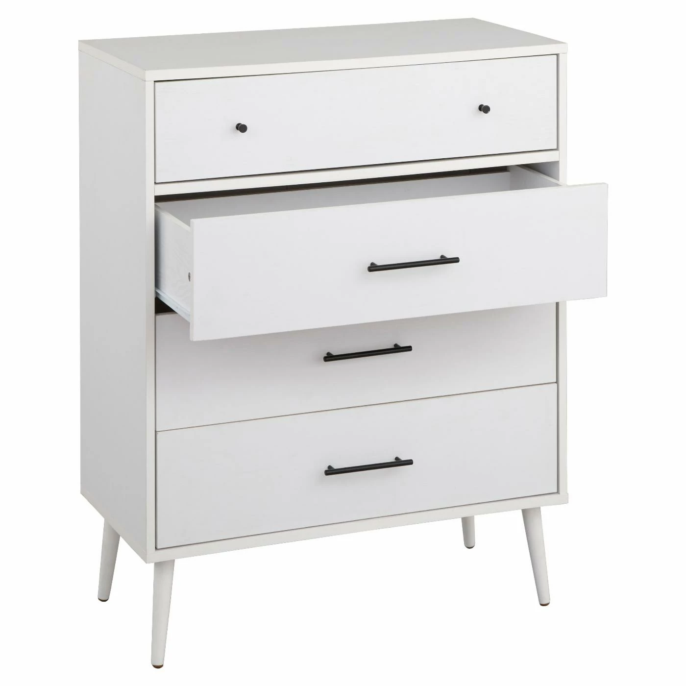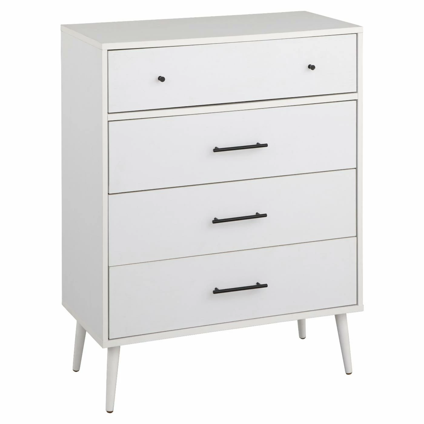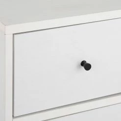 Go retro in your sleep space with the Riveria 4 Drawer Bedroom Chest. This generously sized chest is crafted from white laminated particle board and features four drawers with black knobs on the top drawer and black handles on the lower drawers. Pair with the Riveria 2 Drawer Nightstand to complete the look.