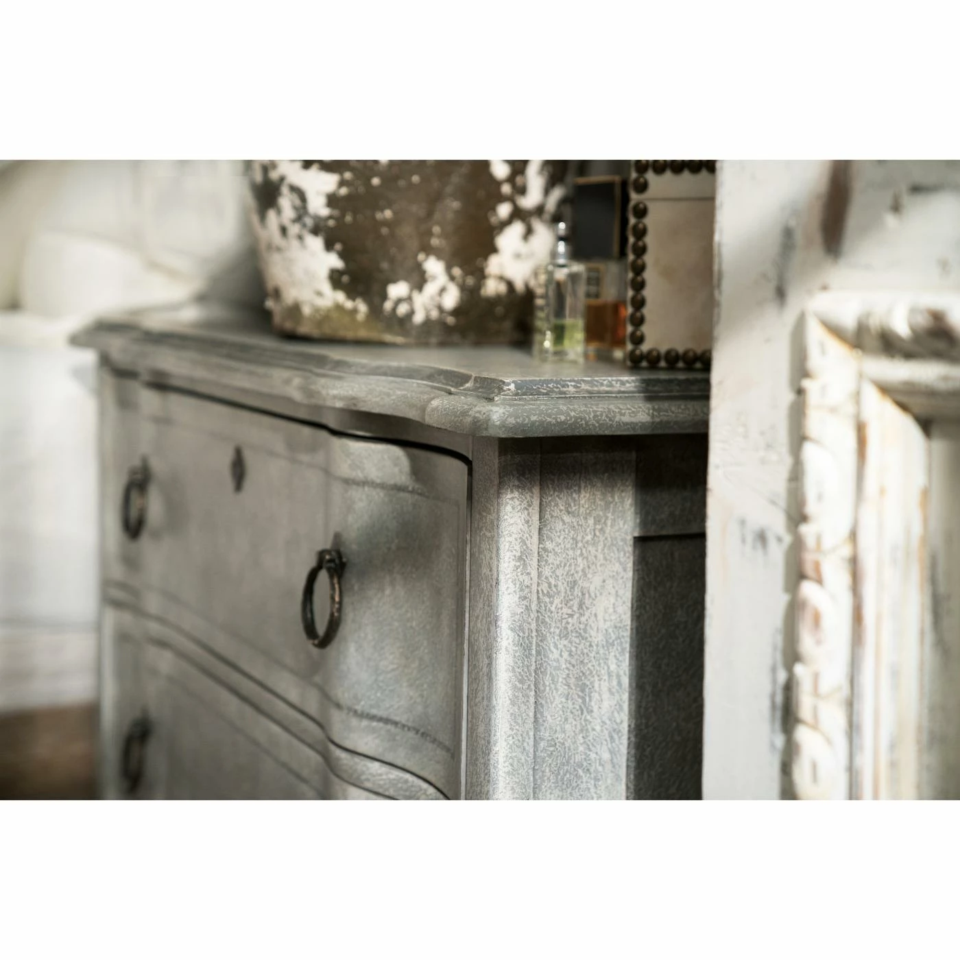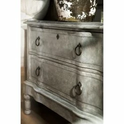 As a nightstand, clothing chest, or just a living room catch-all, the Hooker Furniture Boheme Verbena 2 Drawer Bachelors Chest combines classical elegance and modern functionality into one sensational piece. This wide chest is constructed from solid poplar wood with turned legs. A stonewash blue finish adds a weathered appeal to the look. Two drawers offer ample storage space; the top drawer has a felt lining to protect valuables while the bottom drawer is cedar-lined. Antique bronze ring handles equip the drawer, accented with a faux keyhole escutcheon. A base light with dimmer switch is incorporated into the design.