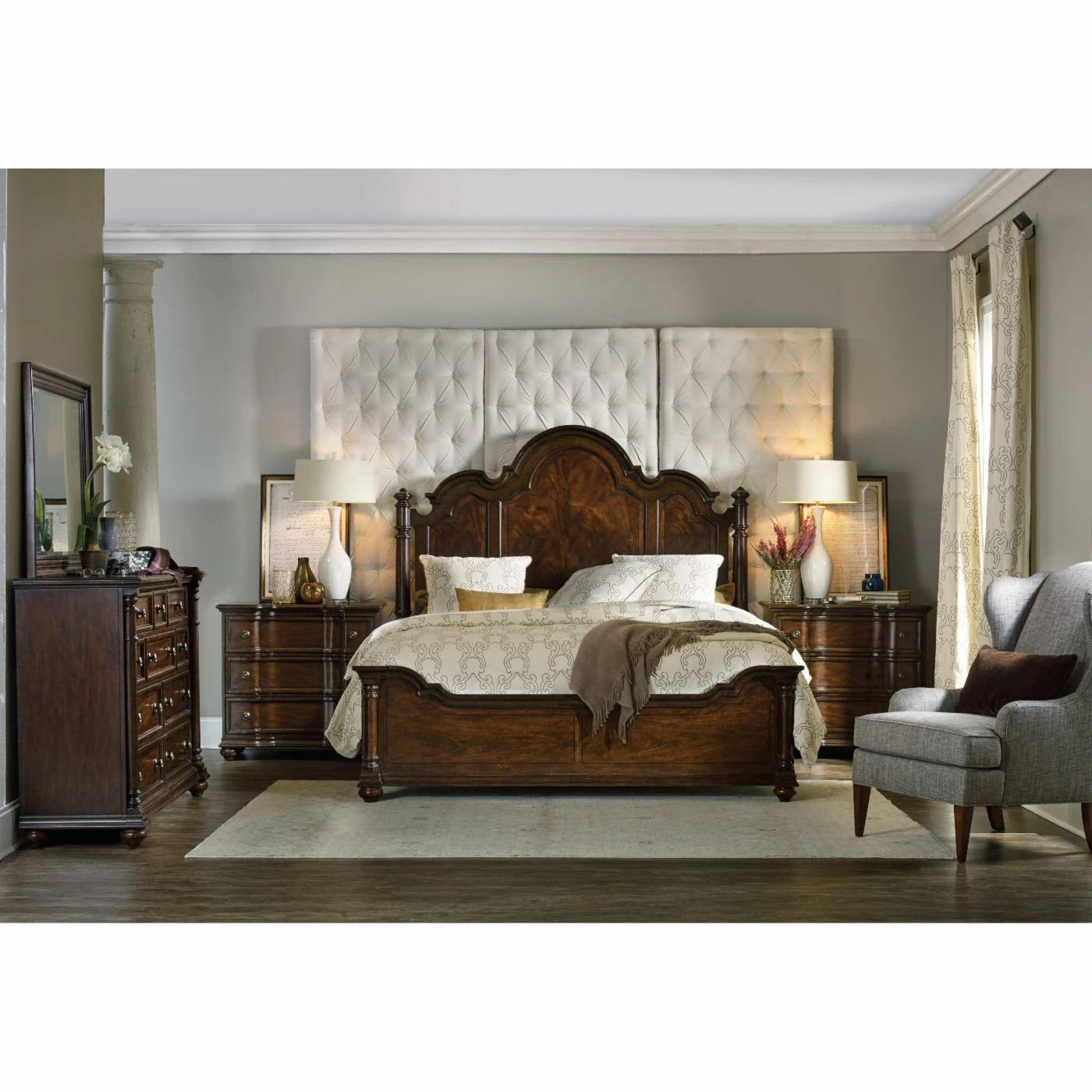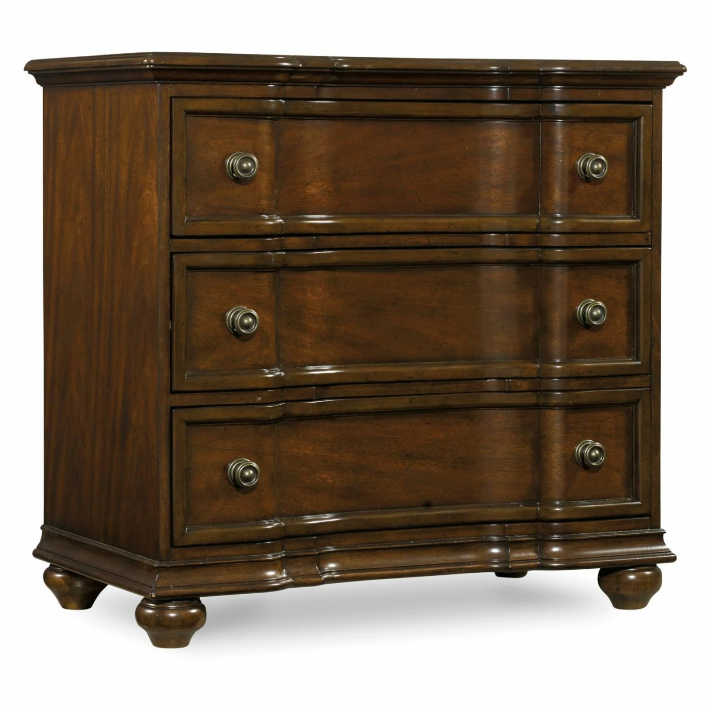 The reverse breakfront design of this Hooker Furniture Leesburg Bachelors Chest gives it a sinuous silhouette. This three-drawer bachelor’s chest is a versatile charmer as it includes a cedar-lined bottom drawer and two electrical outlets, with one featuring a dimmer switch for your lamp. The chest is crafted from rubberwood solids and mahogany veneers in a rich, multi-step mahogany finish. Designer details include generous moldings, curved corner posts, and turned bun feet.