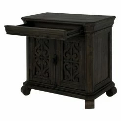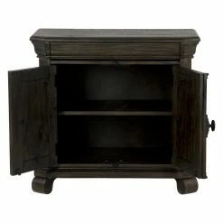 Achieve roomy storage and sophisticated style with the Magnussen Bellamy Traditional Peppercorn Bachelor Door Chest, enhanced in a unique peppercorn finish. This warm and inviting bachelor chest includes two large doors adorned in a fanciful open scrollwork design. Black metal hardware and curved bun feet round out its distinctive aesthetic.