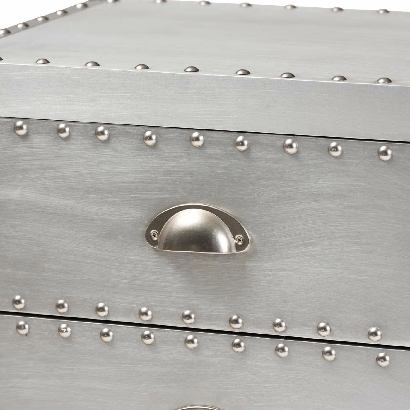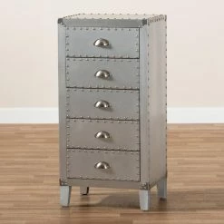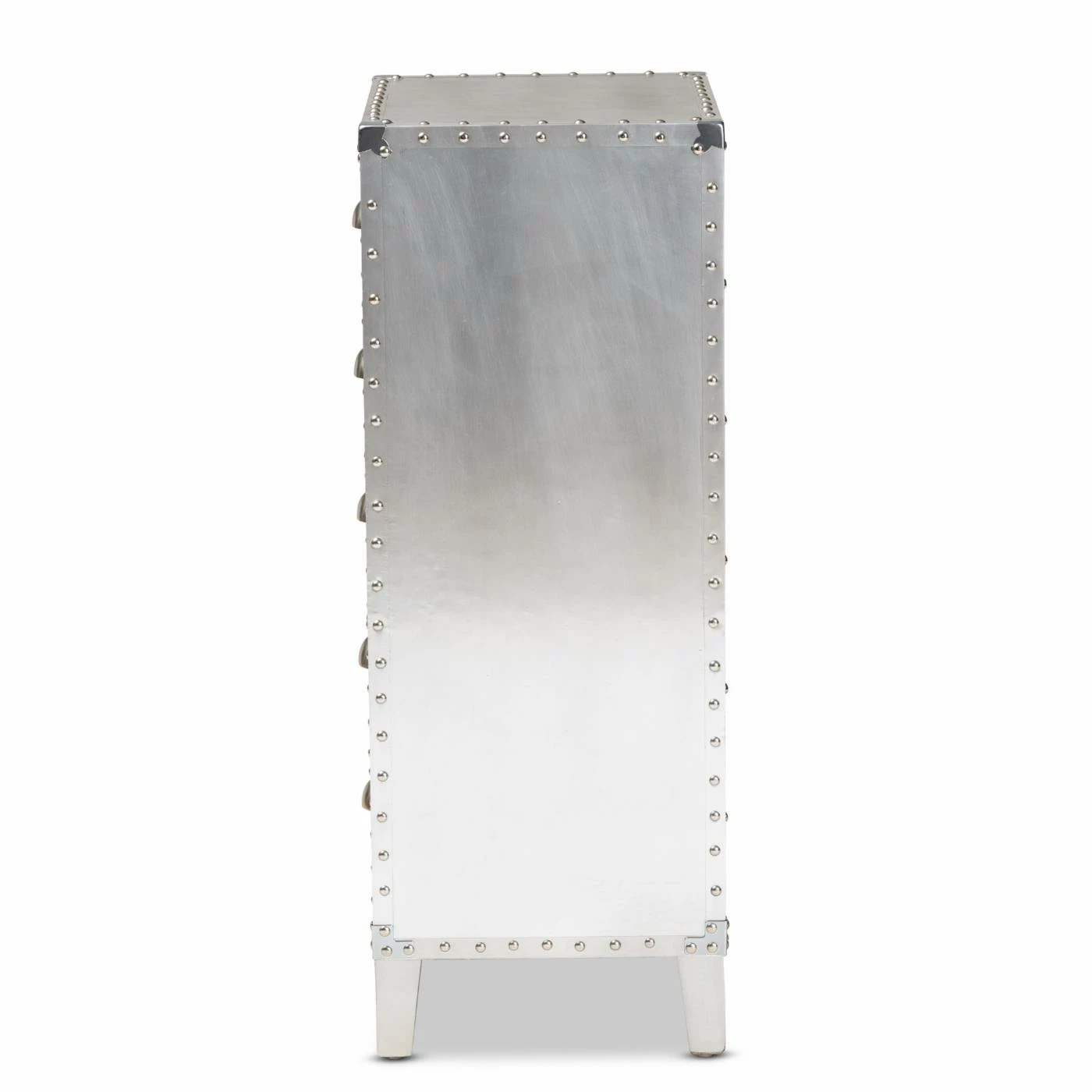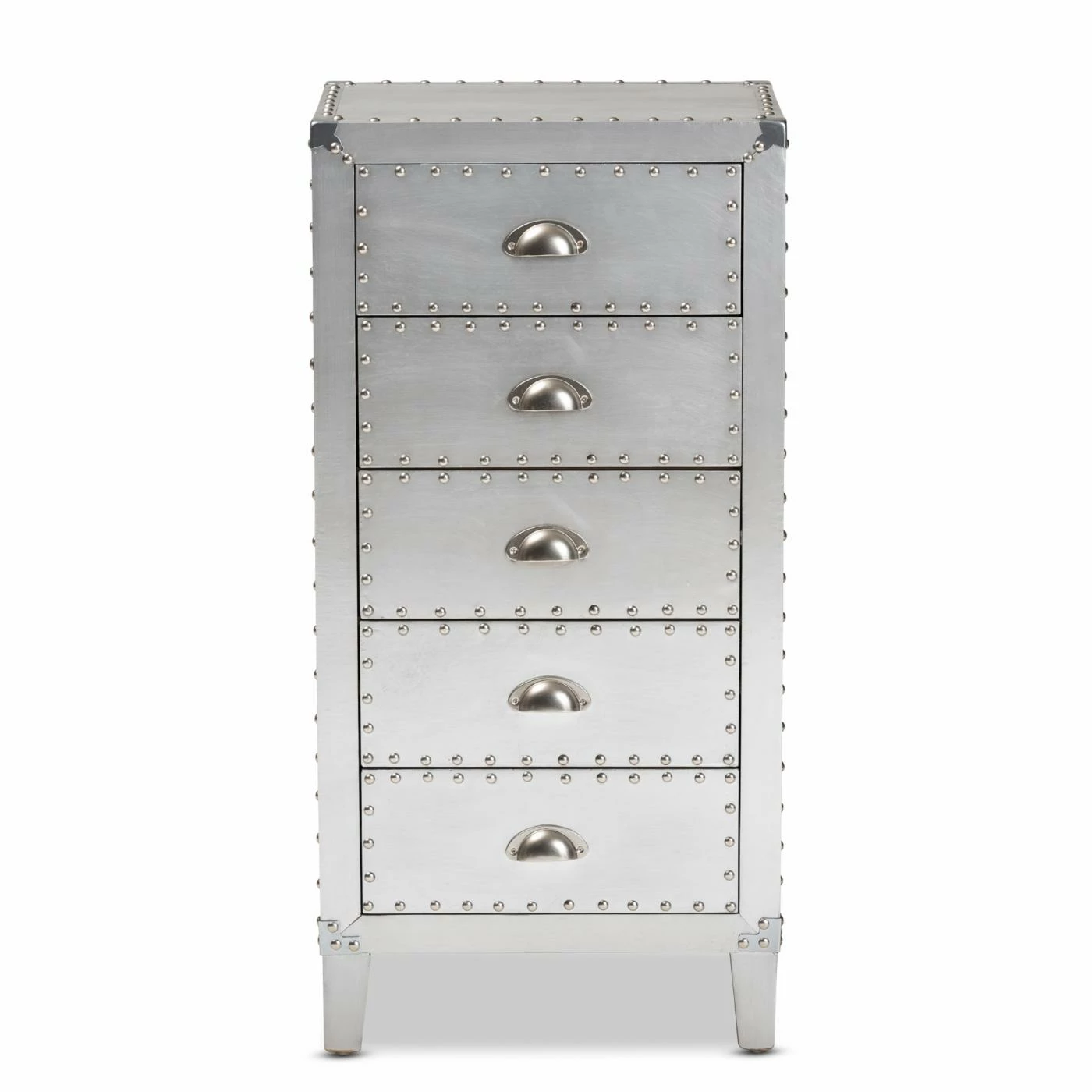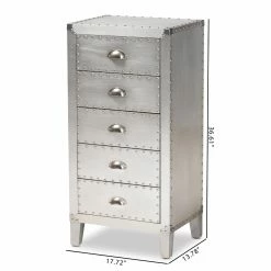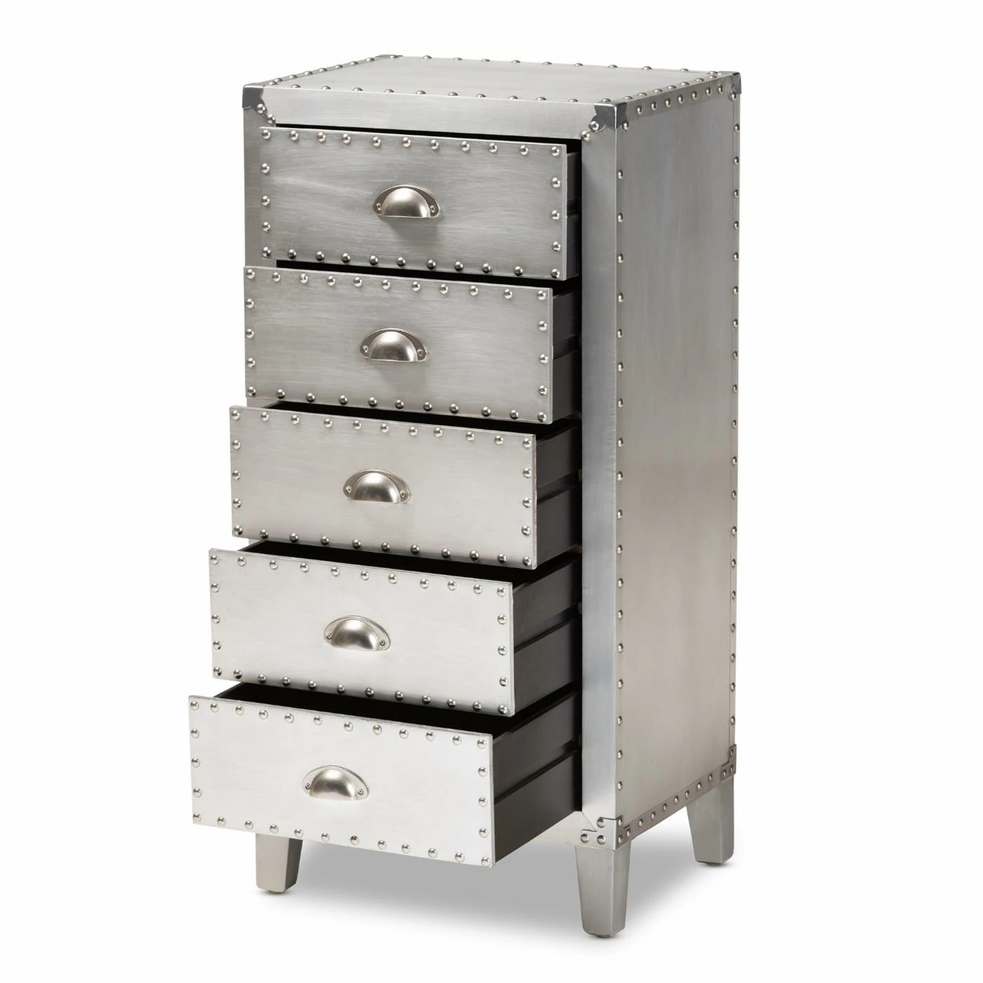 Add a cool industrial vibe to your space with the Carel cabinet. Built from sturdy wood and metal, this silver cabinet provides five spacious drawers to keep items organized and out of sight. Inspired by vintage storage trunks, the Carel features corner protectors and elaborate rivet accents. Polished metal drawer handles complete the look. Use this stylish piece in the living room or hallway. The Carel cabinet will arrive fully assembled.