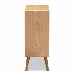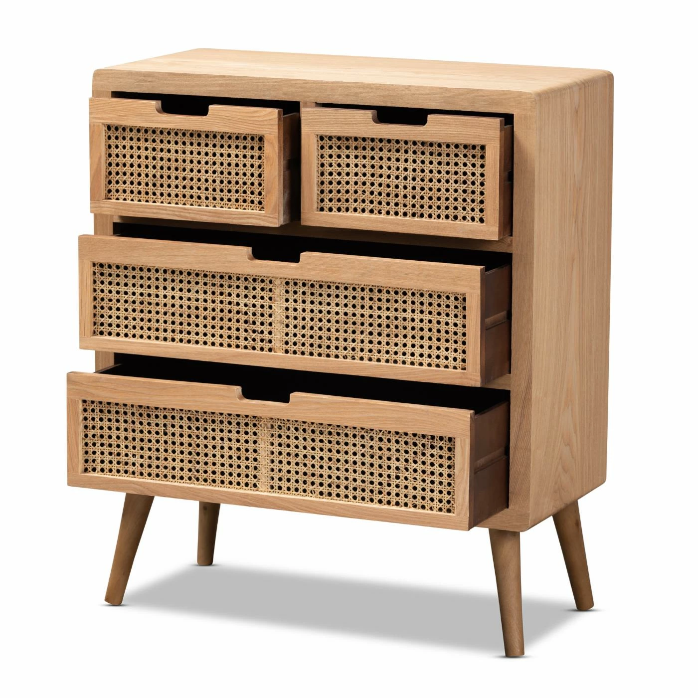 Cultivate a fresh, retro feel in your bedroom with the Alina cabinet. This sturdy wood cabinet showcases a medium oak finish for a look thatโs both warm and inviting. Four drawers provide ample space for clothes, undergarments, and more. Woven rattan adds a cool, bohemian vibe, while angled legs and cut-out drawer handles lend mid-century charm. The Alina cabinet requires assembly. This is a product of nature and may have variations in areas such as, but not limited to, color, pattern, grain and texture. The hair-like strands of rattan/rattan-fiber are common due to nature of the material.