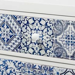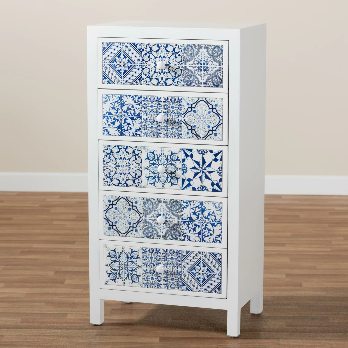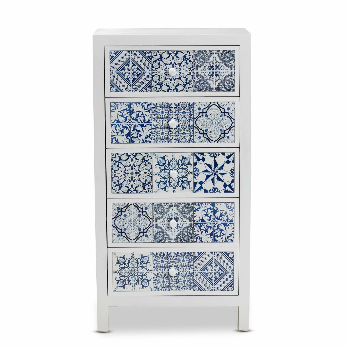 Inspired by handcrafted furniture from Spain, the Alma accent cabinet adds visual interest to any space. Built from wood, this cabinet features a sleek white finish that complements any color palette. Five spacious drawers keep items organized and out of sight. Each drawer features a blue floral motif, similar to the charming tile designs found in the Mediterranean region. Its compact size makes it easy to incorporate into your living room or hallway. The Alma accent cabinet will arrive fully assembled.