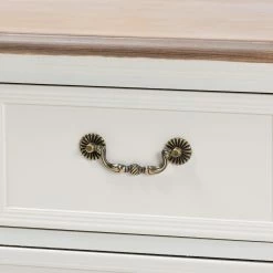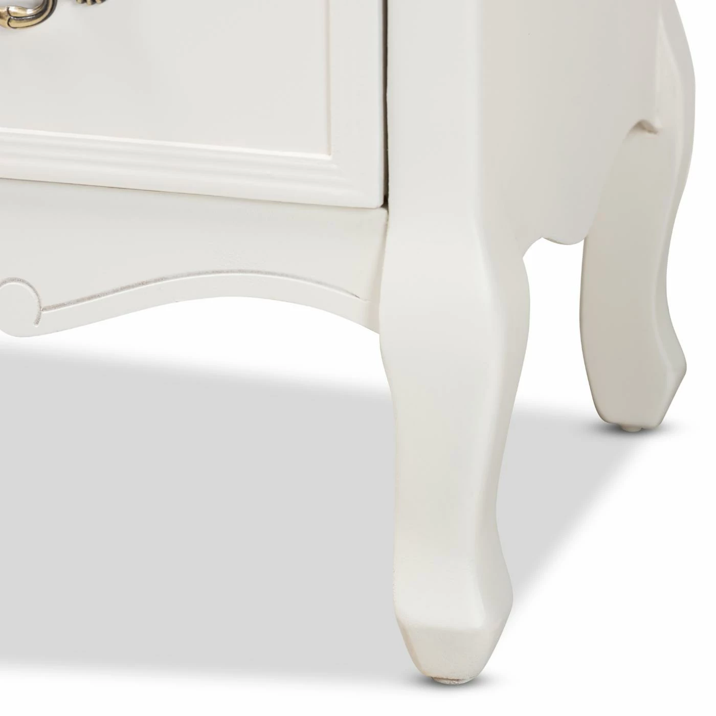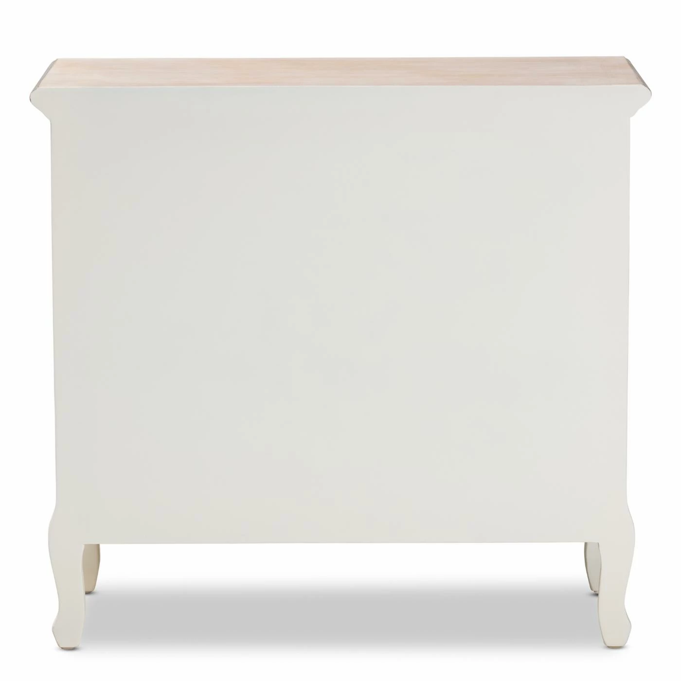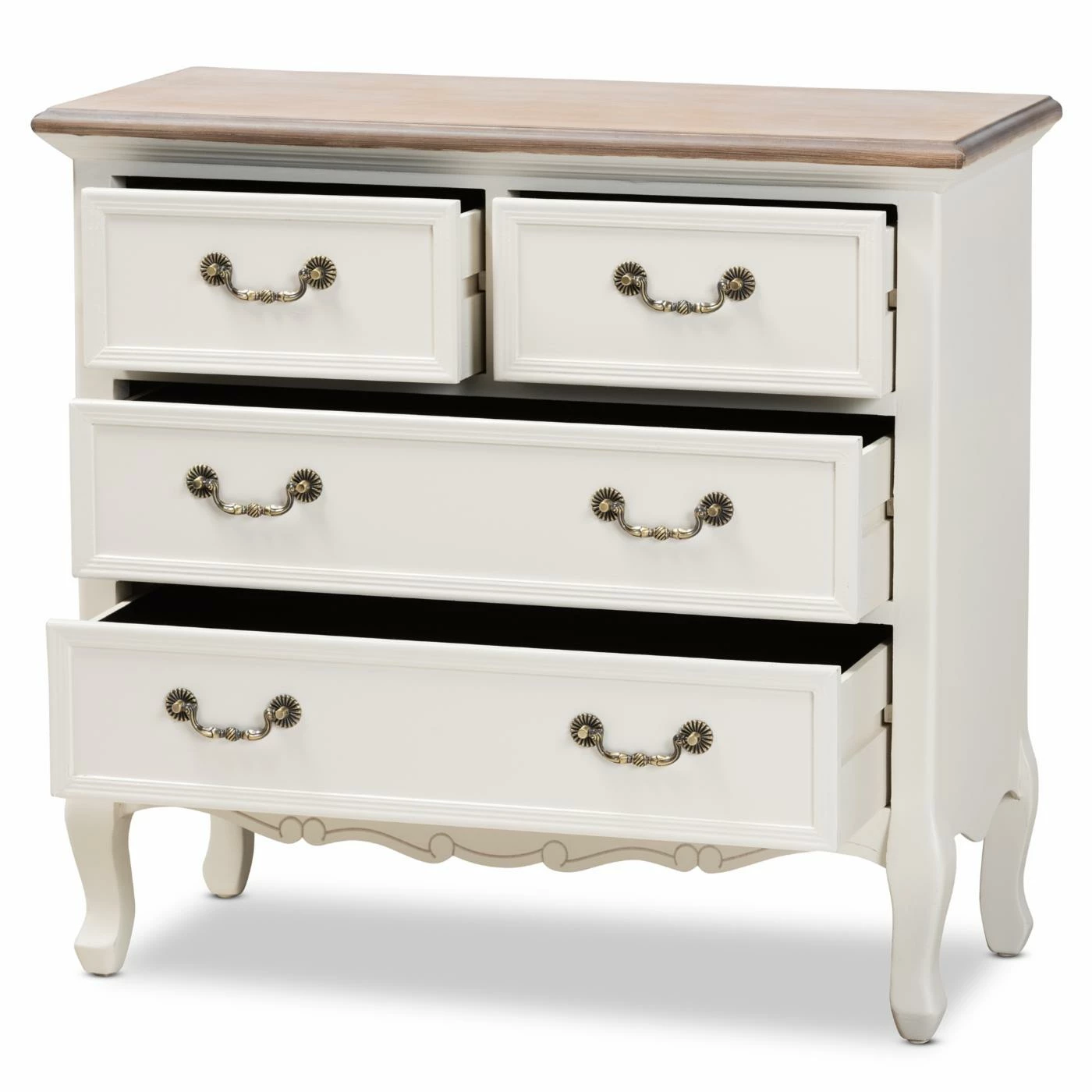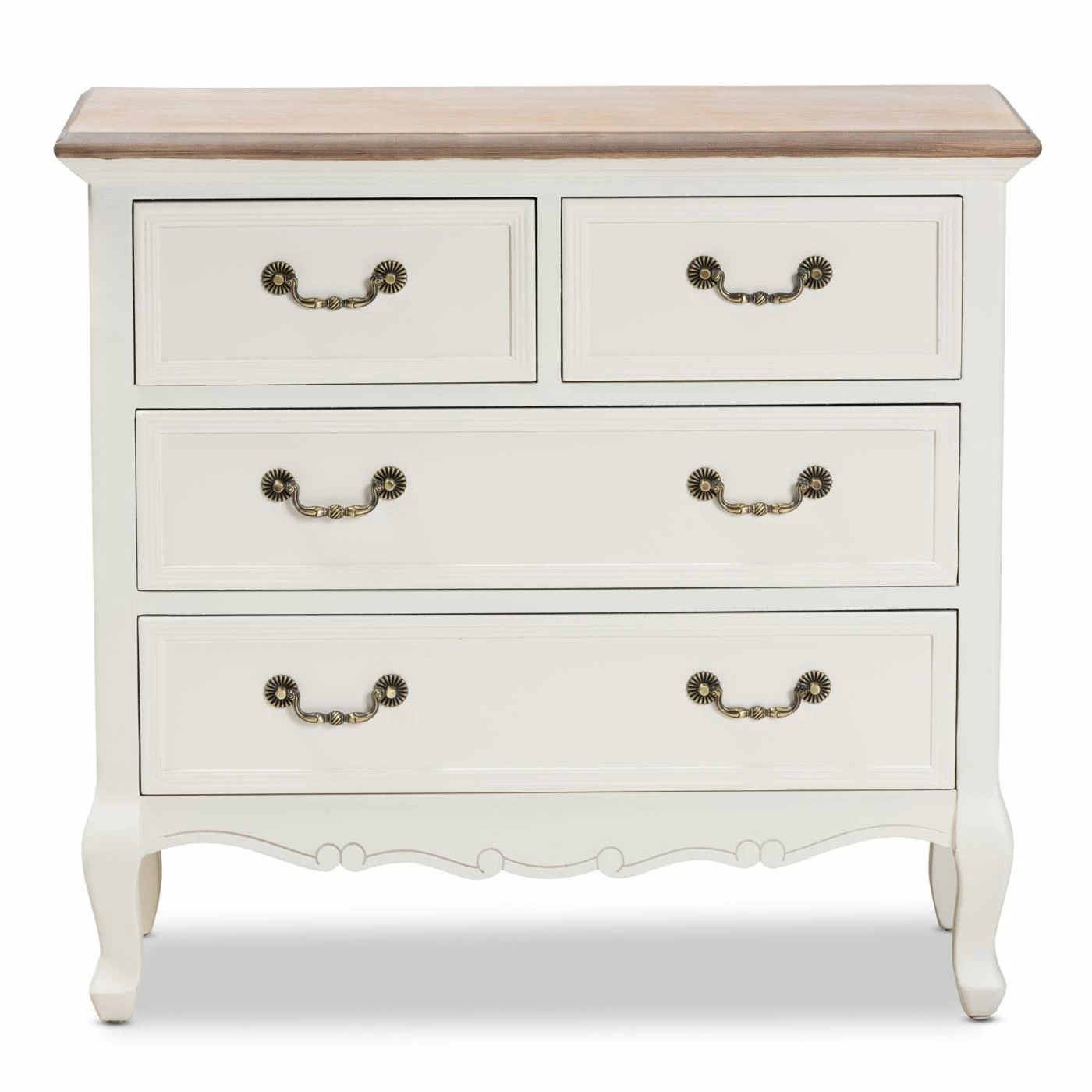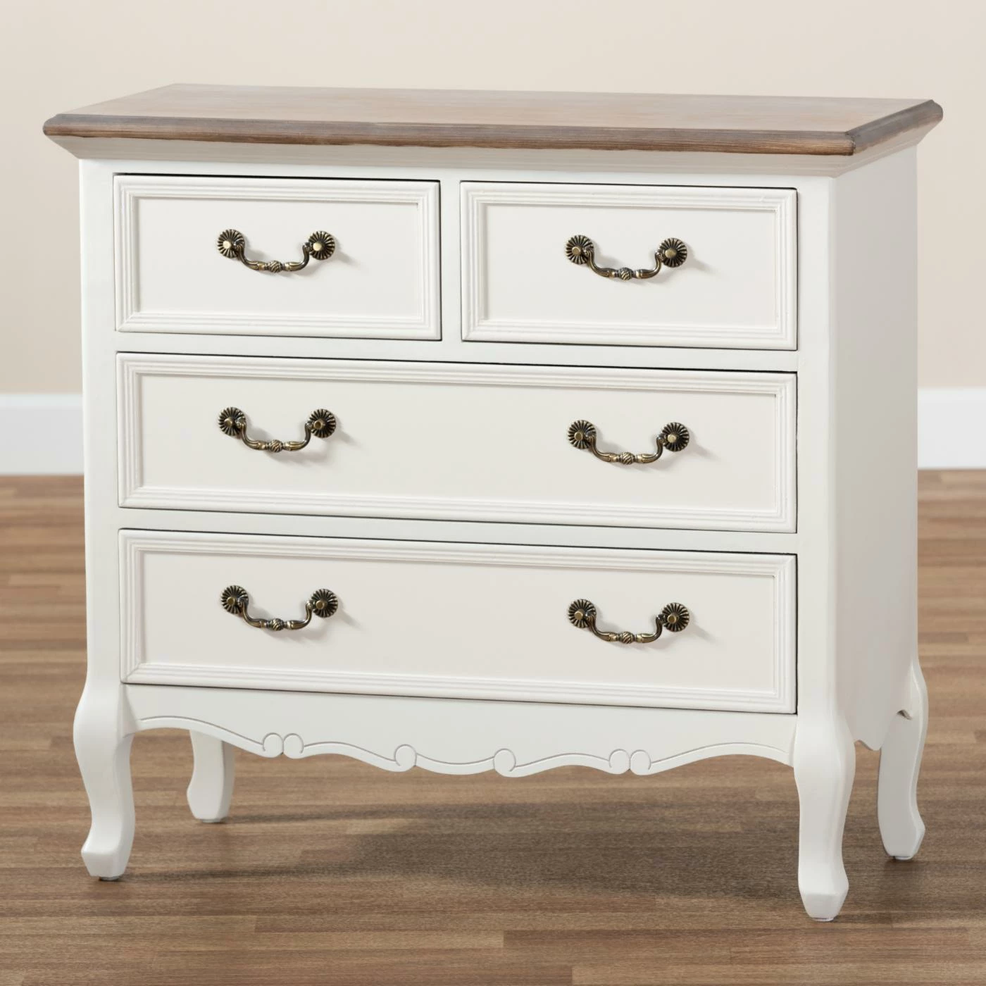 Enhance your bedroom with the charming Amalie cabinet. Constructed from wood, this cabinet pairs a white-washed oak tabletop with polished white drawers. The tabletop features space to place a lamp and some decorative items, while four drawers offer storage space for clothing and knick-knacks. Each drawer is adorned with molding detailing and an elegant brass metal handle. Inspired by French provincial furniture, the Amalie displays exquisite carvings on the bottom, as well as cabriole legs. The Amalie cabinet will arrive fully assembled.