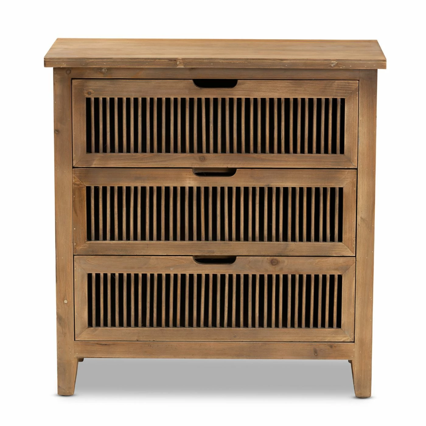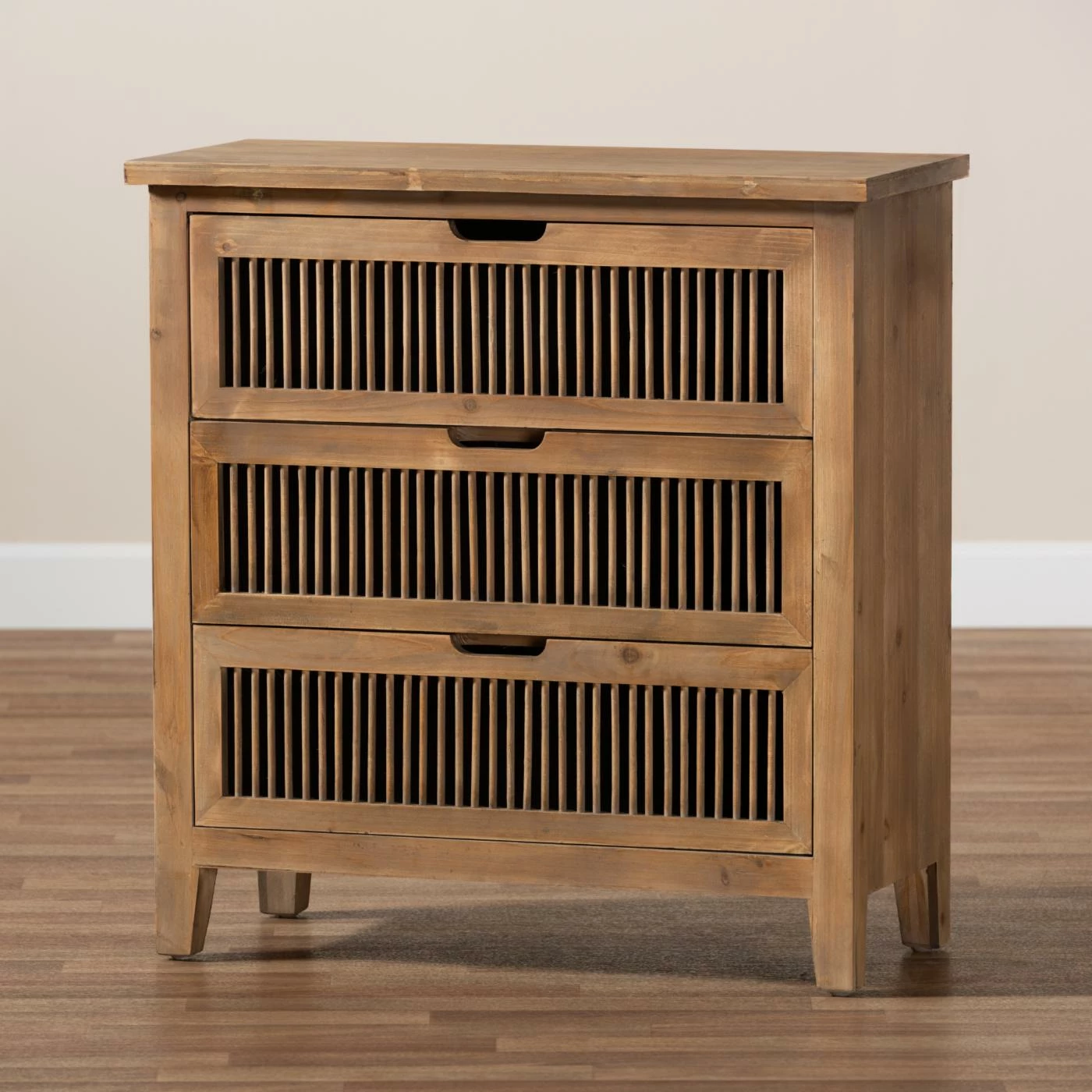 Rustic tones and clean lines make the Clement cabinet a handsome addition to any space. This sturdy wood cabinet displays a medium oak finish that highlights the wood grains for a cozy, rustic look. Three drawers provide space to store linens or display trinkets. Spindle detailing lends visual interest, while cut-out door handles enhance the cabinetβs natural appeal. The Clement cabinet will arrive fully assembled.