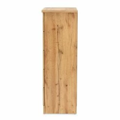 Organize your clothes and bedding with the Colburn chest. Its natural oak brown color palette and classic-tallboy design exudes a refined attitude into your space. This sturdy piece is constructed from high-density engineered wood boards for long-lasting strength along with quality runners for smooth functionality. Requiring assembly, the Colburn features five large drawers to efficiently organize any space. Metal drawer handles add a sleek, contemporary touch, characterizing the Colburn storage chest as a sophisticated solution to modern bedroom storage.