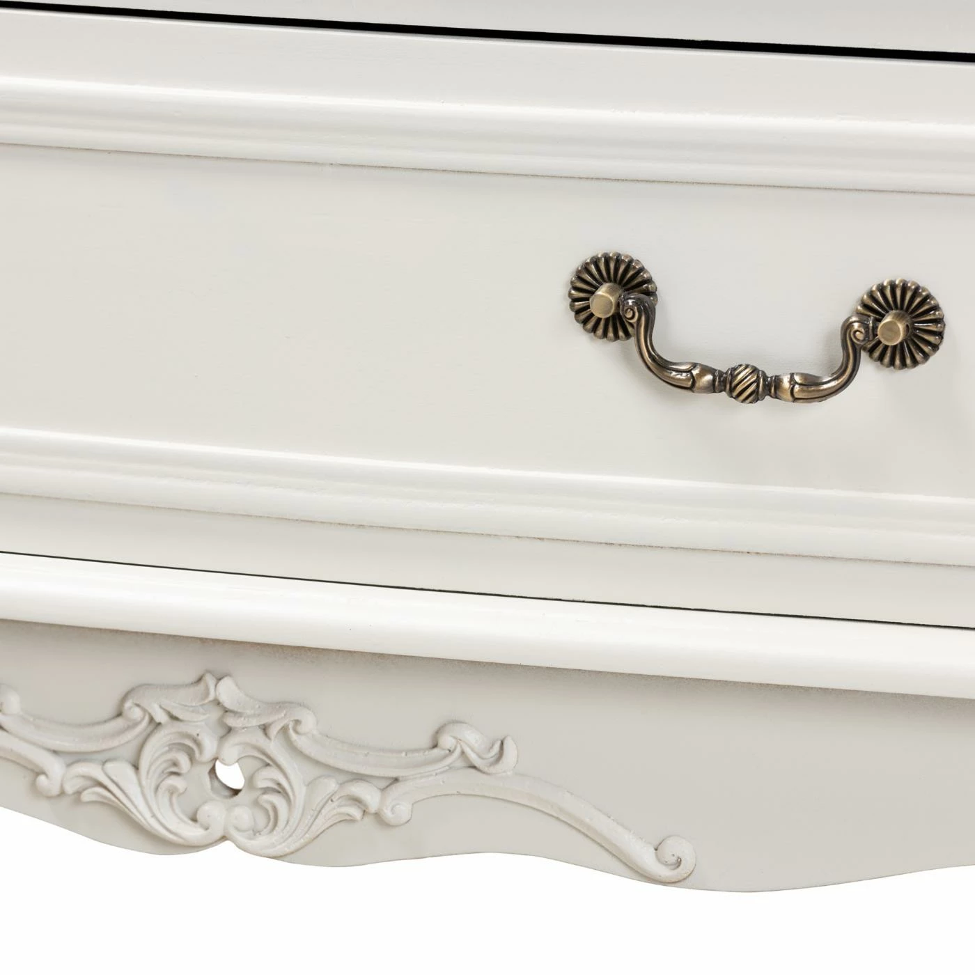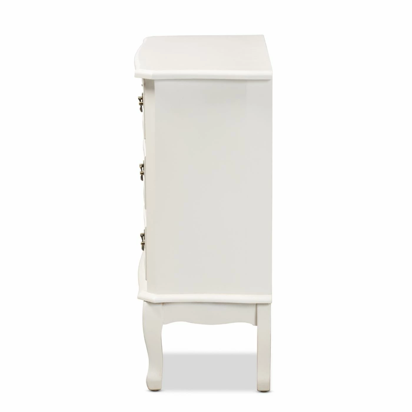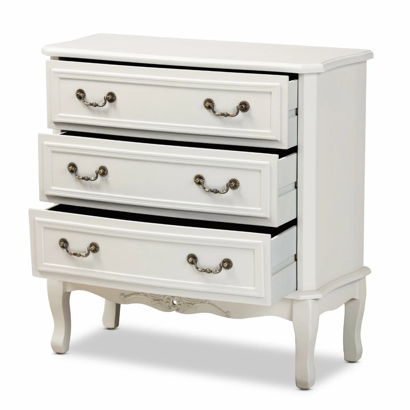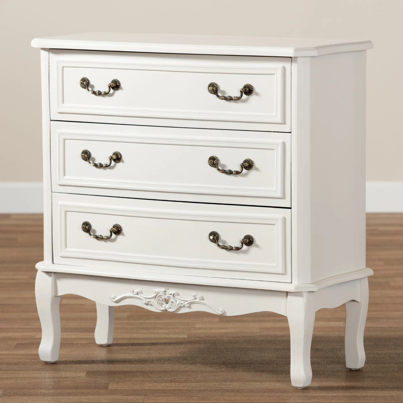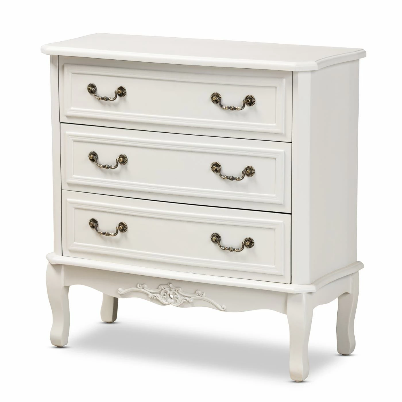 With its floral embellishments, the Gabrielle cabinet is a charming addition to any bedroom. Constructed from wood, this cabinet features three spacious drawers. Its classic white finish highlights the stunning attention to detail in the inset paneling on the drawers, as well as the enchanting floral molding on the bottom. Decorative brass metal handles and cabriole legs add a delightful French-inspired look. The Gabrielle cabinet will arrive fully assembled.