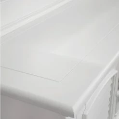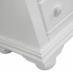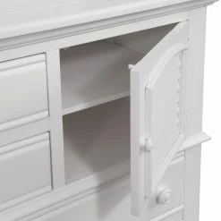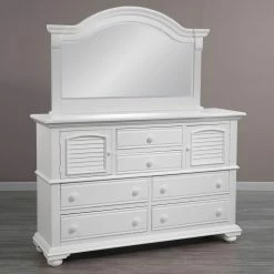 Bright and sunny is the calling card of the Cottage Traditions 6 Drawer High Dresser – Eggshell White. This pine wood solids- and pine veneer-crafted high dresser features six spacious drawers as well as two doors with signature arched louvered inserts and two adjustable shelves. Other highlights on this cottage-styled dresser include bun feet, solid wood knobs, and crown molding. You can also add the optional beveled mirror to top off this wonderful piece.