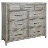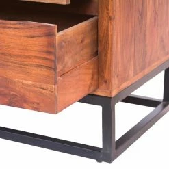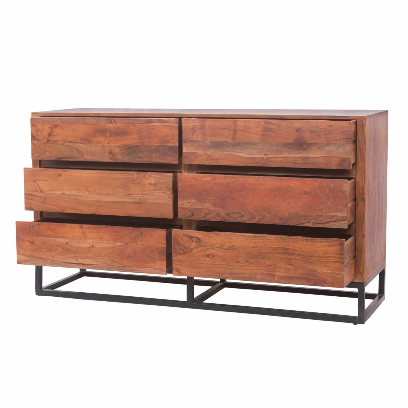 Invite spacious storage to your bedroom with the Benzara Modern Acacia 6 Drawer Dresser. This wide dresser offers six drawers, allowing you to keep everything from silky shirts to bulky sweatpants folded and arranged. Each drawer has ball-bearing glides and a seamless face, accented with recessed handles. The cabinet top is constructed from solid acacia wood and finished in brown. A raised squared steel base supports the dresser, finished in black.