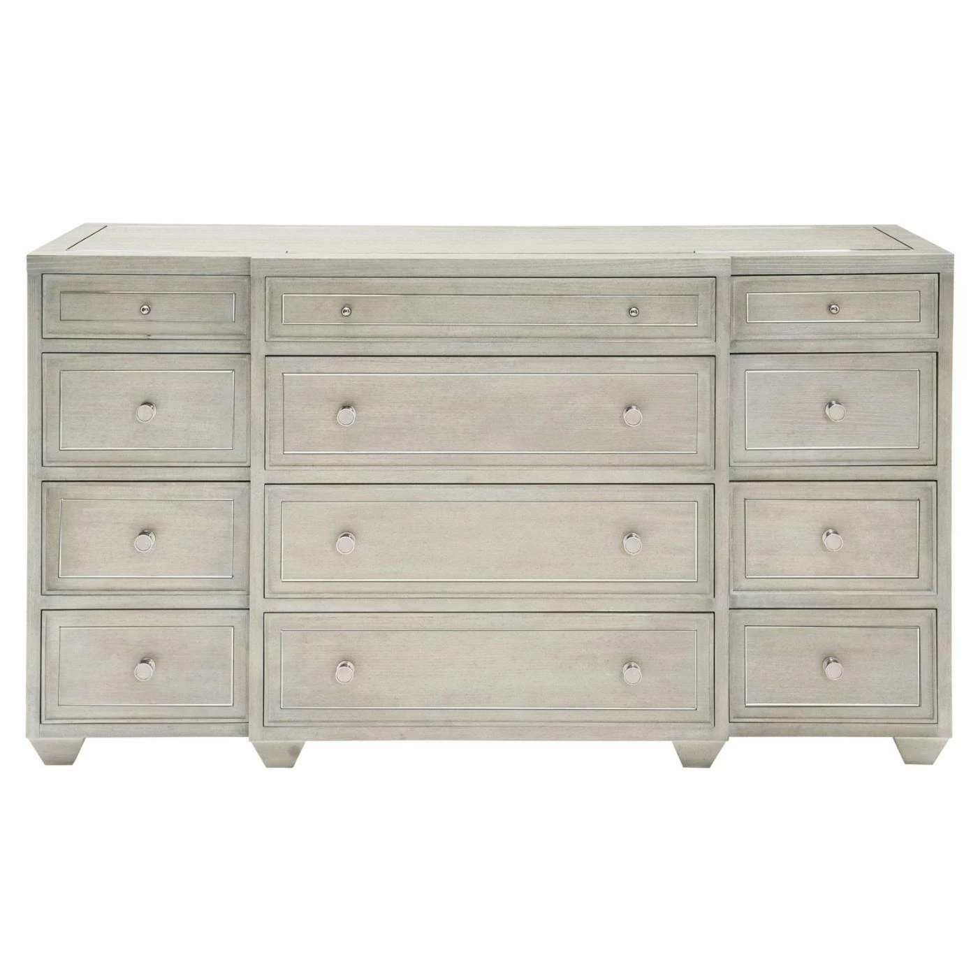 Stay organized while adding elegant style to your bedroom with the Bernhardt Criteria 12 Drawer Dresser. Boasting 12 drawers, it will give you ample space to store your sweaters, jeans, delicates, jewelry, and more. Or place this dresser in your guest room so you have storage space for seasonal clothes and blankets while still keeping a few drawers open for guests to use. Crafted from ash solids and quartered ash veneers, this strong and durable dresser is made to withstand the rigors of everyday use. Finished in a heather gray with a stainless steel metal inlay on top and on the drawer fronts, this piece will blend seamlessly with your current decor. A center support leg provides added stability while an anti-tip kit is included for safety.