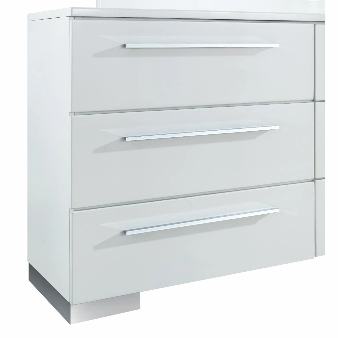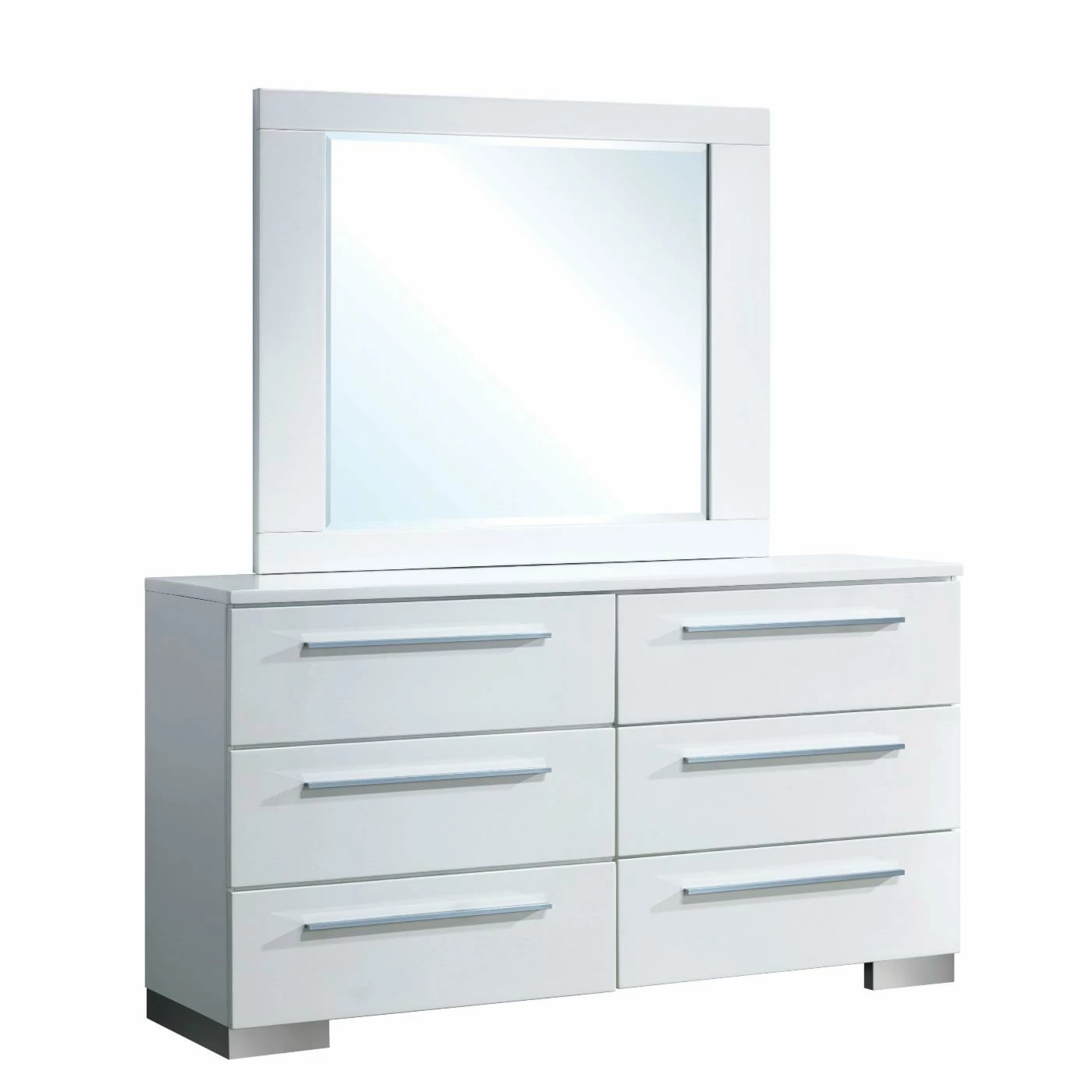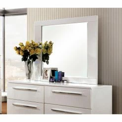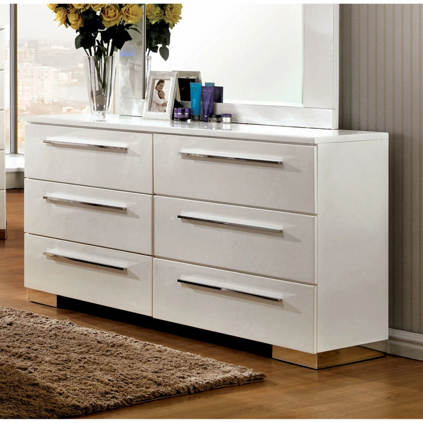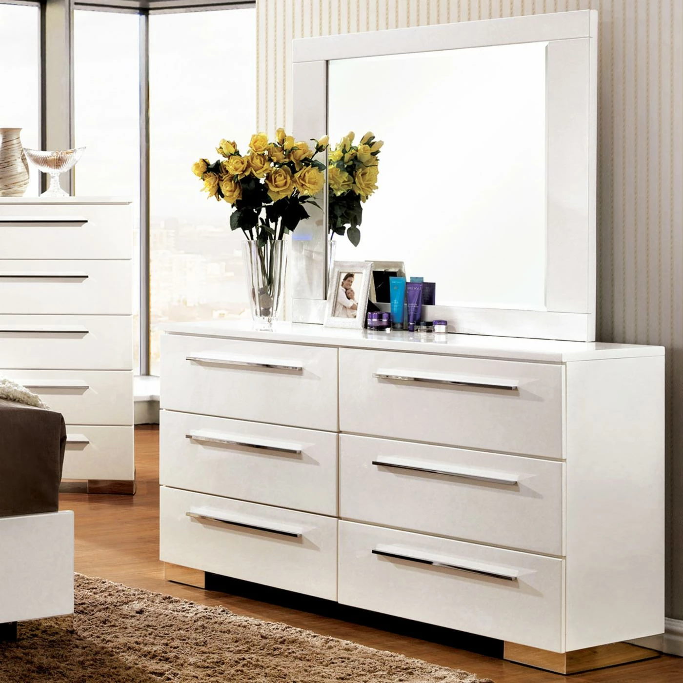 Glamour radiates from the eye-catching structure of this Furniture of America Velera 6 Drawer Dresser with Optional Mirror, a useful addition to any elegant bedroom. This dresser boats quality solid wood and veneer construction. It also is equipped with six drawers that are spacious enough to hold loads of items, like clothing, bedding, sheets, and more. The top drawers are also lined in soft felt to hold delicate and precious items. A crisp white finish adorns this sturdily designed dresser. This dresser can be purchased alone or with a sleek glass mirror.