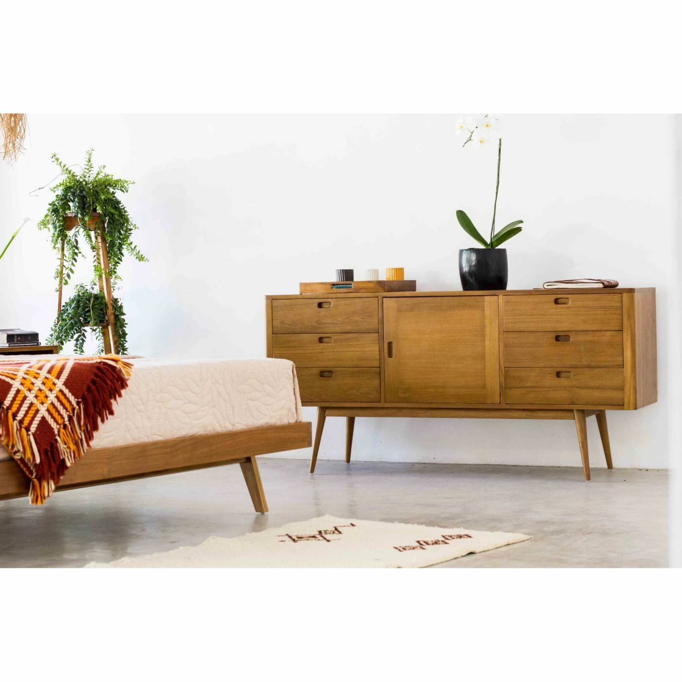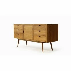 Fabulously inspired by the fifties, the aptly named Harmonia Living Fifties 6 Drawer Dresser is a great way to introduce mid-century modern design elements into your bedroom’s dΓ©cor. And ample storage abounds on this dresser, which features a door with an interior shelf flanked by six drawers. Carved handles add to the retro simplicity, and the dresser is crafted of plantation-grown teak wood in a Danish Honey finish that highlights the natural grain of the wood.