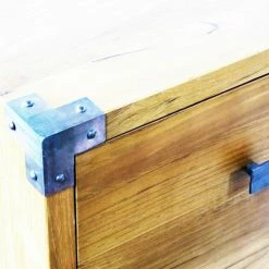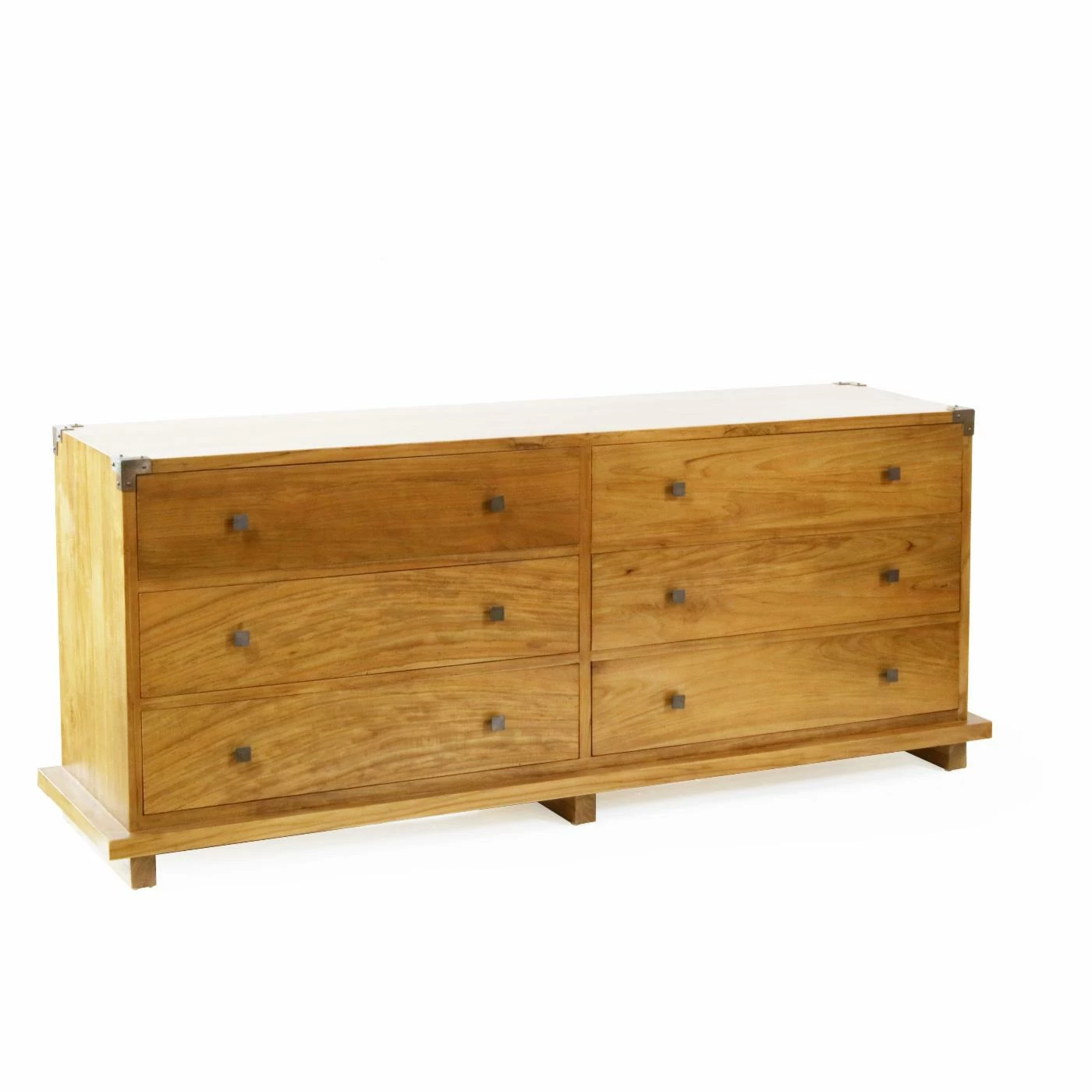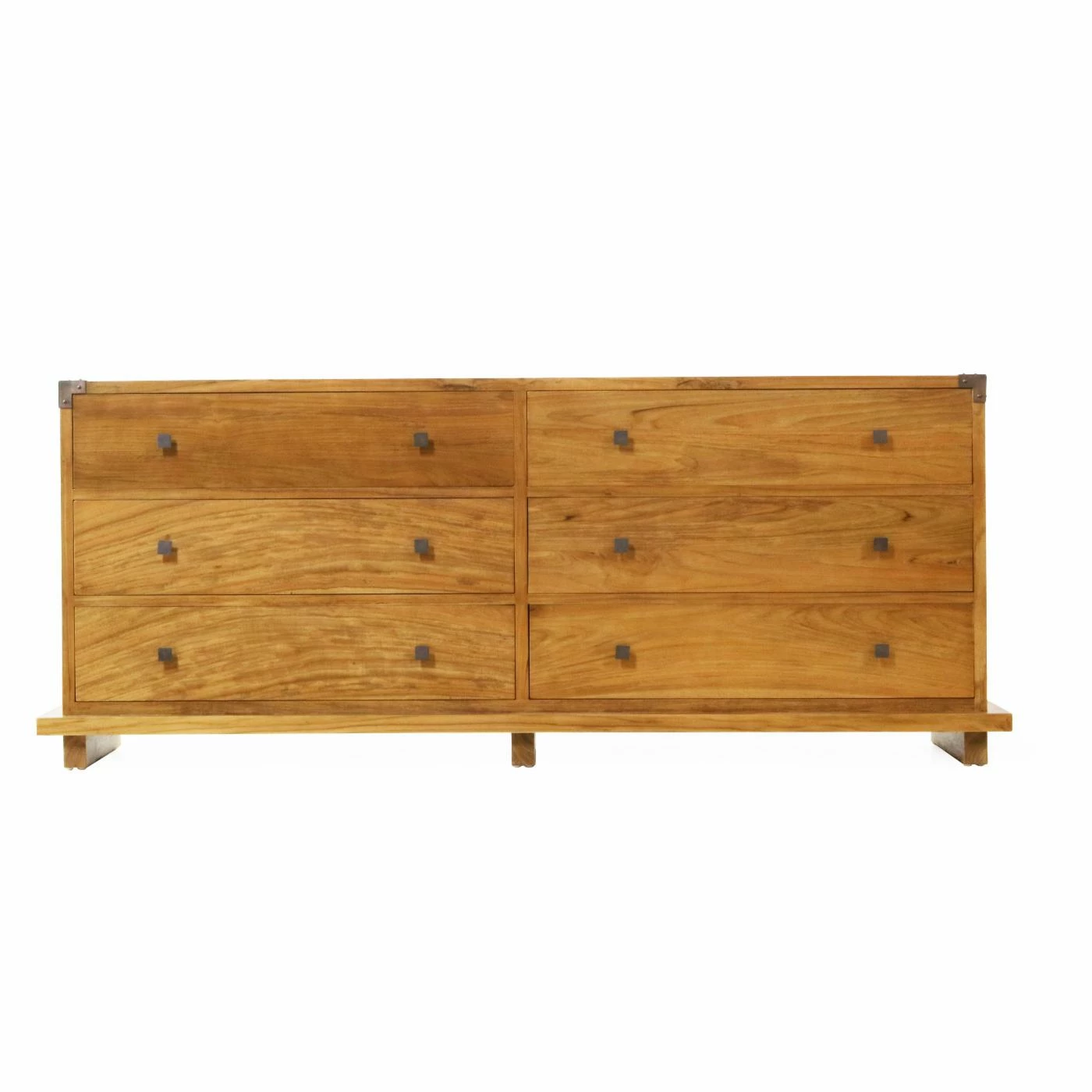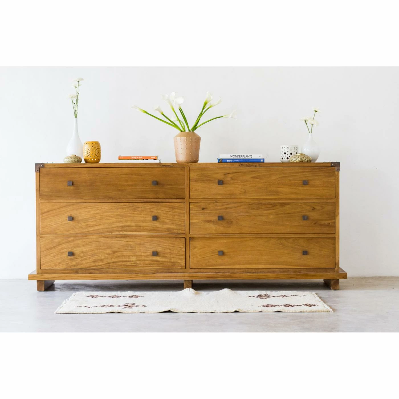 The Harmonia Living Kobe 6 Drawer Dresser channels contemporary Balinese furniture aesthetics to offer a clean-lined, serenely simple design for your bedroom dΓ©cor. The dresser is crafted of responsibly harvested, plantation-grown teak wood. The Danish Honey finish highlights the natural character of the wood, and the six drawers feature side-carved glides for easy movement. The metal knob pulls match the decorative accents on the top corners.