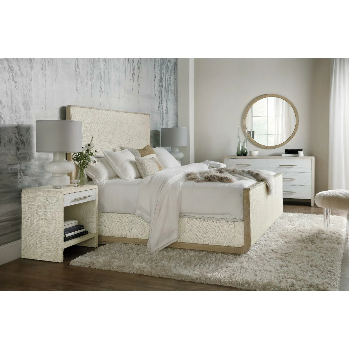 - Outside of case: Pebble Beach: lacquered burlap finish. Drawer fronts: Chalk: cast resin in a soft, white finish. Champagne colored bar pull hardware.