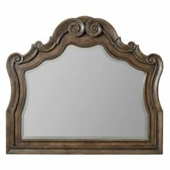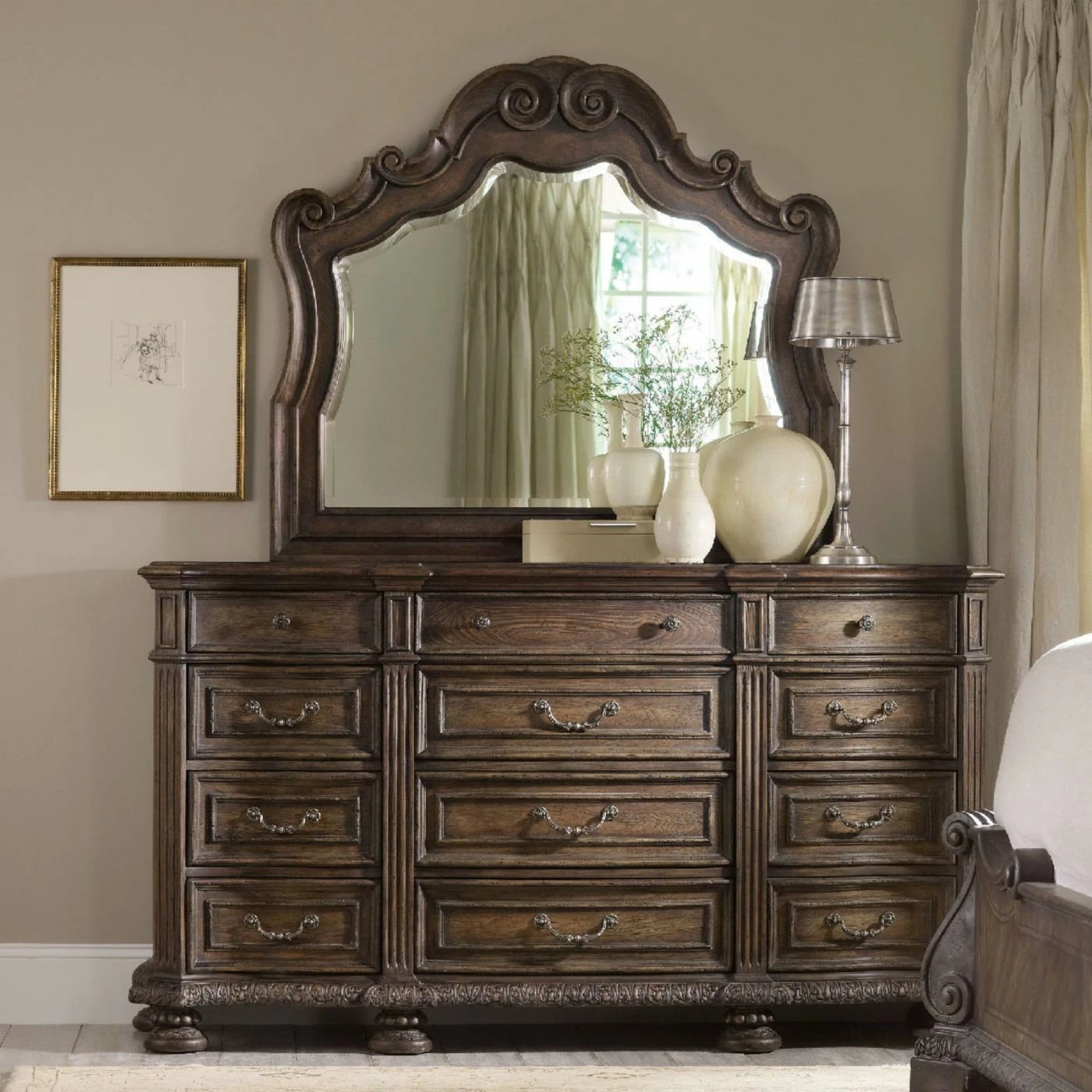 A drop-front center drawer provides space for a media console or sound bar, while the three bottom drawers feature a fragrant cedar lining. For the complete look, add the optional mirror to your order. Its beautiful carved details perfectly complement the dresser, and it measures 50W x 2.5D x 43.75H inches. Part of the Rhapsody collection from Hooker Furniture.