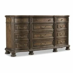 The best of classic and casual design elements flourish in the Hooker Furniture Rhapsody 12 Drawer Dresser, which does more than store your clothes – it brings an exuberant scale and style to your space. Inspired by traditional European design, the dresser features opulent elements like carved details and shaped bun feet given a down-to-earth charm thanks to the rustic walnut finish, which adds warmth and brings out the natural patina of the wood.