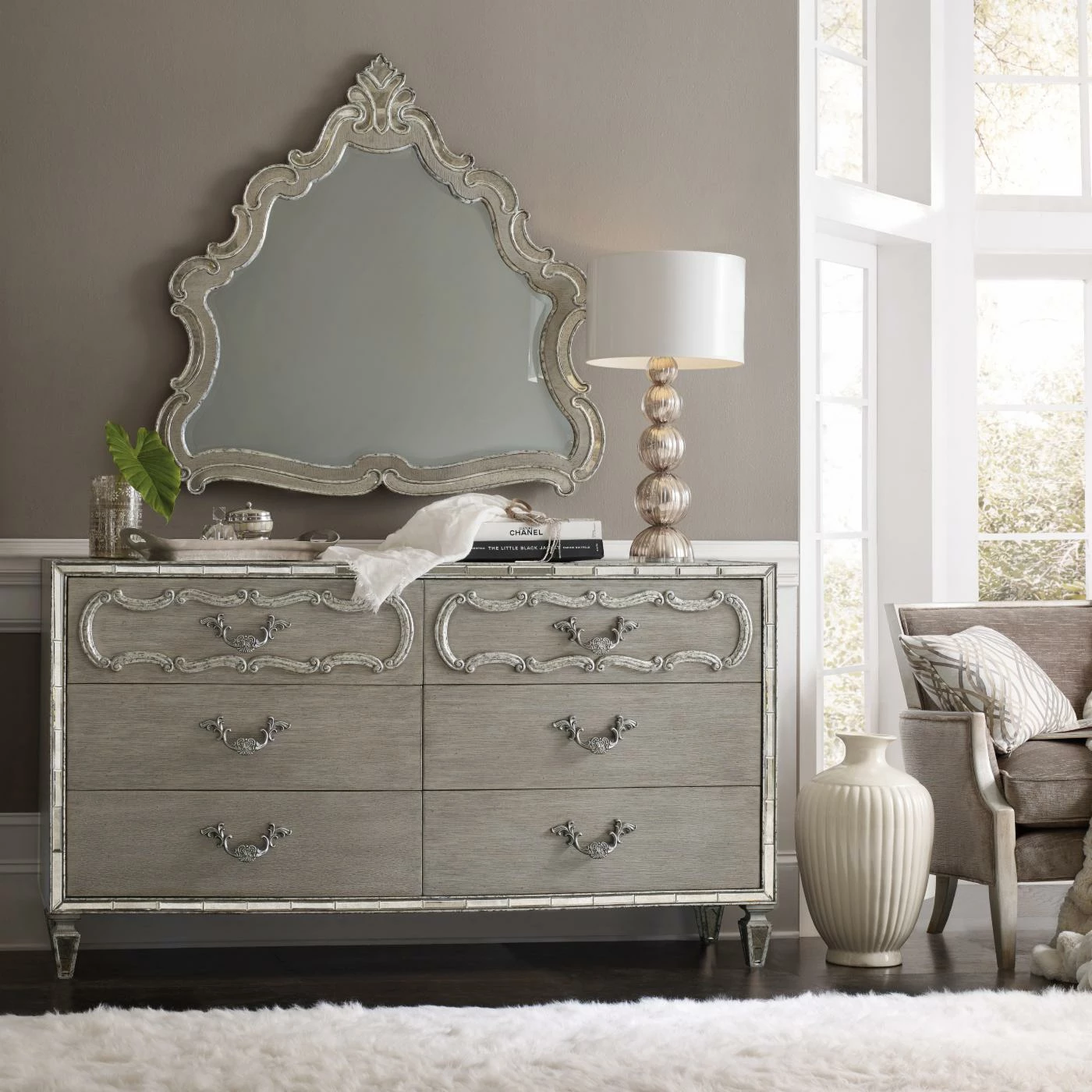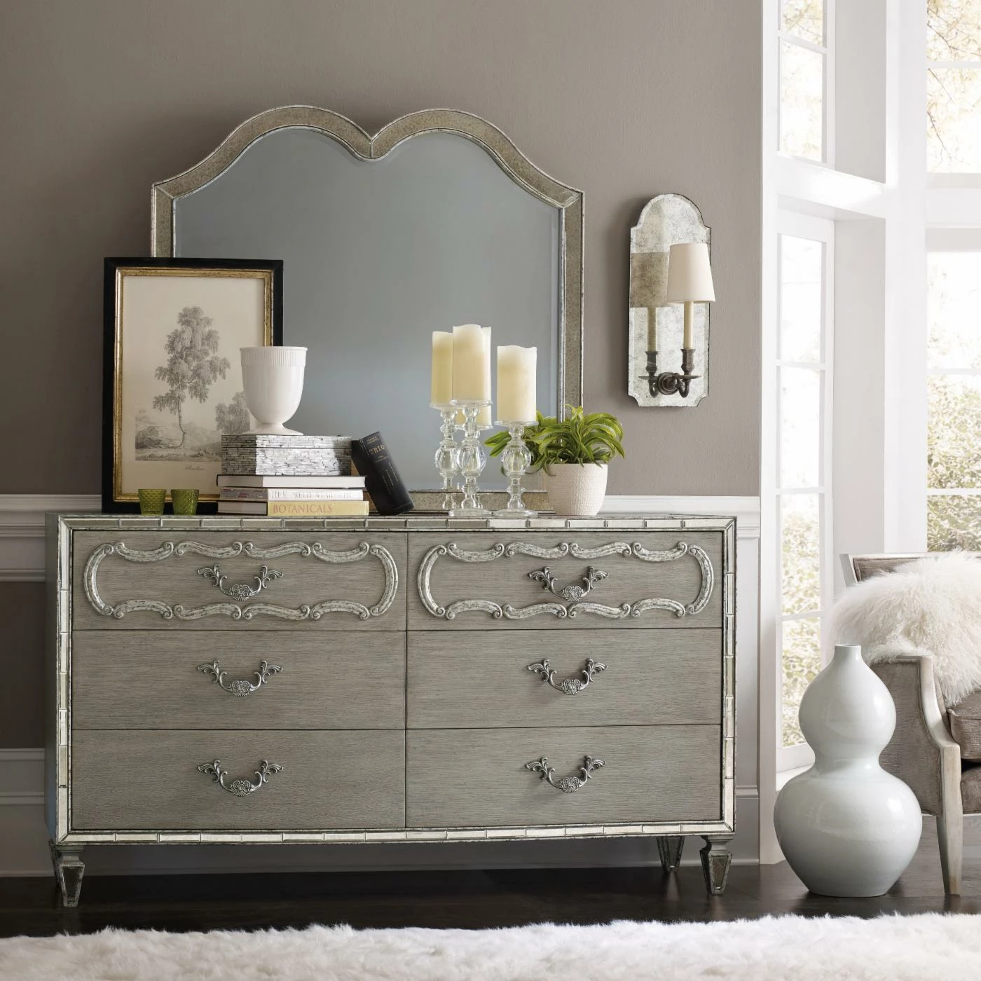 The Hooker Furniture Sanctuary 6 Drawer Dresser truly lives up to its name by providing organization and luxurious style for your bedroom sanctuary. The six pull-out drawers offer an abundance of space for your entire wardrobe and accessories. The bottom drawers are lined with cedar for a refreshing smell. A jewelry tray in the top right drawer makes picking just the right accessory for your outfit easy and the drop-in felt liner in the left drawer is perfect for necklaces, watches, or other small items that you don’t want to slide around or get scratched.