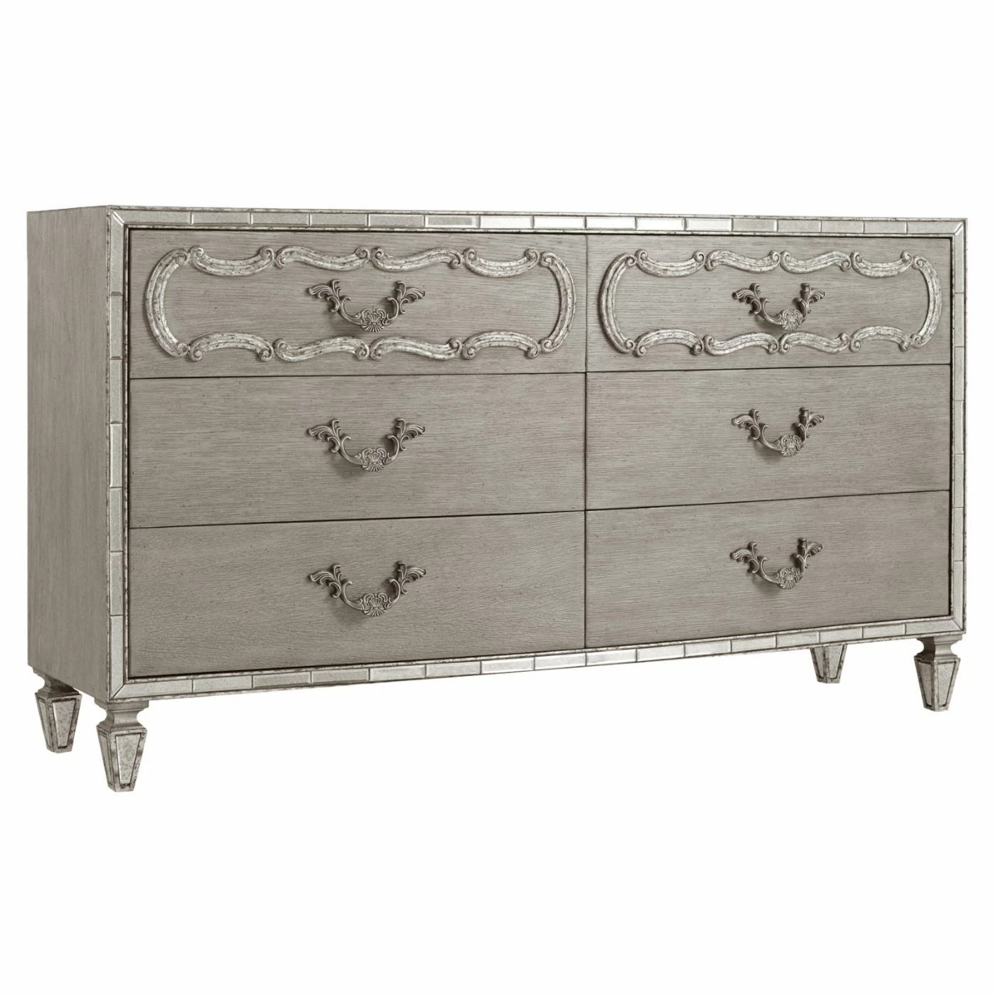 The poplar wood and hardwood solids are covered in oak veneers with a shimmering epoque greige finish. Scrolled accents, a frame of mirrored panels, and ornate drawer pulls add traditional, glamorous style to the dresser. Choose to add an available matching mirror option to complete the look.