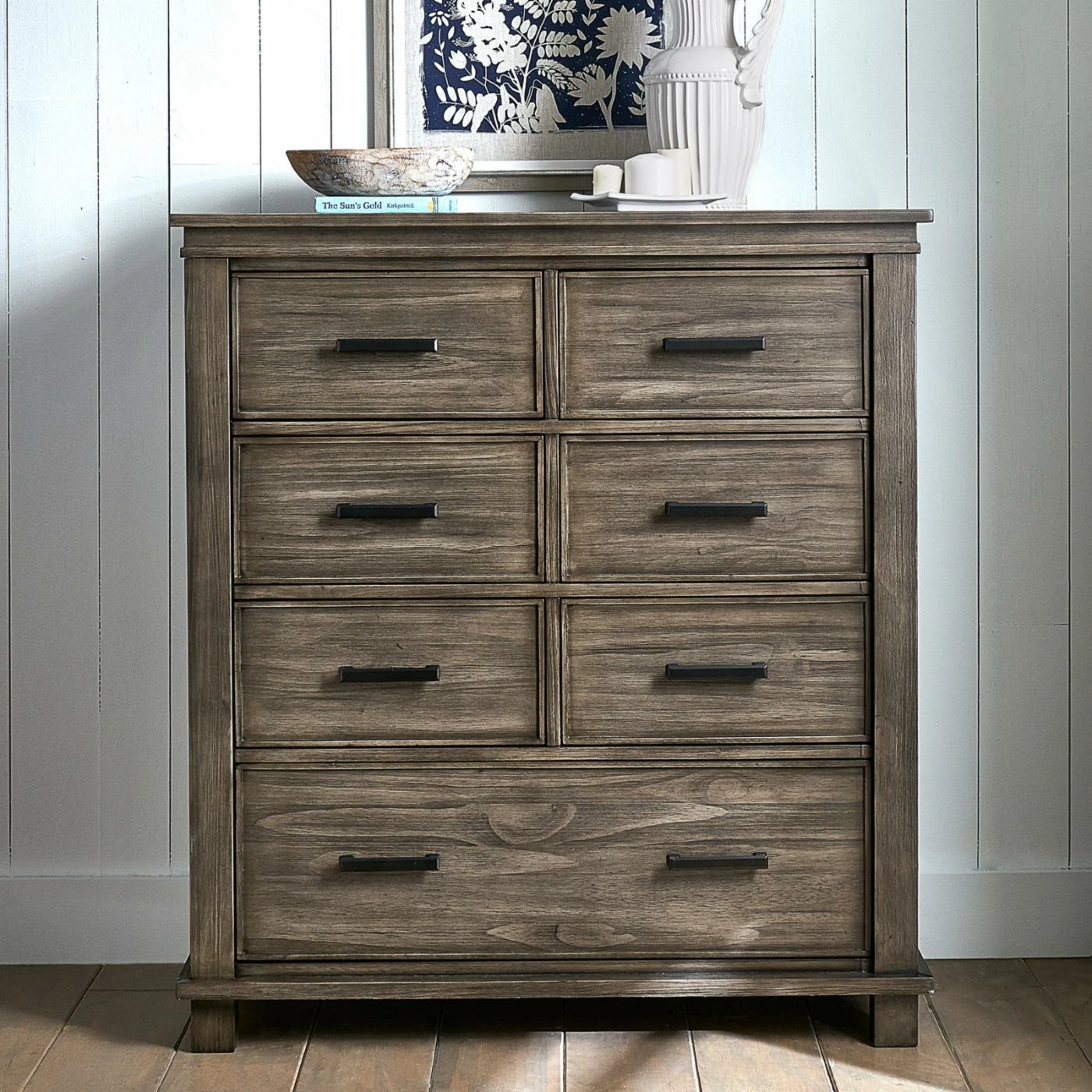 The A-America Glacier Point Chest is equipped with seven drawers for plenty of bedroom storage. This chest is constructed from New Zealand pine and finished in a versatile gray stone color. The felt-lined top drawers are perfect for delicates. The transitional style is easy to pair with your current bedroom furniture.