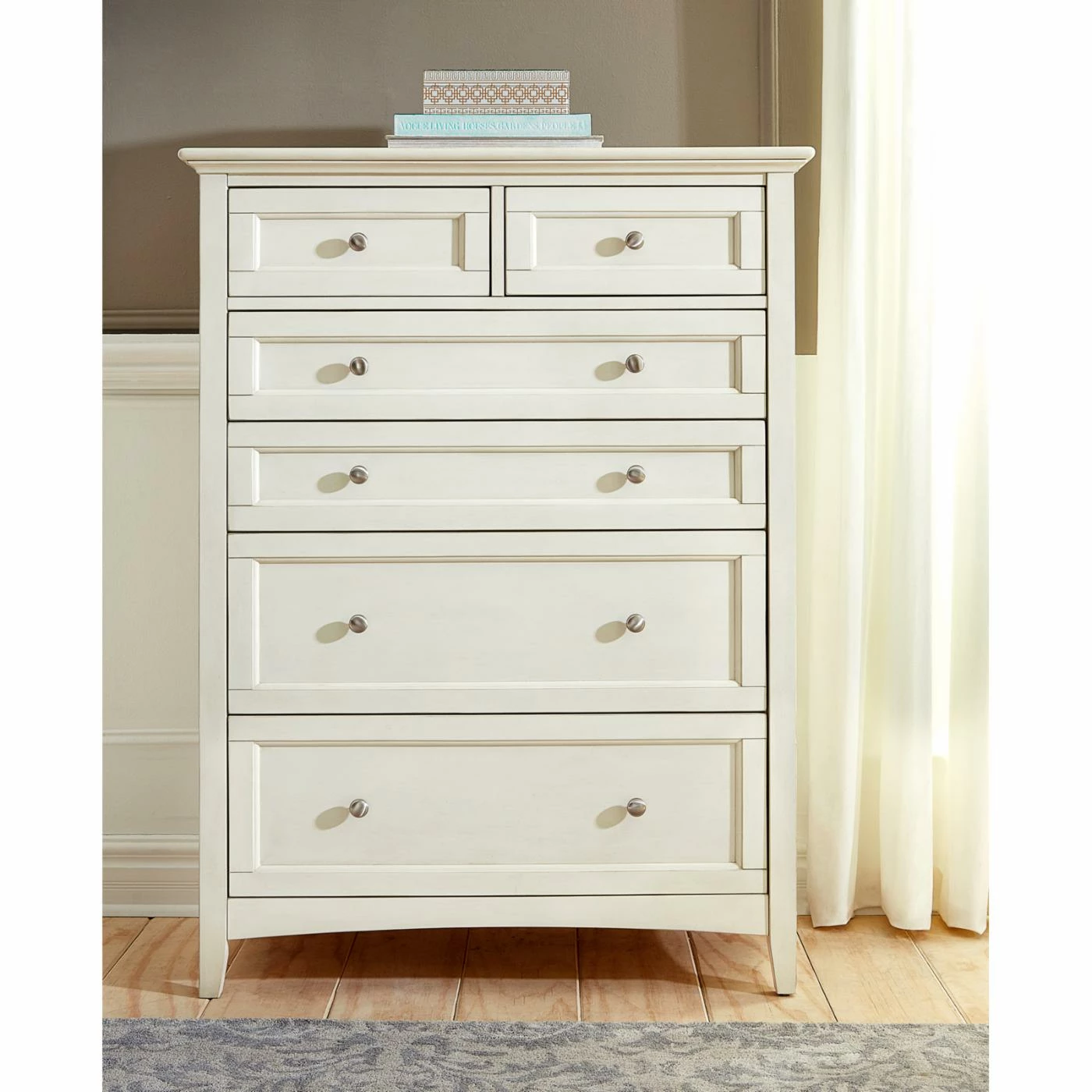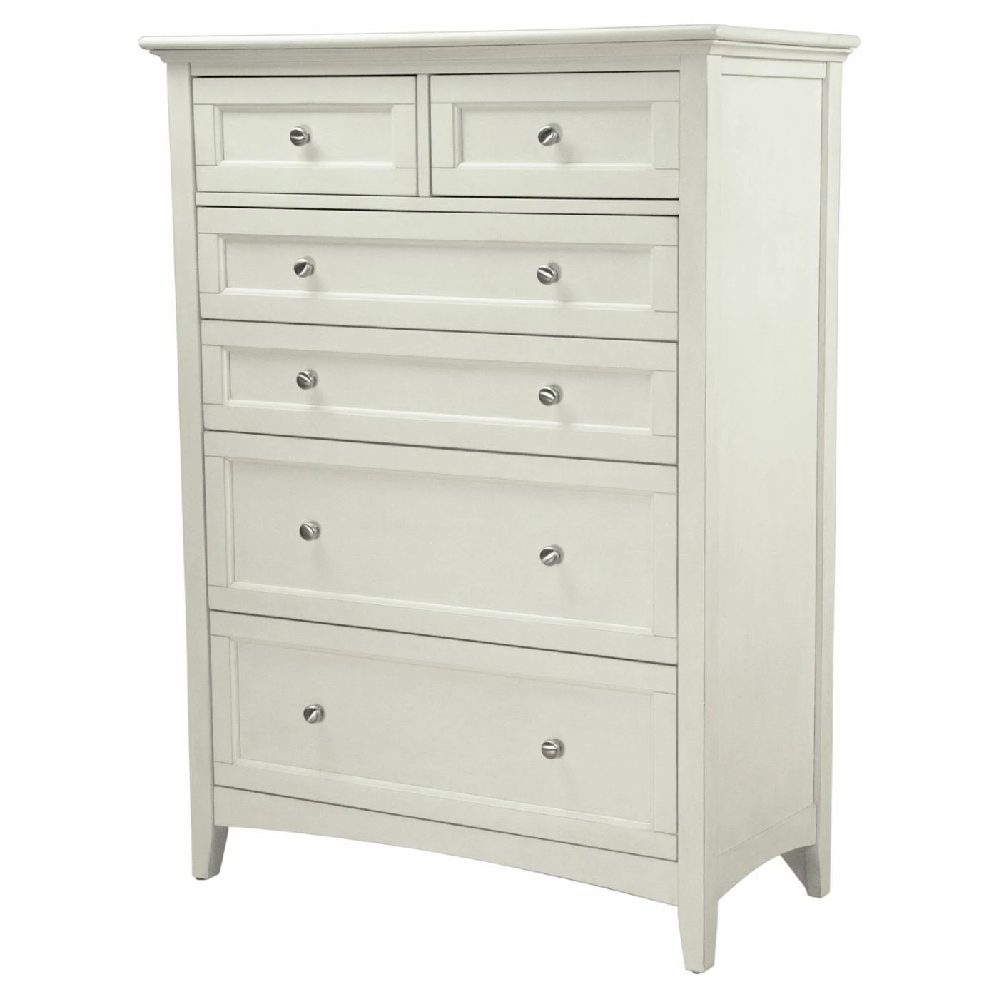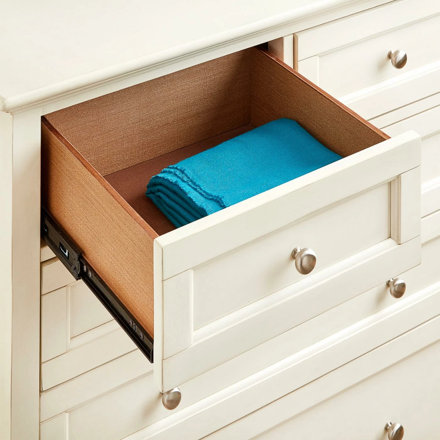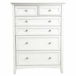 The A-America Northlake 6 Drawer Bedroom Chest completes the dreamy look of your sleep space. Crafted from kiln-dried solid rubberwood in a twelve-step white linen finish, this six-drawer chest features two large bottom drawers, two mediums-size drawers, and two side-by-side felt-lined drawers on top. The drawers have full English dovetail construction with corner block braces. Each drawer is fitted with full extension metal drawer glides for super smooth opening and closing. The drawer face edges are sanded to lend light distressing while round metal drawer knobs in a brushed nickel finish complete the look. This 6-drawer bedroom chest requires some simple assembly and is covered by a manufacturerβs limited 1-year warranty.