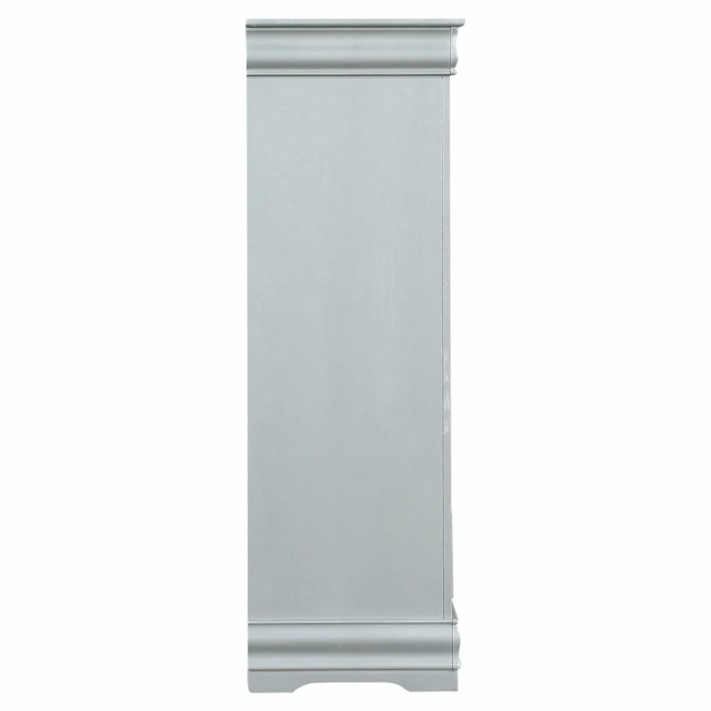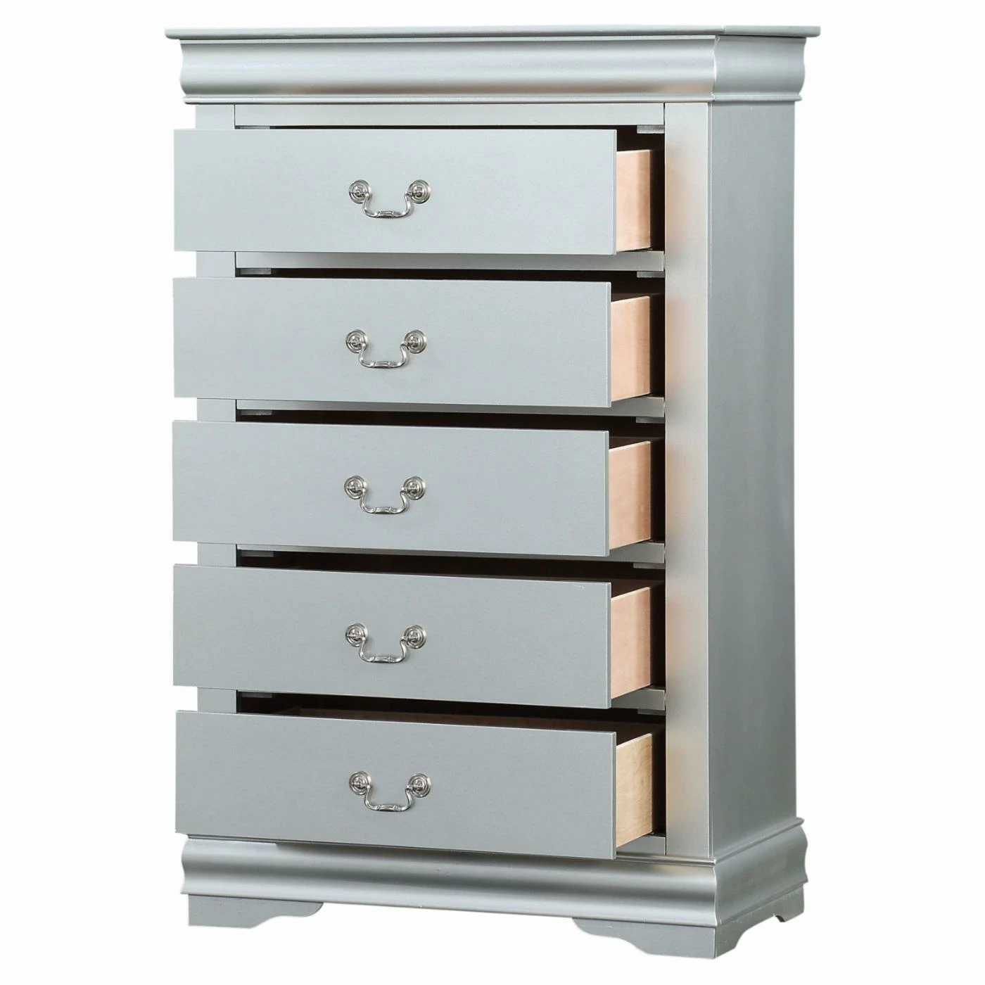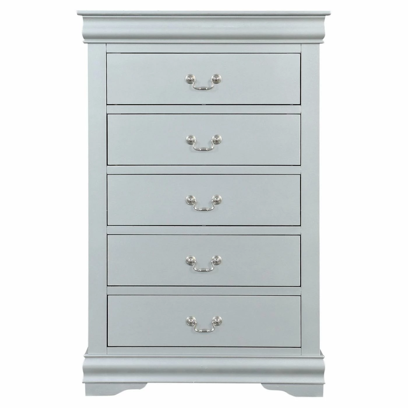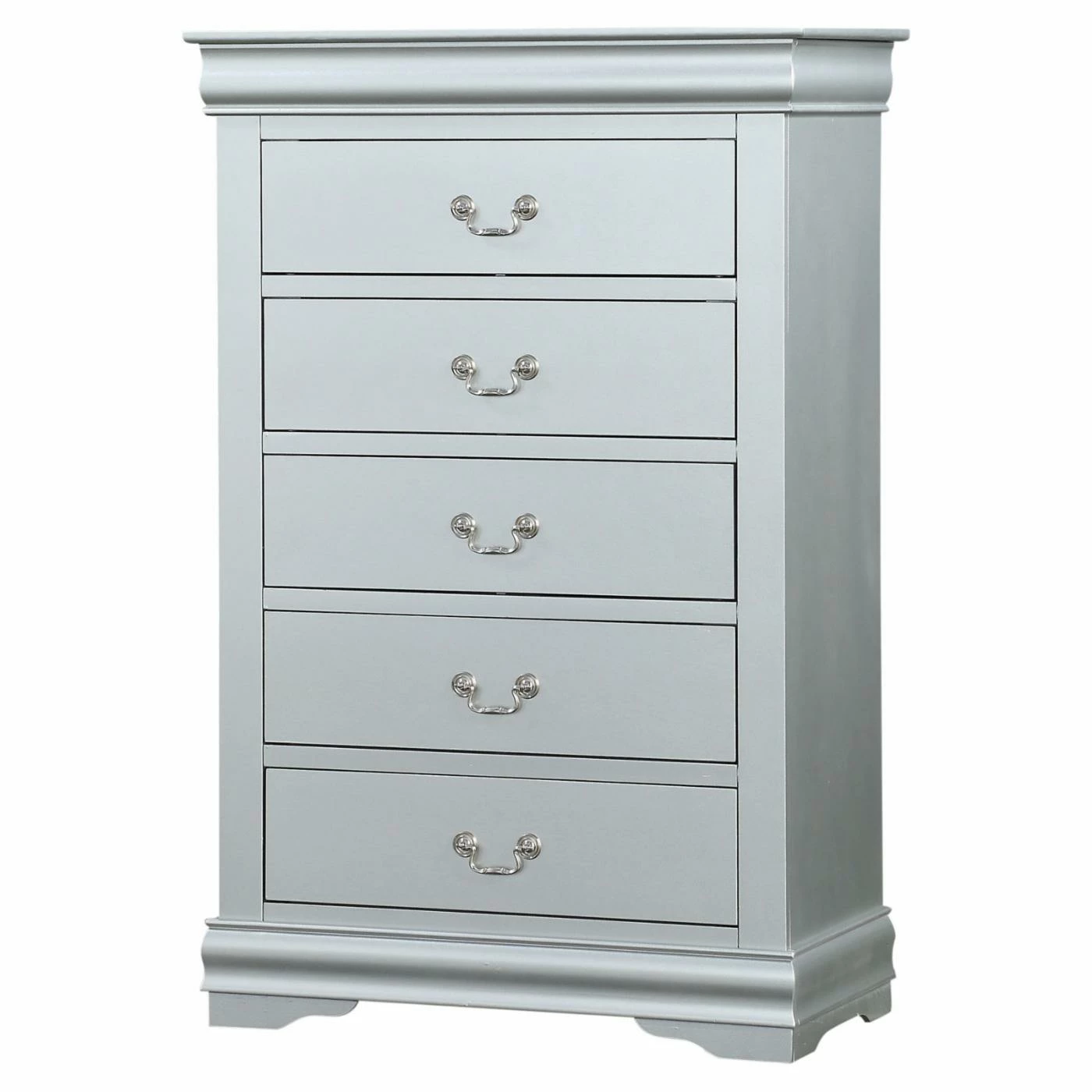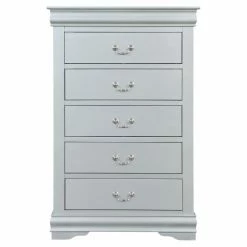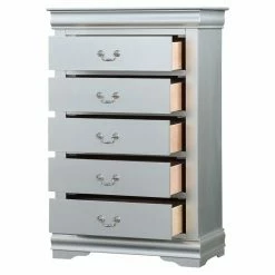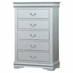 Store clothing and accessories in elegant timeless style with the Acme Furniture Louis Philippe III 5 Drawer Chest. This traditional solid and engineered wood chest provides five drawers equipped with metal center glides and sophisticated scrolled metal handles. For a shimmering touch, the gum wood veneers on the chest feature a platinum silver finish.