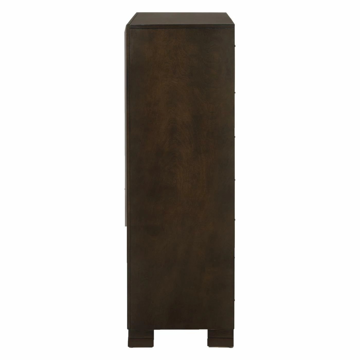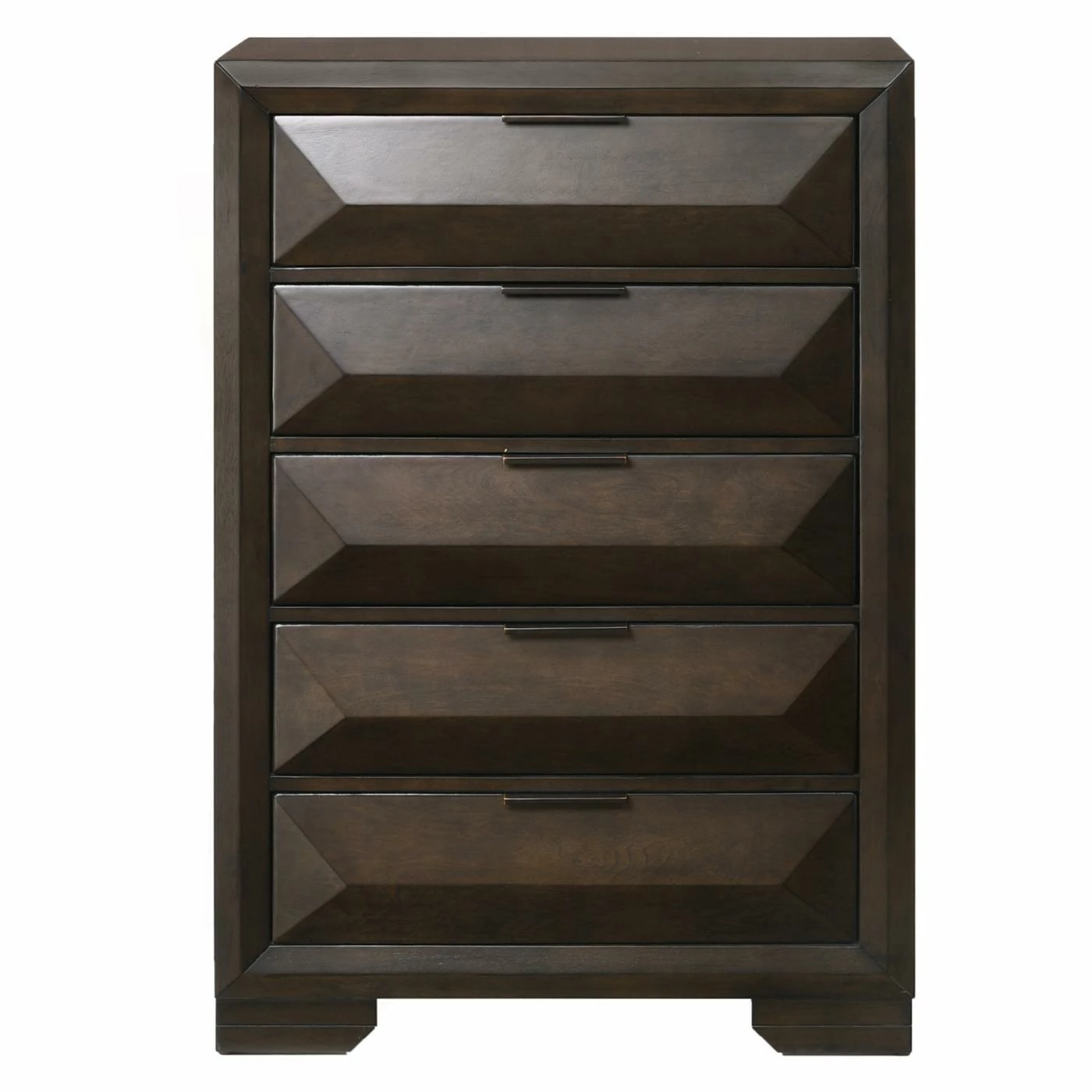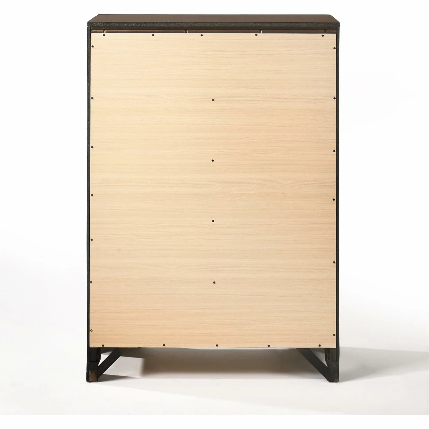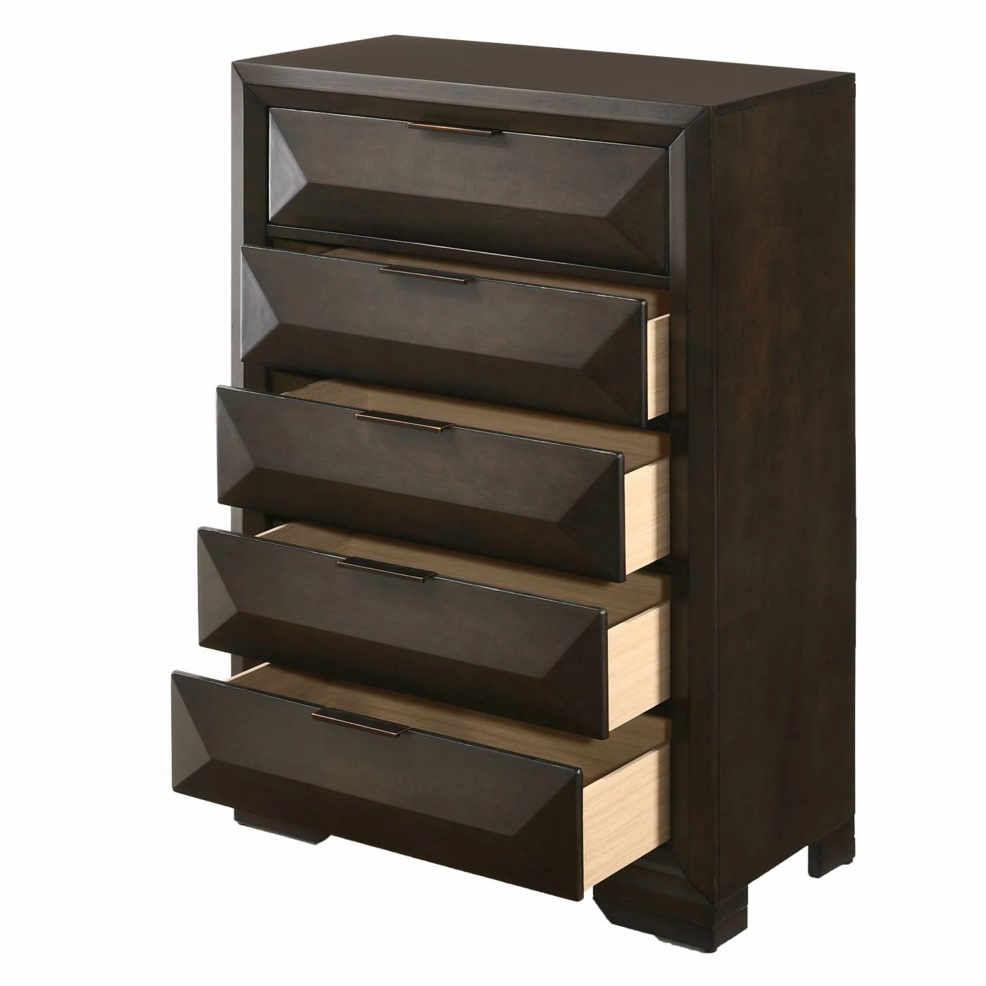 The Acme Furniture Merveille 5 Drawer Chest adds much needed storage space to your bedroom. Crafted from rubberwood and wood veneers, it comes in a rich espresso finish that will complement most dΓ©cor styles. Five spacious drawers on metal drawer glides provide plenty of space for clothes, blankets, and more. The top drawer is lined with felt.