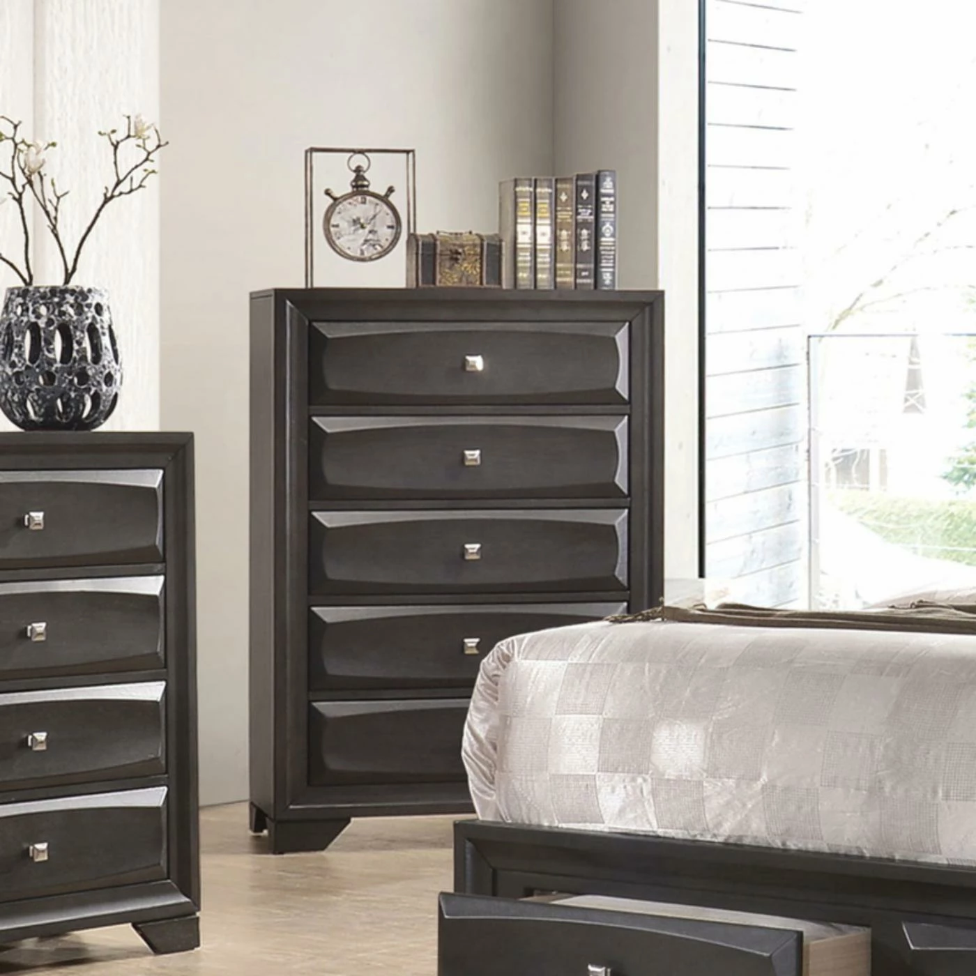 Add stylish storage to your bedroom with the Acme Furniture Soteris 5 Drawer Chest. This transitional dresser features durable wood construction, and offers five spacious drawers supported on side mounted metal glides. Square metal knobs complete the contemporary design.