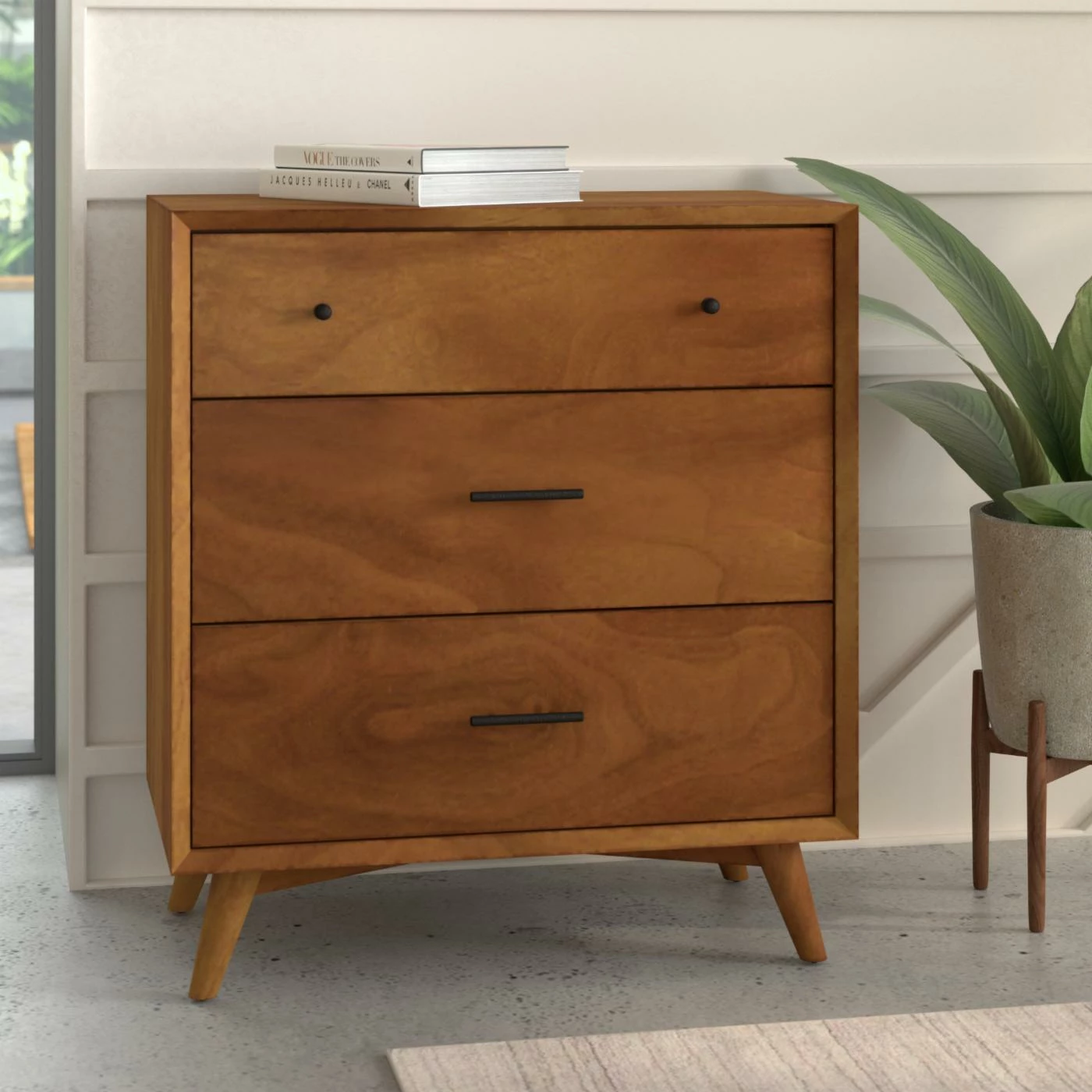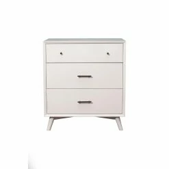 Organize your bedroom in retro style with the Alpine Furniture Flynn 3 Drawer Chest. Three spacious drawers, boasting French and English dovetail construction, offer a wealth of space for books, clothing, or other belongings you need to keep tidied up. The top drawer features two knobs and a felt lining, and the bottom two drawers feature a single centered drawer pull, all complementing the basic mid-century styling of this chest. Four sturdy wooden legs support the solid mahogany and okoume veneer construction, available in your choice of finishes, while the ball bearing metal drawer glides allow for easy opening and closing of each drawer. The clean, tasteful lines of this chest allows it to be equally at home in your bedroom or any other room of the house.