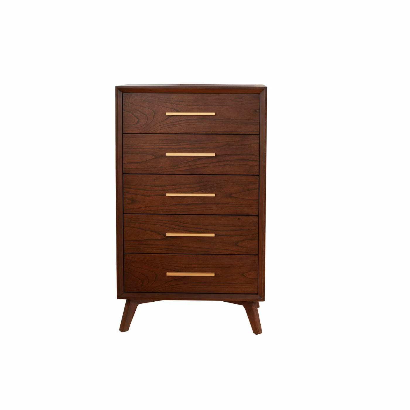 TheΒ Alpine Furniture Gramercy 5 Drawer DresserΒ is finished in brown.Β This comes fully assembled.Β The drawers are made with English dovetail construction and top drawer is felt lined.