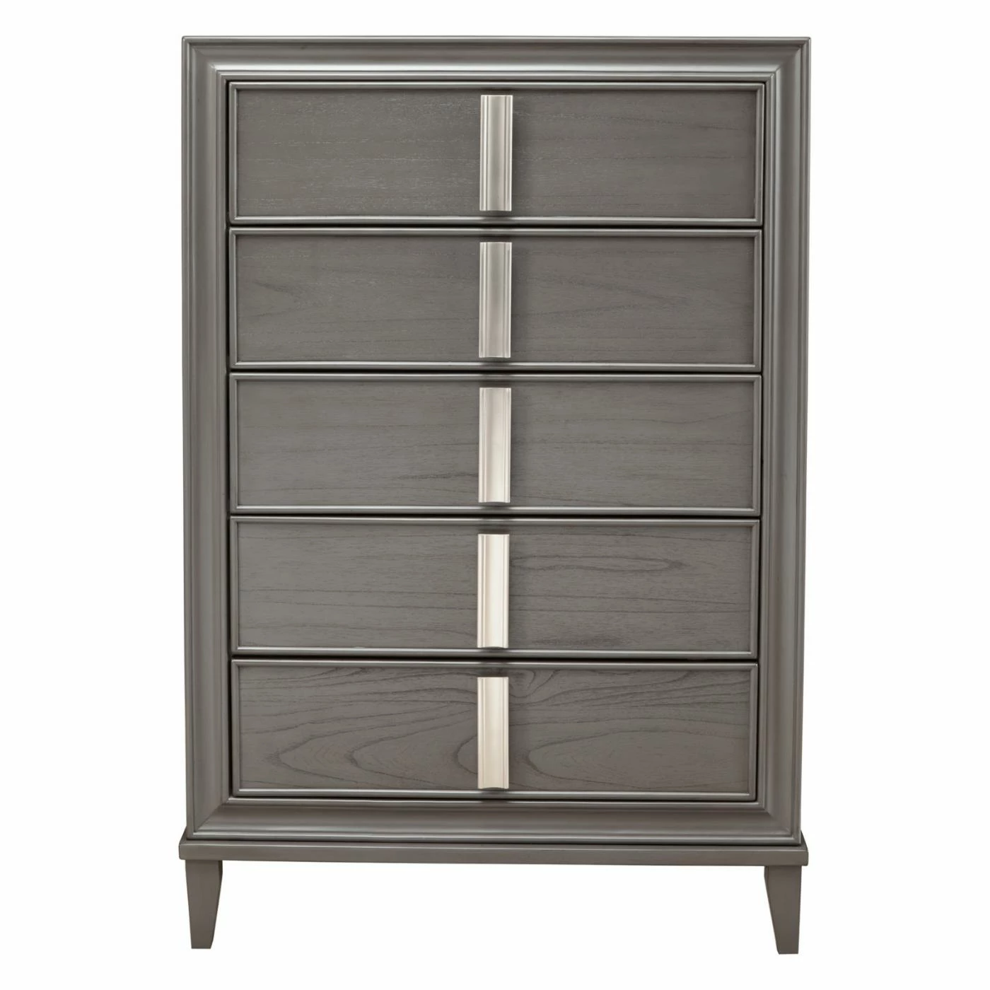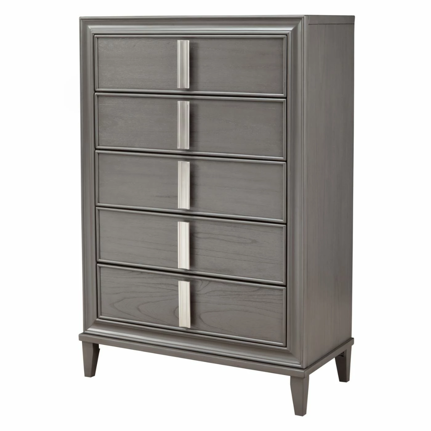 Add style and storage to your guest or master bedroom with the Alpine Furniture Lorraine 5 Drawer Chest. Constructed of solid and engineered wood, this chest is in a sleek, dark gray finish. Five drawer provide ample storage for your clothes and other belongings. Each drawer has a vertical drawer pull in a silver finish for added visual interest. Some assembly required. Pair this piece with other Lorraine items by Alpine Furniture on Hayneedle.com to create a cohesive look.