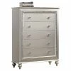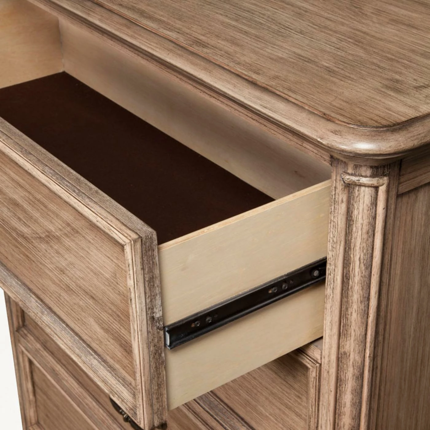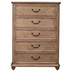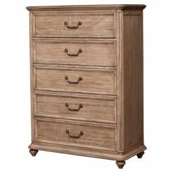 Casual elegance and ample storage make the Alpine Furniture Melbourne 5 Drawer Chest a natural choice for your bedroom. This chest is loaded with five generous drawers and the top drawer is felt-lined to protect delicates. Drawers are crafted to last and feature English and French dovetail construction plus smooth ball bearing metal glides. Classic design features include picture frame drawer moldings, turned bun feet, and decorative metal bail pulls. This chest is constructed from plantation-grown mahogany solids and okoume veneers in a French truffle finish with light wire brushing.