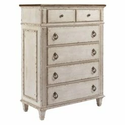 You could comb through dozens of antique shops and not find a chest as perfect as the American Drew Southbury 5 Drawer Chest. Inspired by European country homes, this chest features an antiqued chipped paint finish with a glaze cover. It’s crafted of solid wood with wire-brushed oak veneers, and the fluted posts and drop-ring drawer pulls add to the vintage charm. And even though it looks antique, it’s brimming with smart updates, including soft-close guides on the drawers and adjustable levelers. Plus, the bottom drawer features a cedar lining.