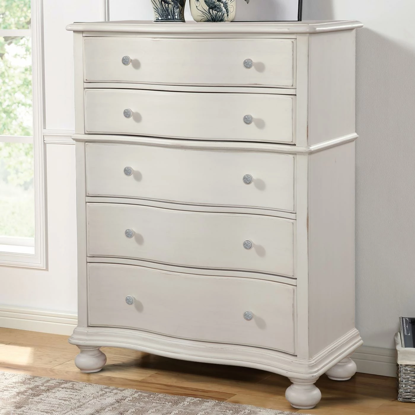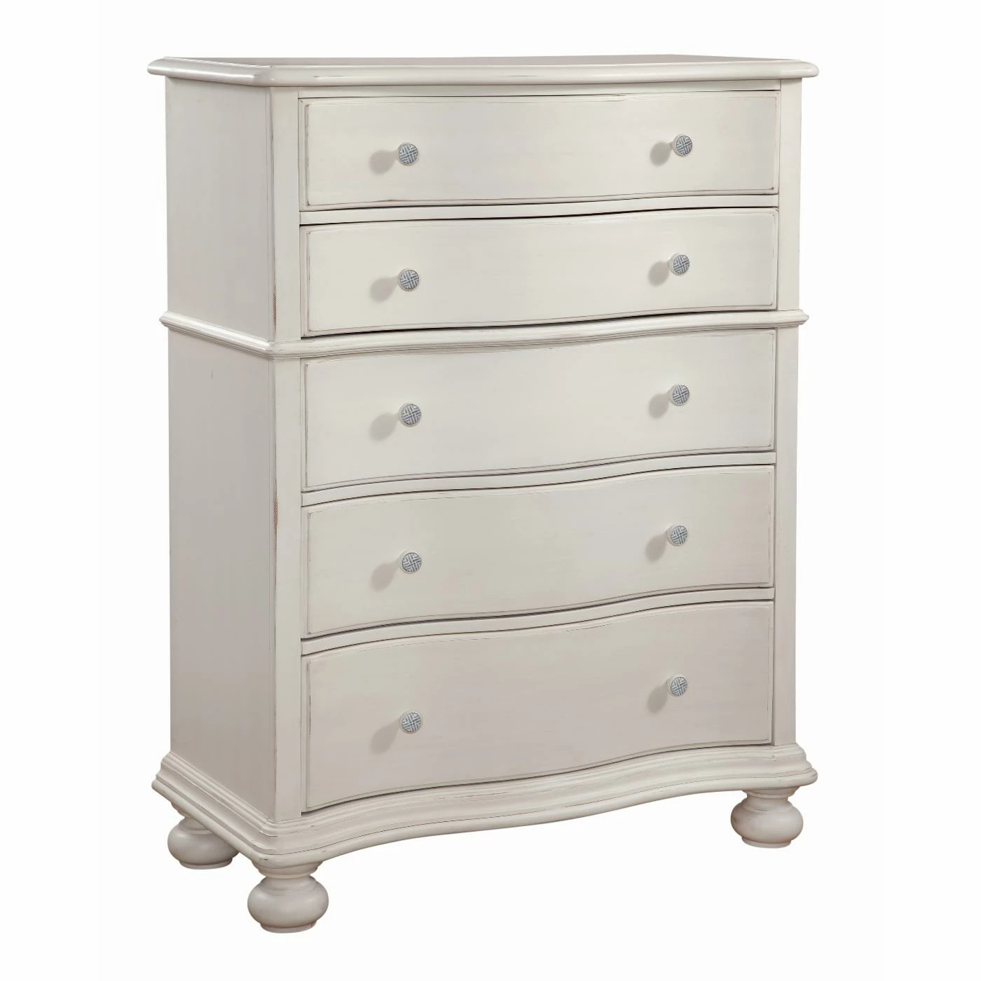 - Unique wooden knobs with white-washed pewter inset