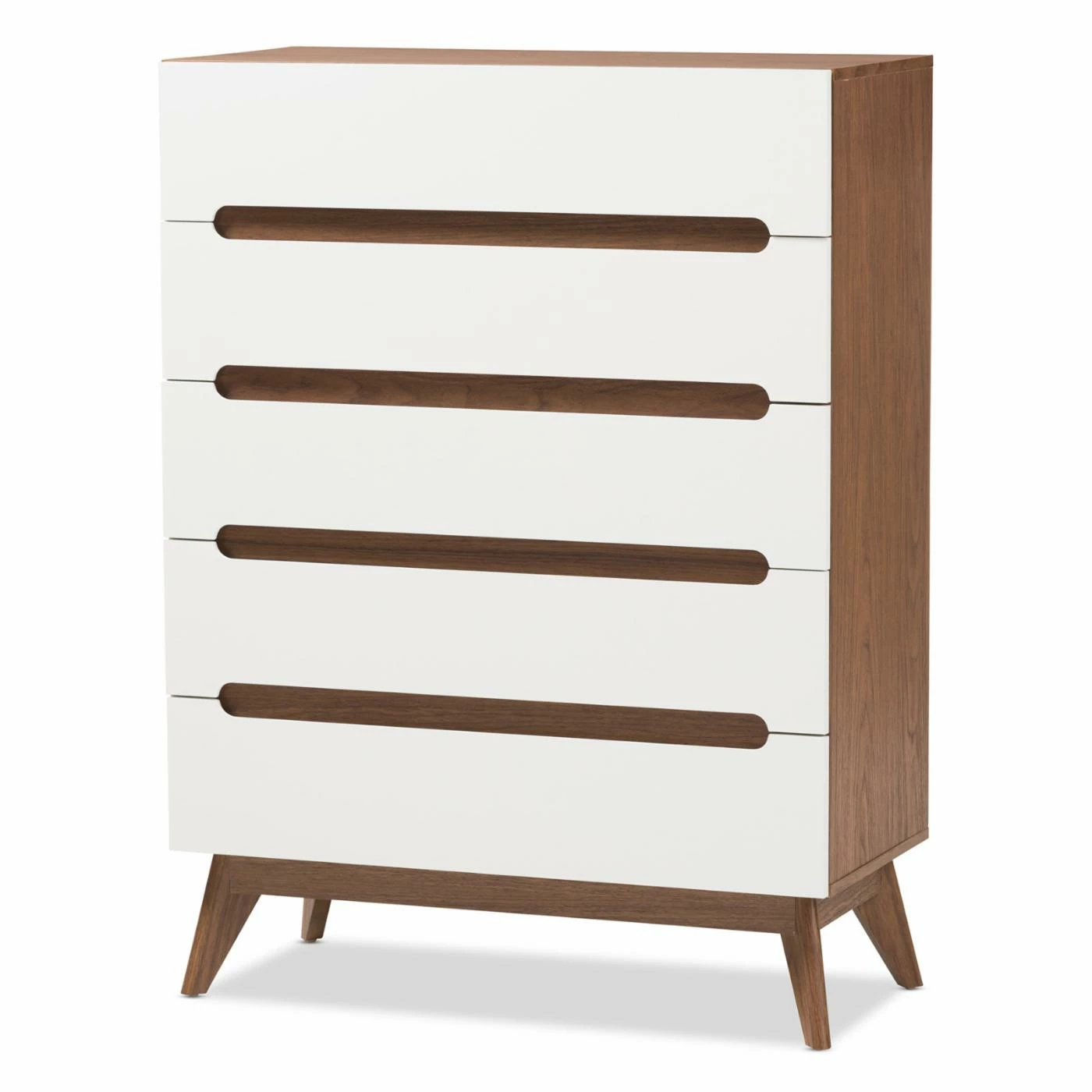 The tall design of the Baxton Studio Calypso White and Walnut Wood 5-Drawer Storage Chest will easily complete your bedroom style. Sleek cut-out handles along the white drawer fronts, combined with the angled legs and two-tone natural Walnut and white finish, enhance the mid-century design. Five large drawers provide plenty of space to store socks, undershirts, pajamas, and more. Assembly required.
