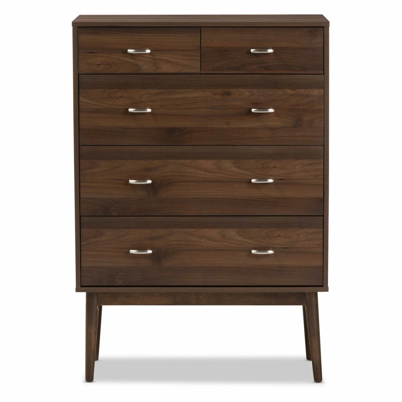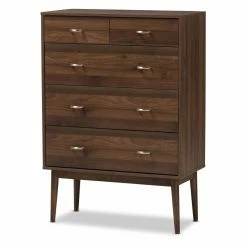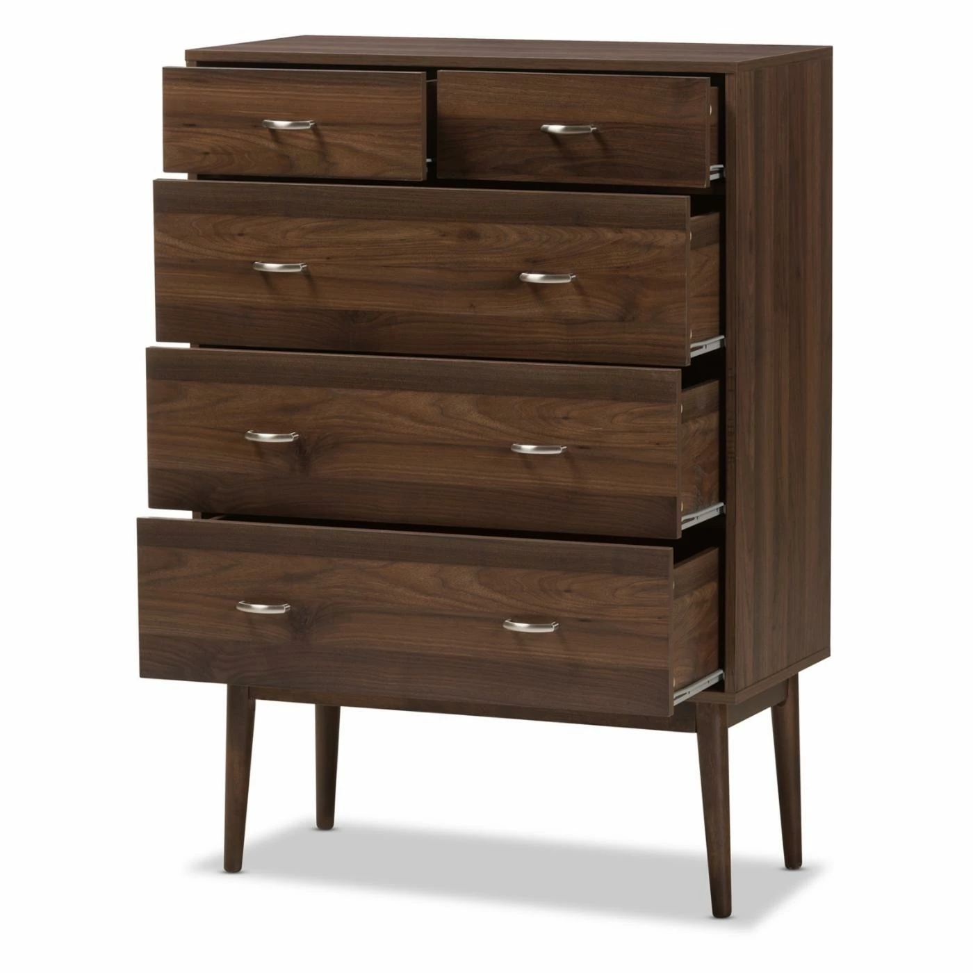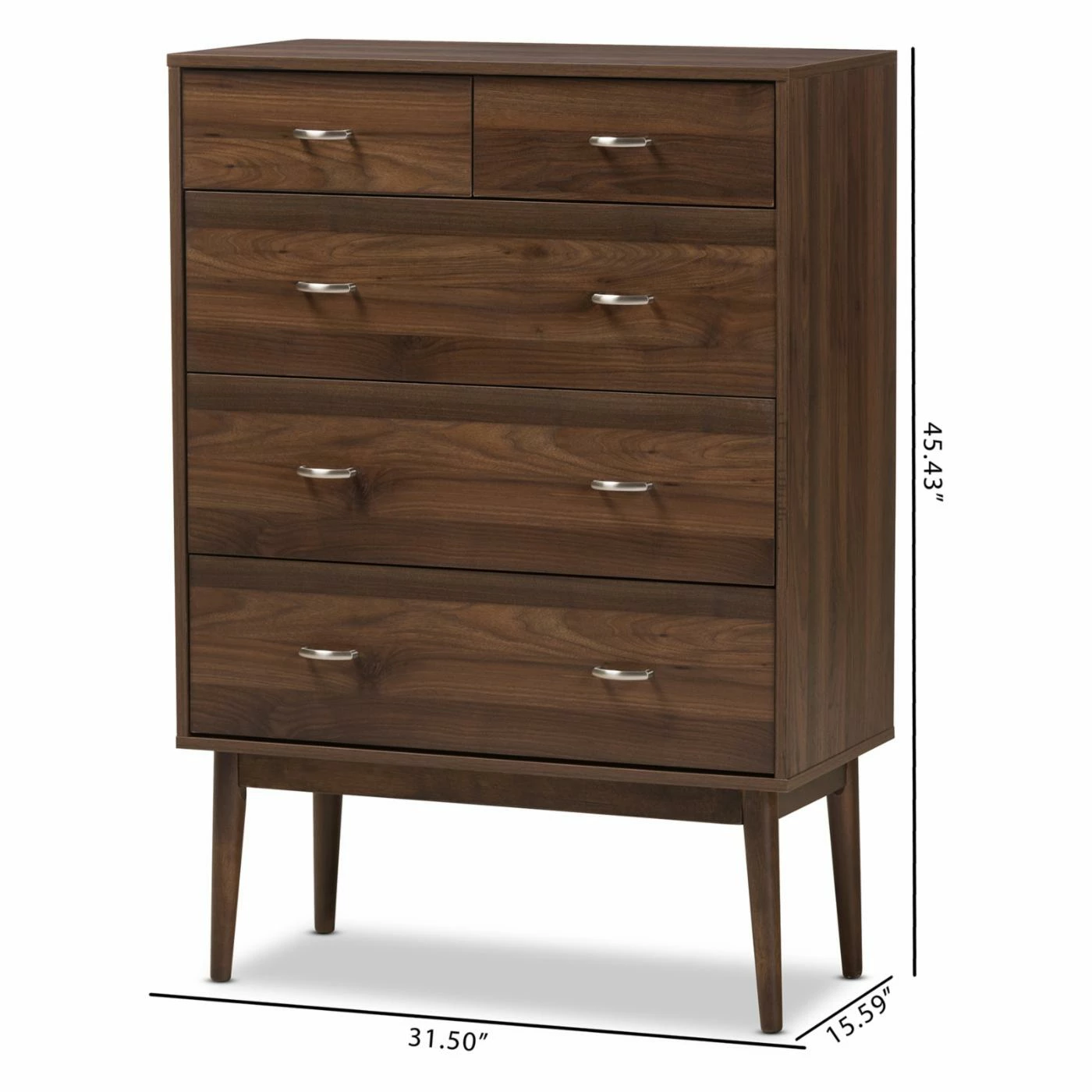 With tapered legs, a streamlined case, and sleek metal hardware the Baxton Studio Disa Mid-Century Modern Walnut Brown Finished Wood 5-Drawer Chest is ultramodern. This attractive chest is made from engineered wood in a beautiful walnut finish, and offers you plenty of storage with five drawers. The understated mid-century modern design looks good in any space.