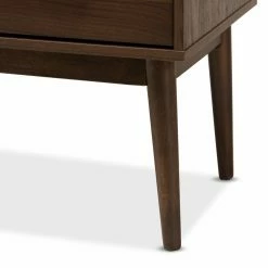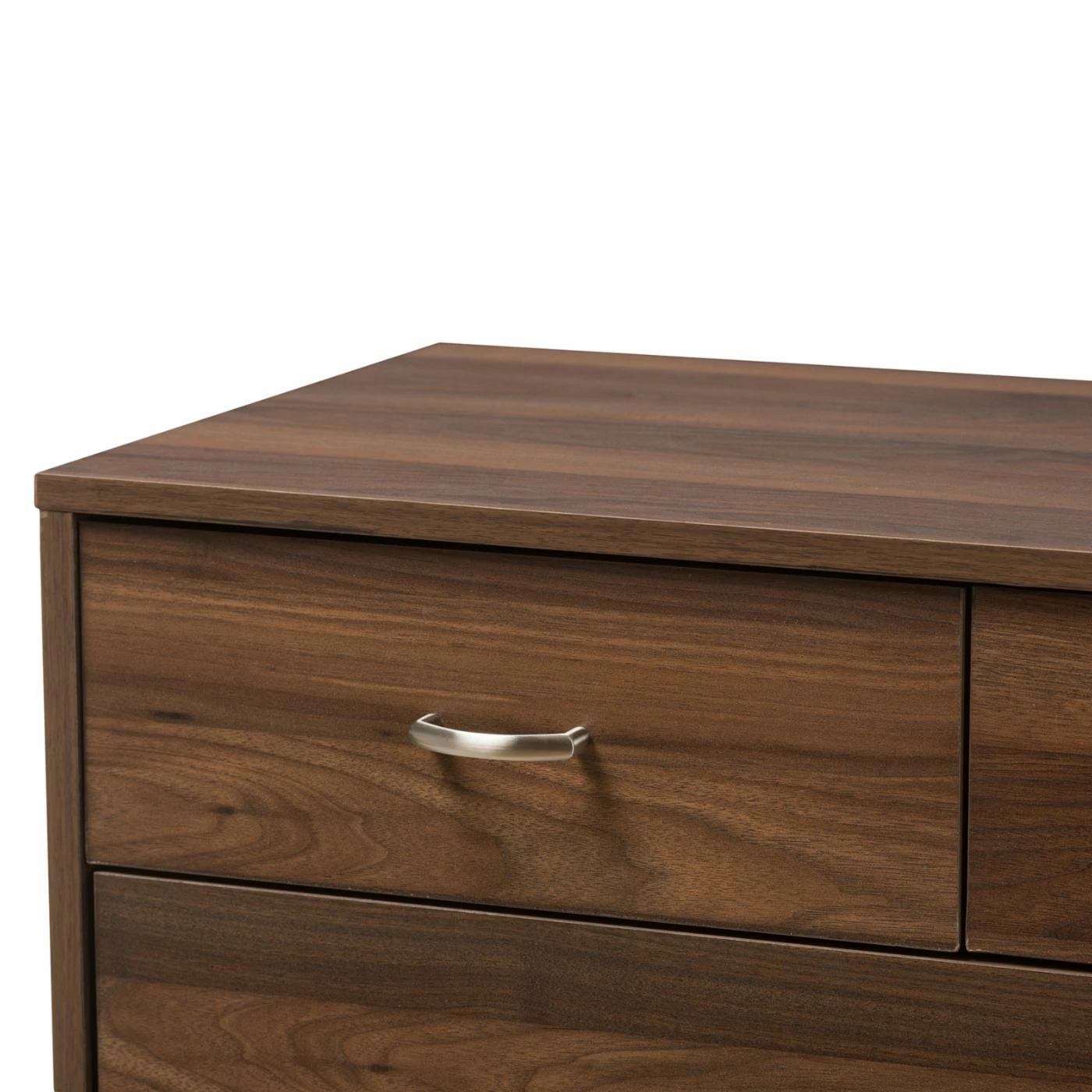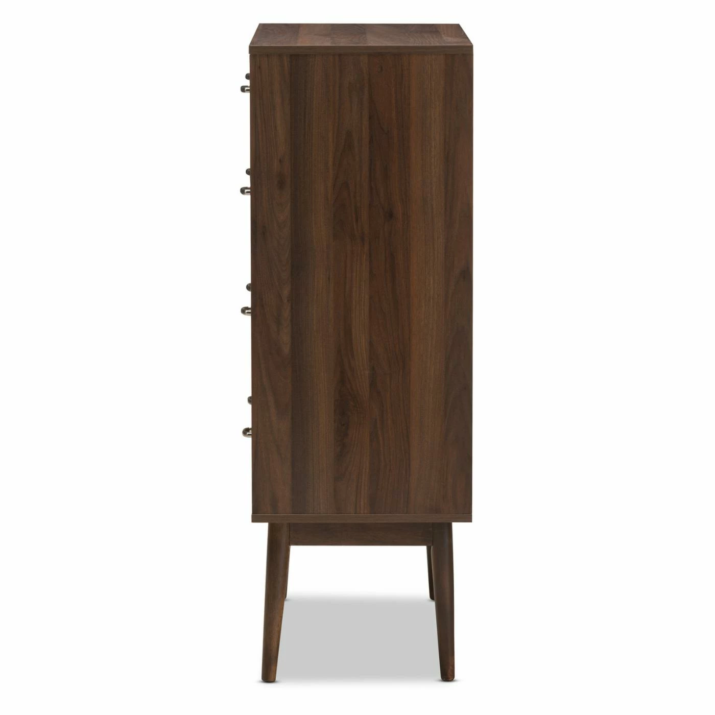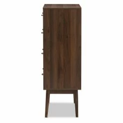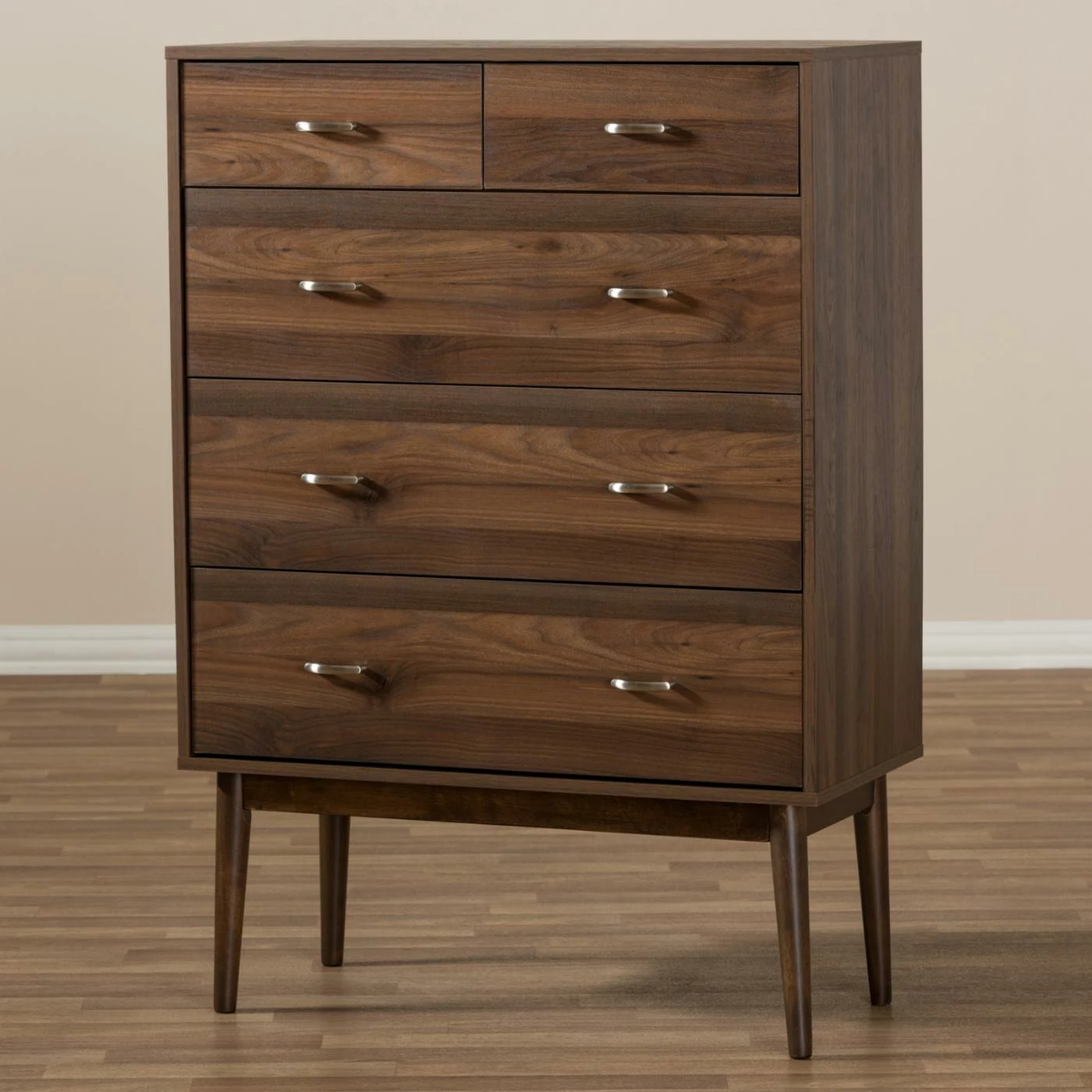 With tapered legs, a streamlined case, and sleek metal hardware the Baxton Studio Disa Mid-Century Modern Walnut Brown Finished Wood 5-Drawer Chest is ultramodern. This attractive chest is made from engineered wood in a beautiful walnut finish, and offers you plenty of storage with five drawers. The understated mid-century modern design looks good in any space.