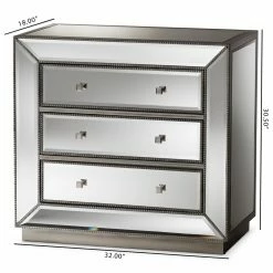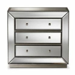 Gold-tone beaded trim and beveled mirror panels make this Baxton Studio Edeline Mirrored 3-Drawer Chest a study in glamour. This chest features three drawers with crystal clear faceted pulls and metal side glides. A plinth base offers stylish stability.