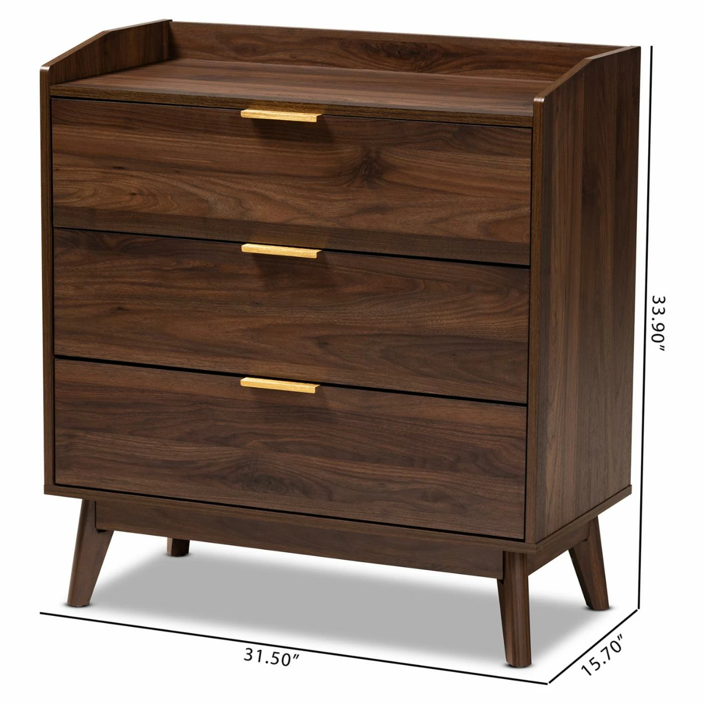 Give your bedroom a sophisticated upgrade with the Baxton Studio Lena 3 Drawer Wood Chest. This slightly retro, mid-century modern inspired piece is made from sturdy engineered wood and finished in a deep, natural walnut. Three sliding drawers give you plenty of space for socks, shirts, and anything else you might need to grab in the morning. Slanted tapered legs add to the vintage feel of this piece, while the sleek gold tab handles contribute a little extra glamour. Some assembly required.