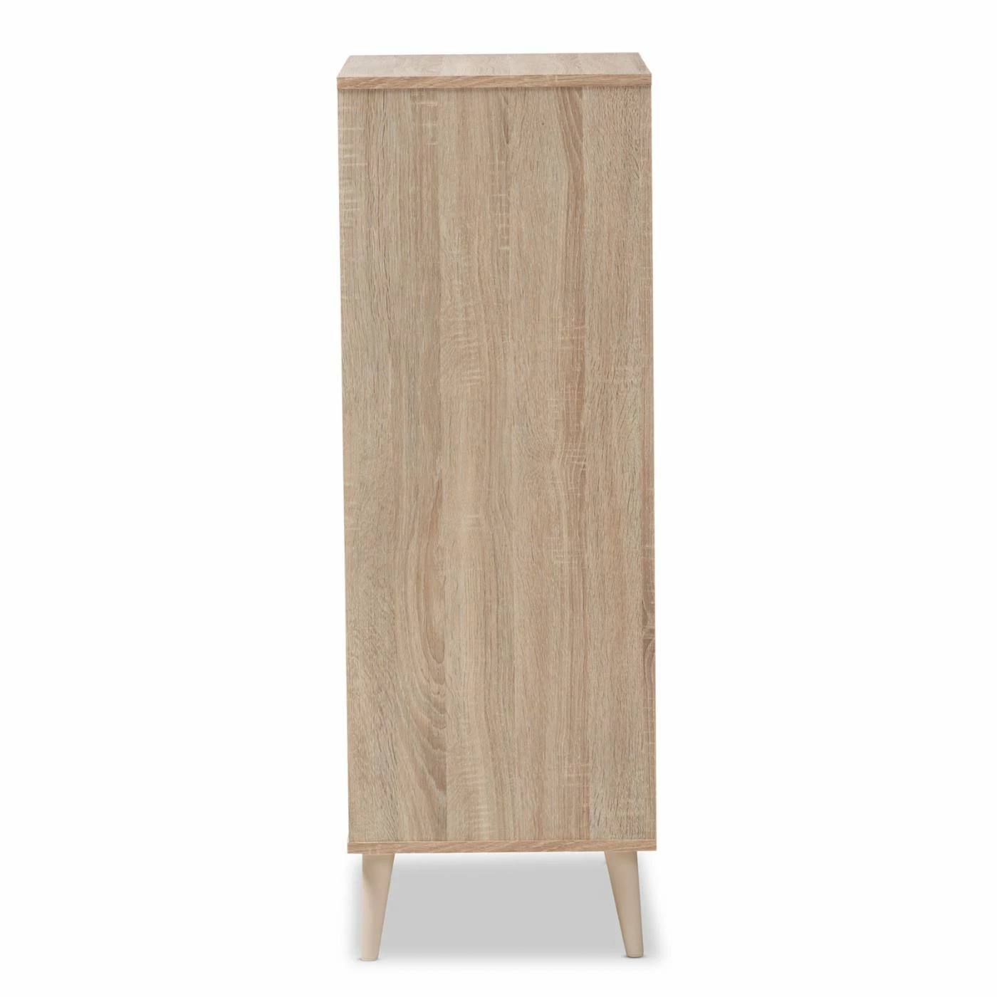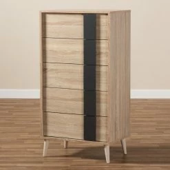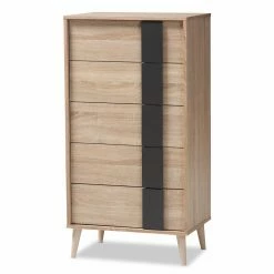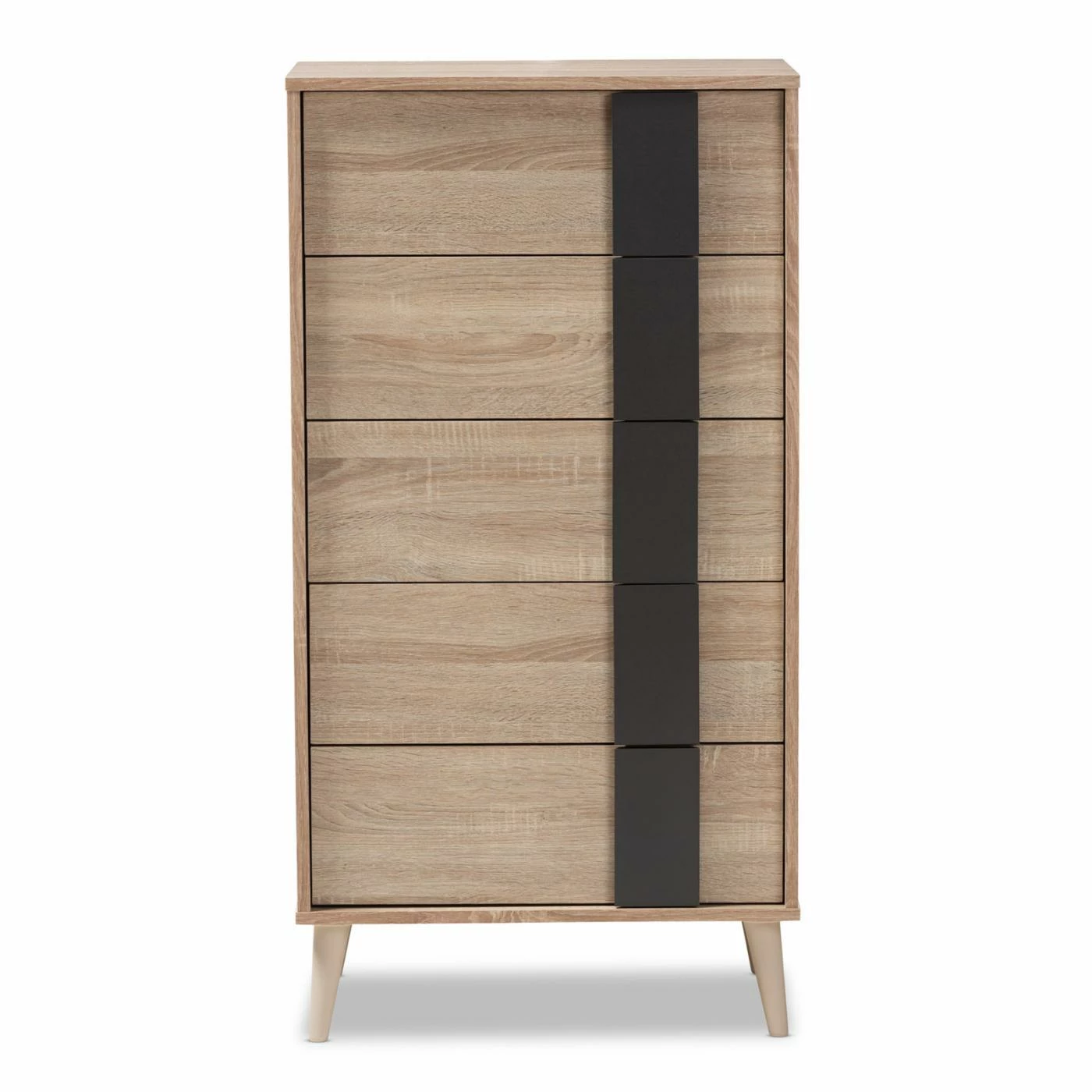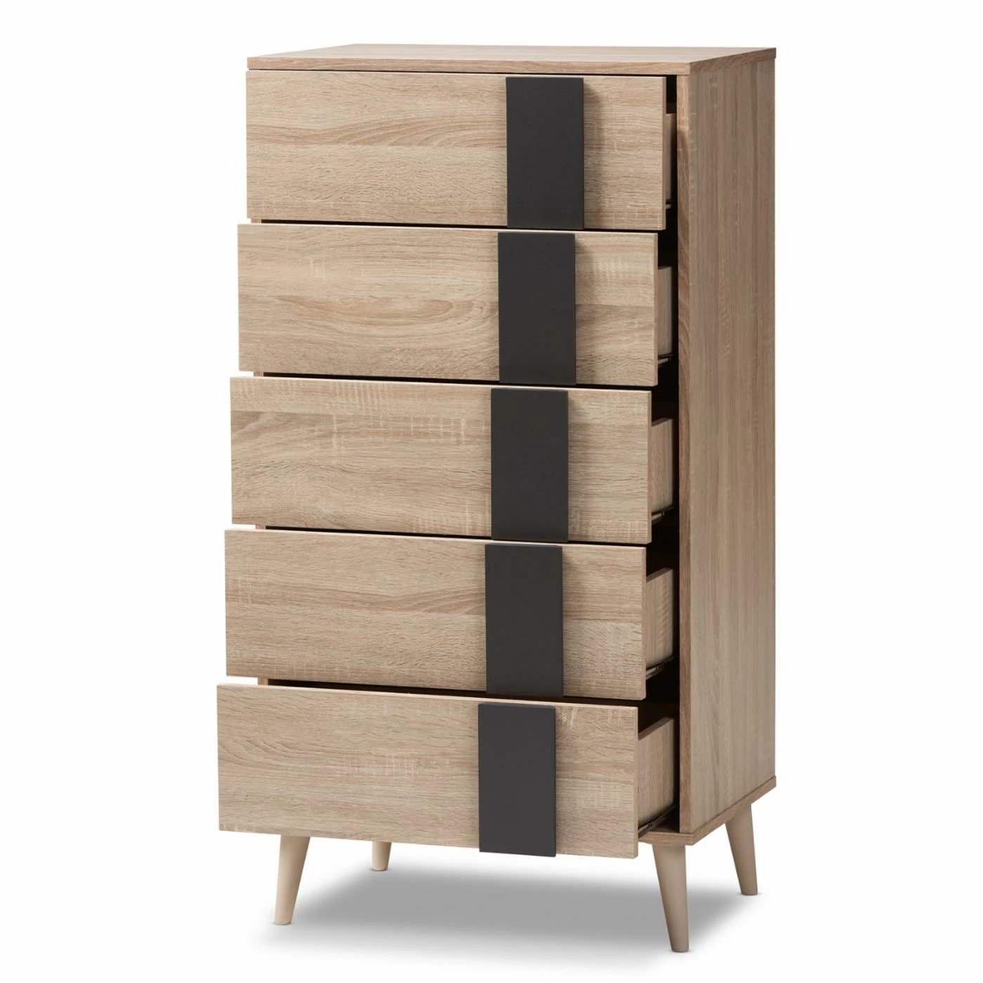 The Baxton Studio Lisen Mid-Century Modern 5 Drawer Chest brings effortless mid-century style to your home. It’s crafted of engineered wood with five inset drawers. Each of the drawers features a gray block style drawer pull for easy access. Woodgrain detail gives this chest an authentic look, while the angled tapered legs provide support.