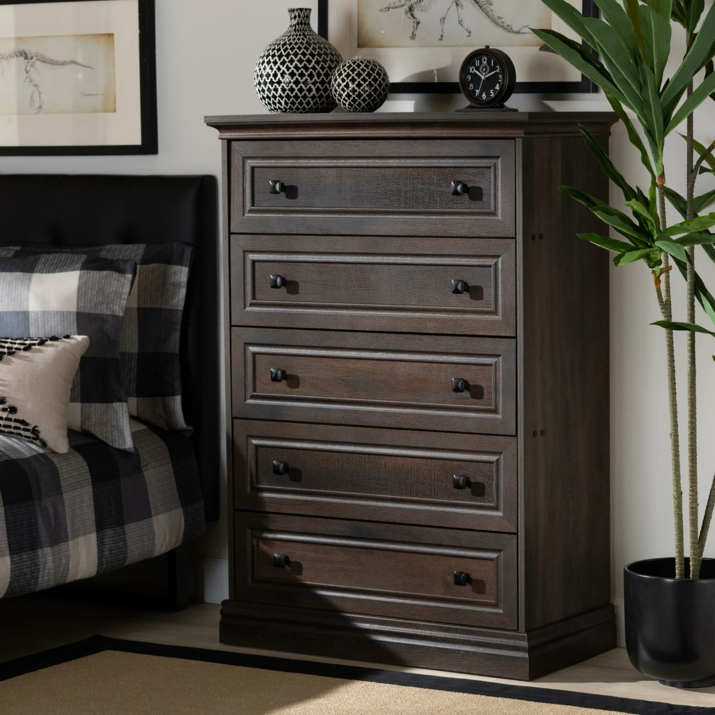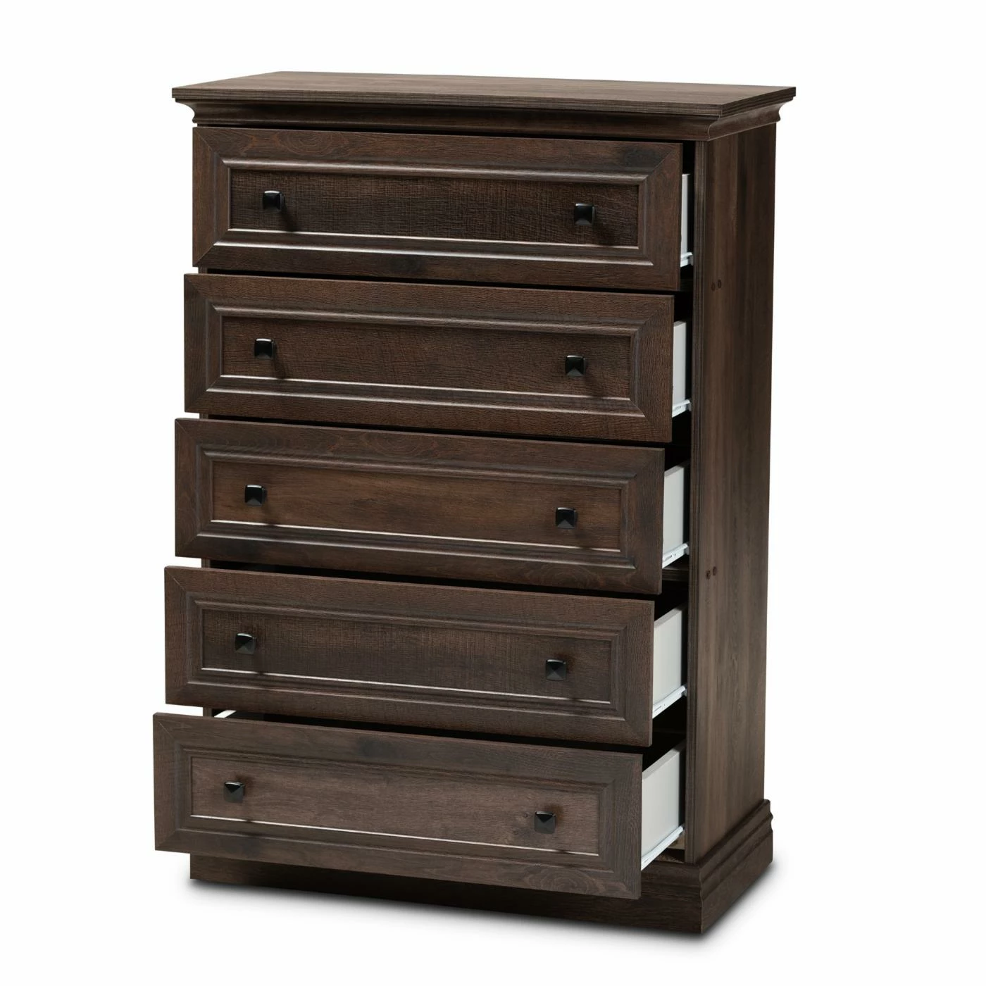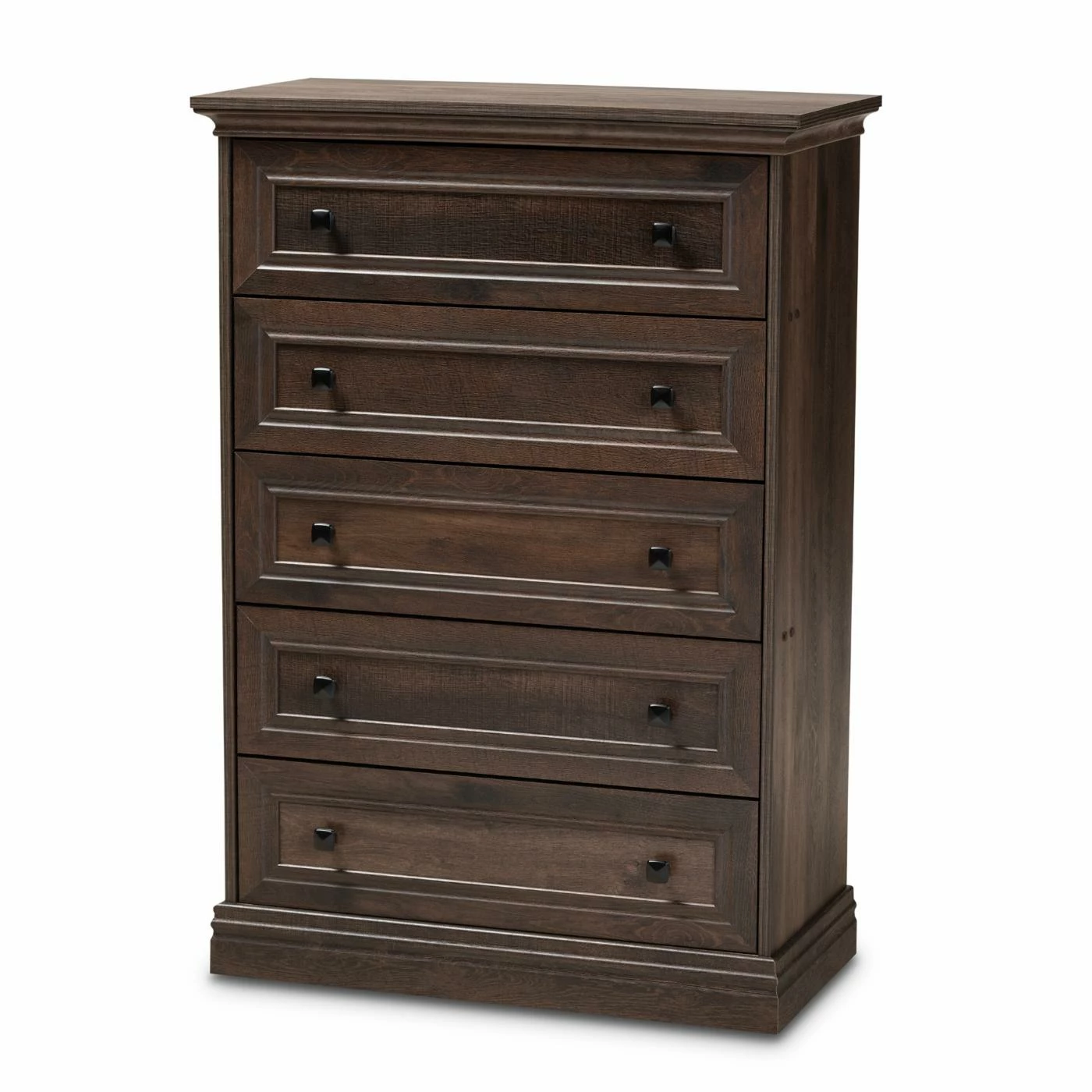 Establish an elegant aesthetic in your bedroom with the Baxton Studio Nolan 5 Drawer Traditional Bedroom Chest. Constructed from wood, the Nolan features five spacious drawers with ample space to store clothes, undergarments, and more. Its handsome hazel walnut finish and paneling give the piece a classic look thatβs always in style, while black square knobs lend a modern touch. Pair this chest with the Nolan nightstand to complete the look. The Nolan chest is made in Malaysia and requires assembly.