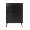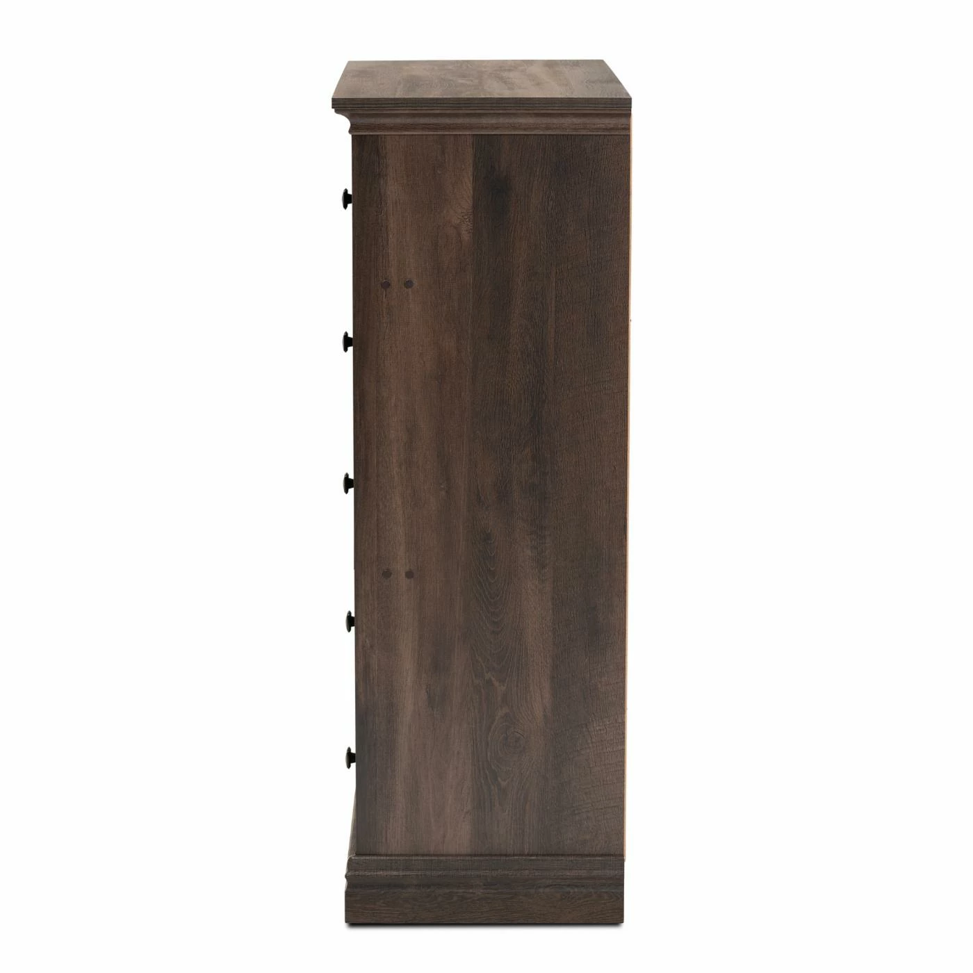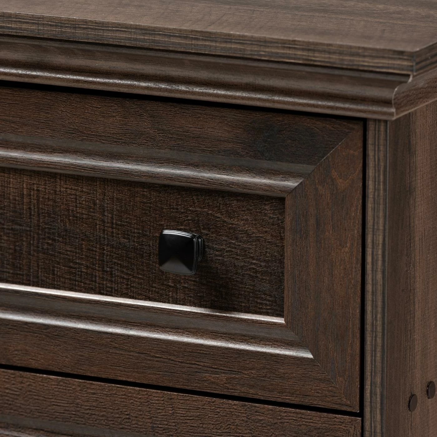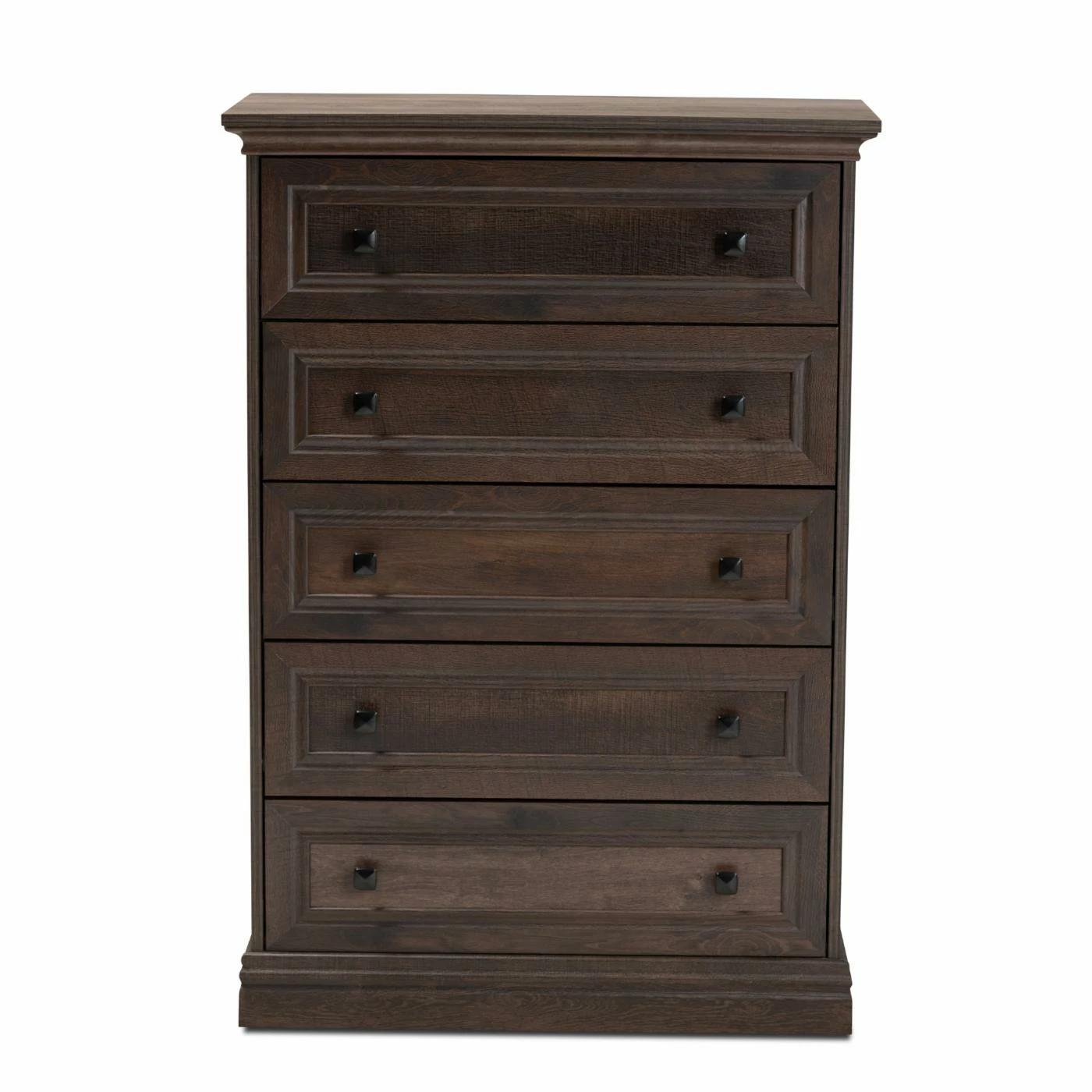 Establish an elegant aesthetic in your bedroom with the Baxton Studio Nolan 5 Drawer Traditional Bedroom Chest. Constructed from wood, the Nolan features five spacious drawers with ample space to store clothes, undergarments, and more. Its handsome hazel walnut finish and paneling give the piece a classic look thatβs always in style, while black square knobs lend a modern touch. Pair this chest with the Nolan nightstand to complete the look. The Nolan chest is made in Malaysia and requires assembly.