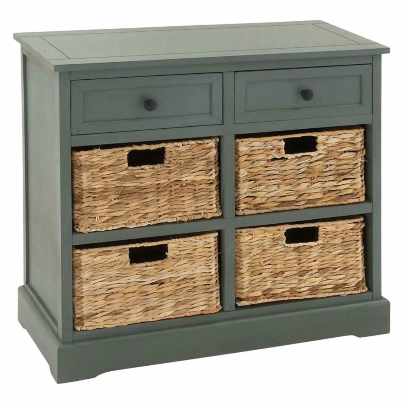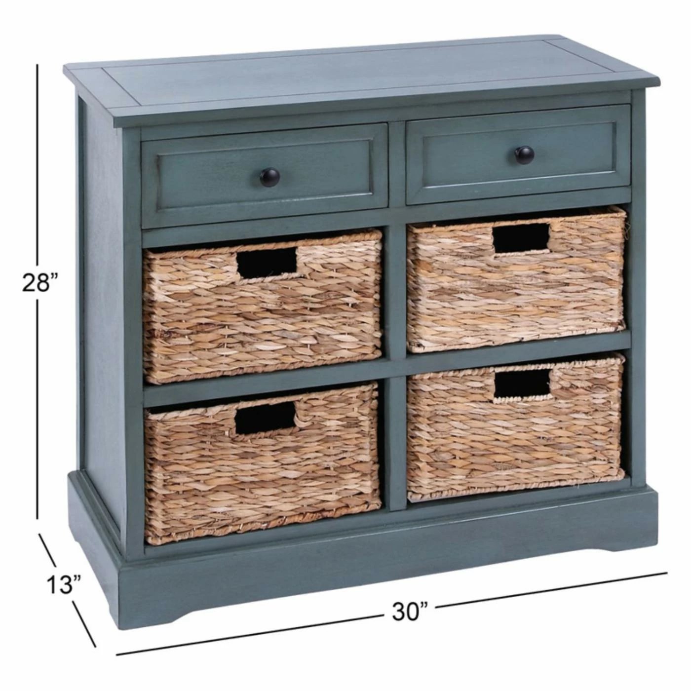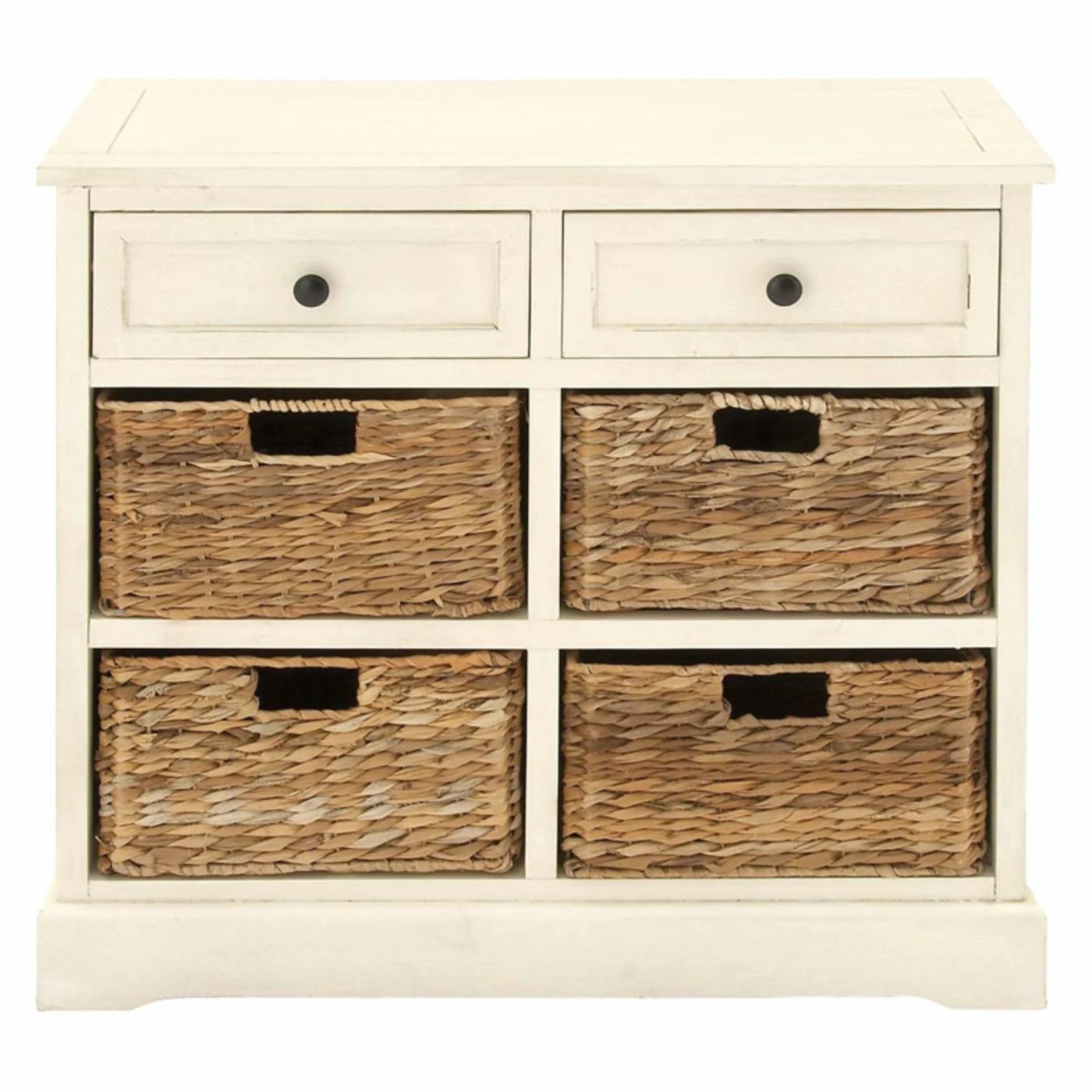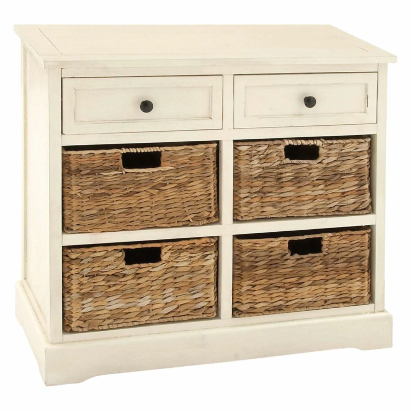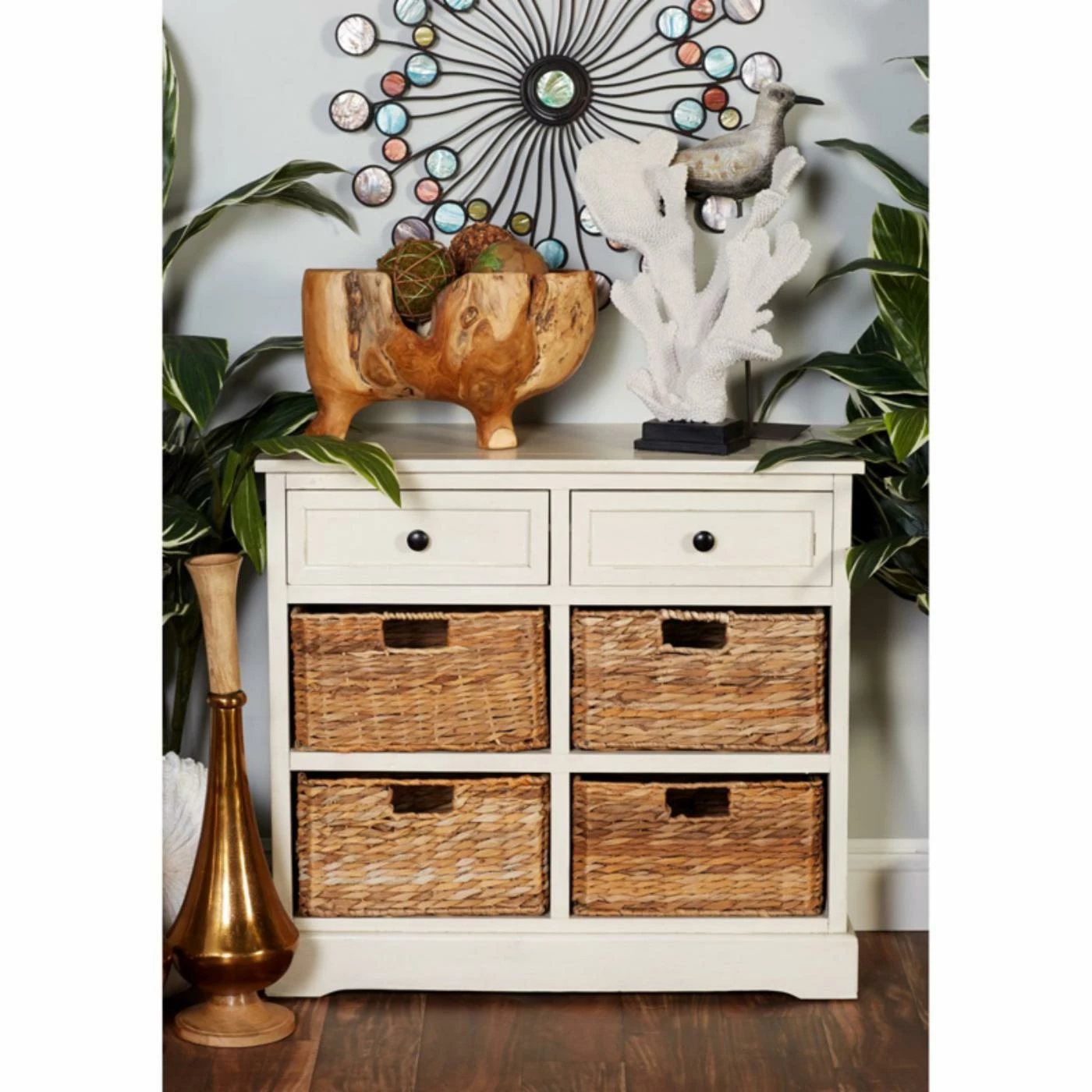 Add updated cottage styling to your home with the fashionable and functional DecMode 2 Drawer 4 Basket Wood Chest. This solid wood design features carved panels available in the finish of your choice, and sports a spacious top, two drawers, and four open shelves. These shelves include rustic wicker baskets that can stash anything from family photos and collectibles to toiletries and canned goods. And the baskets can be used separately from the chest so you can spread the rustic look around your home. No assembly is required.