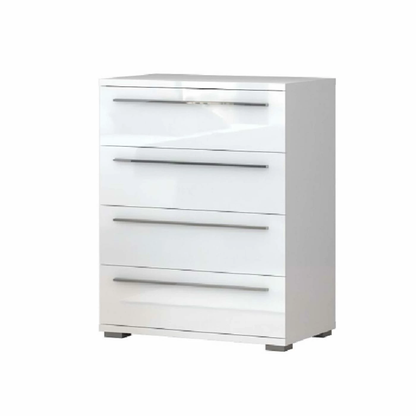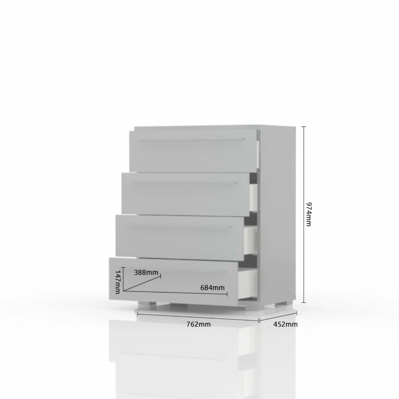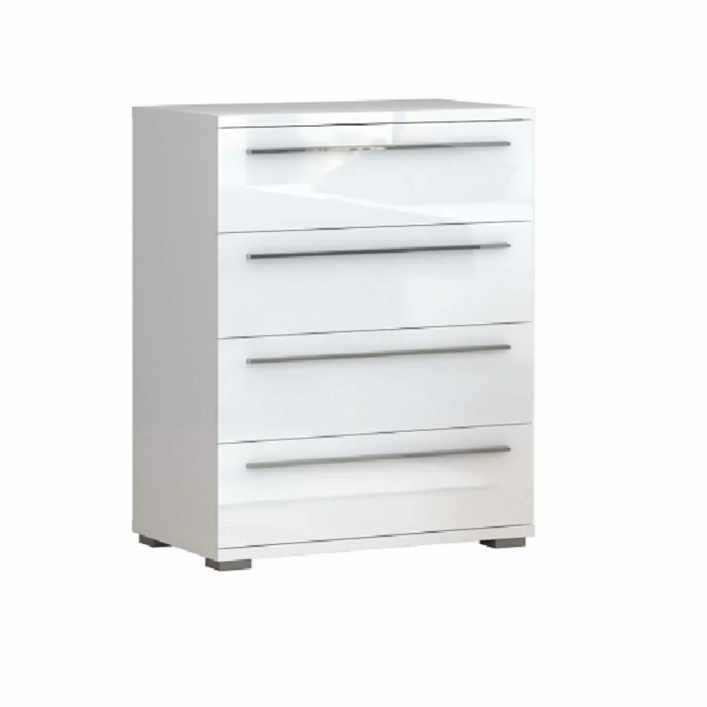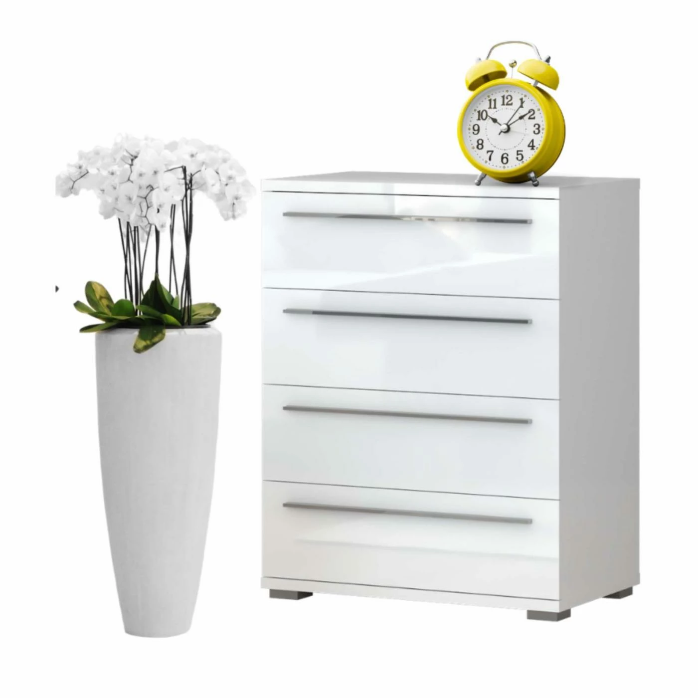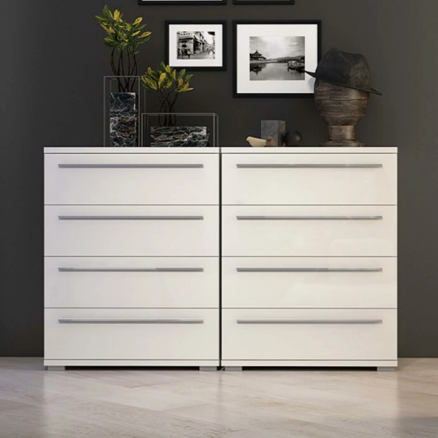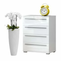 Create a pin-worthy bedroom with the Furniture.Agency Piano 4 Drawer High Gloss Chest of Drawers. Offersing clean lines with crispt white finishe and solid construction to build a nice view to your home dΓ©cor. Constructed from durable engineered wood with the front, both sides, and the top panel coated with high gloss UV lacquer is four times more resistant to physical damage then the standard finish. This chest has four spacious drawers with soft-close mechansims.