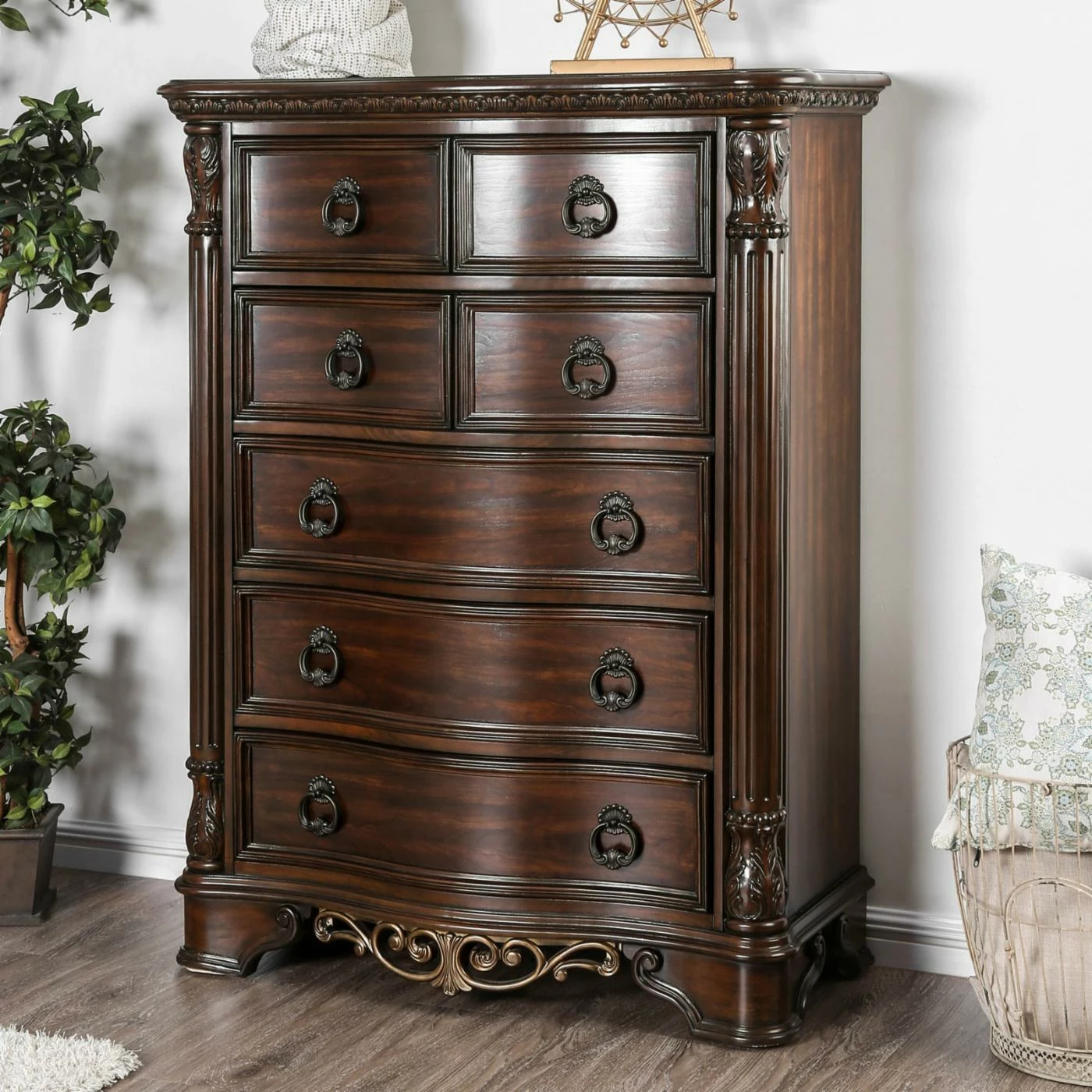 The Furniture of America Davidson Carved Wood 8 Drawer Dresser Chest features a sturdy wood construction in a deep espresso finish, and the top drawer is lined with felt to protect your jewelry and other treasures. You’ll love this large dresser chest that includes stylish metal hardware and ample storage space. Carved columns and scrolled details give it a delightful finishing touch.