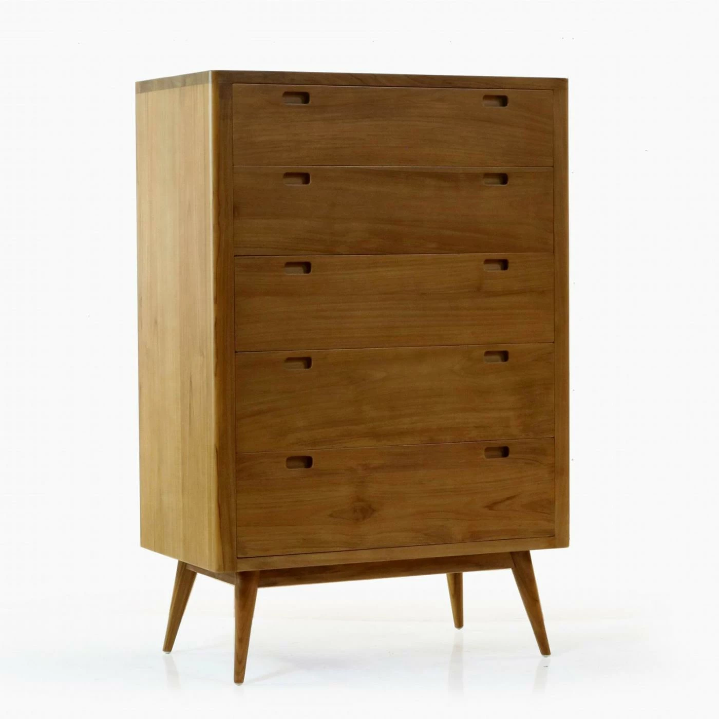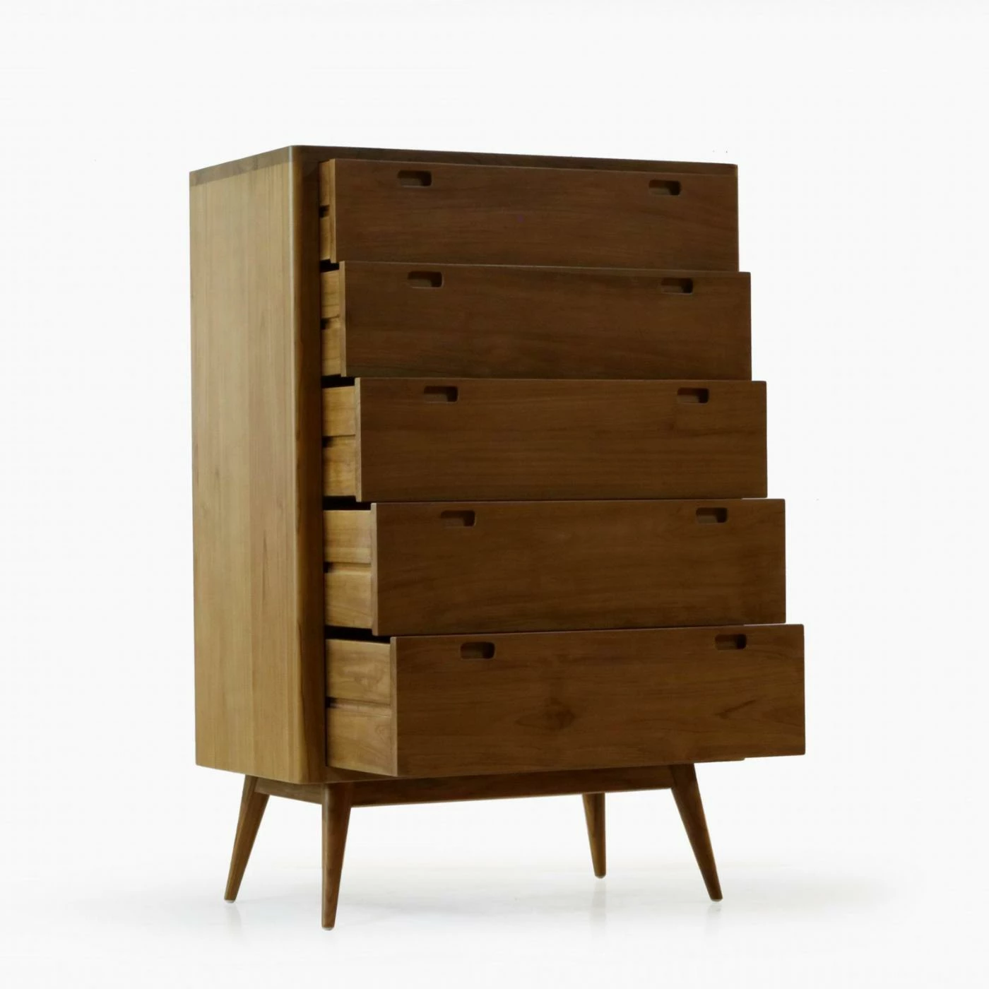 With a style inspired by mid-century modern design, the Harmonia Living Fifties 5 Drawer Tower Dresser is a great way to add a hint of vintage style to your bedroom dΓ©cor. The tower dresser is handmade from plantation-grown teak wood, and you’ll love how the Danish Honey finish highlights the natural character of the wood. Carved drawer handles on the five drawers, plus slender, splayed legs create a simplicity you (and your bedroom dΓ©cor) will love.