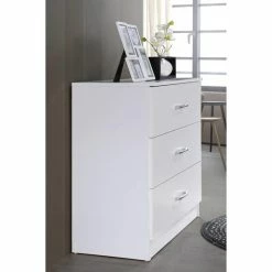 Stylish yet versatile, the Hodedah Imports 3 Drawer Chest boasts clean lines for a sleek contemporary look. Crafted from both hardwood and composite wood, this chest is durably crafted for long-lasting use. Its three drawers are spaciously designed to hold a myriad of apparel or common household items. Dovetail joinery and additional drawer supports enhance this chestโs sturdy design, making it a functional piece for master bedrooms, guest bedrooms, home offices, and more.