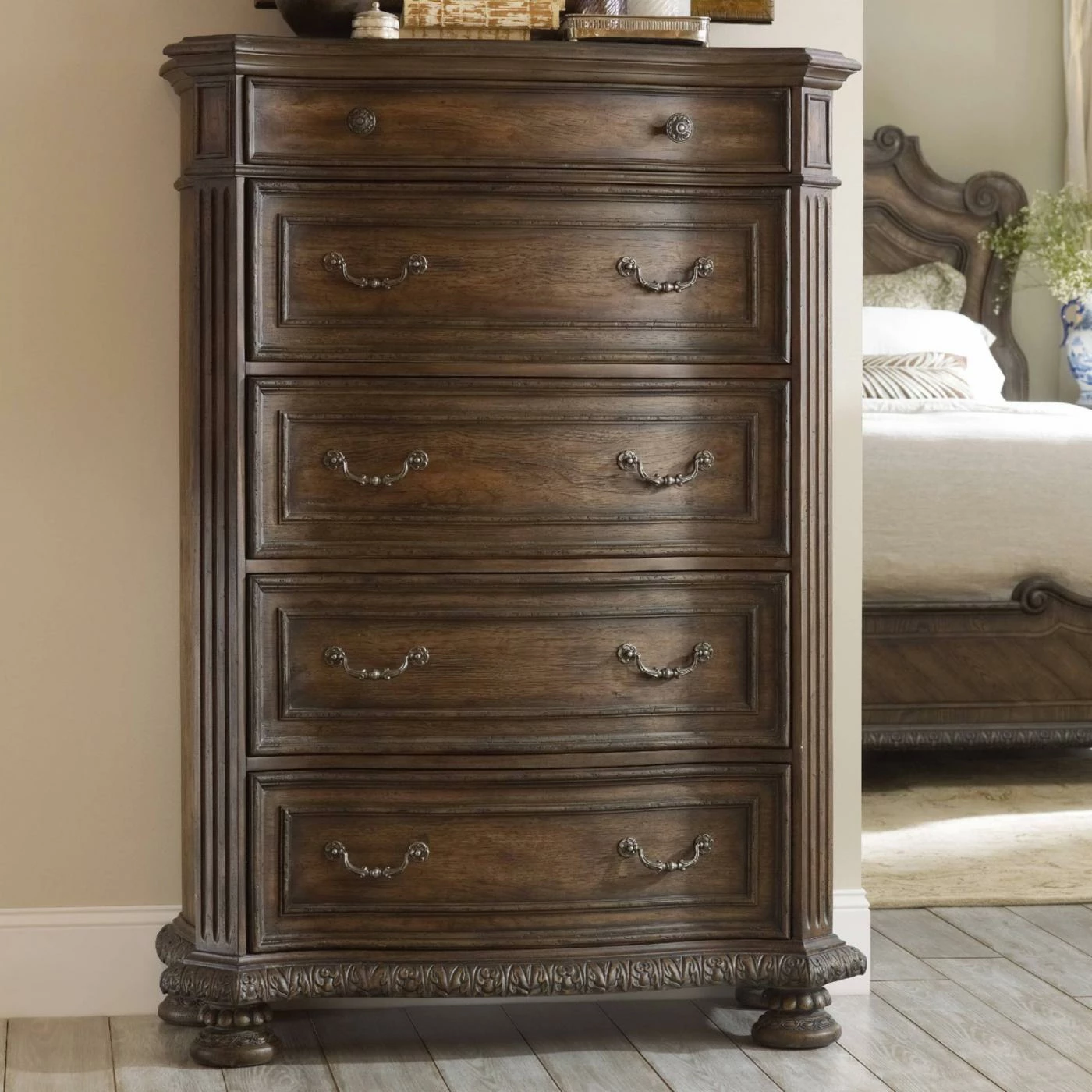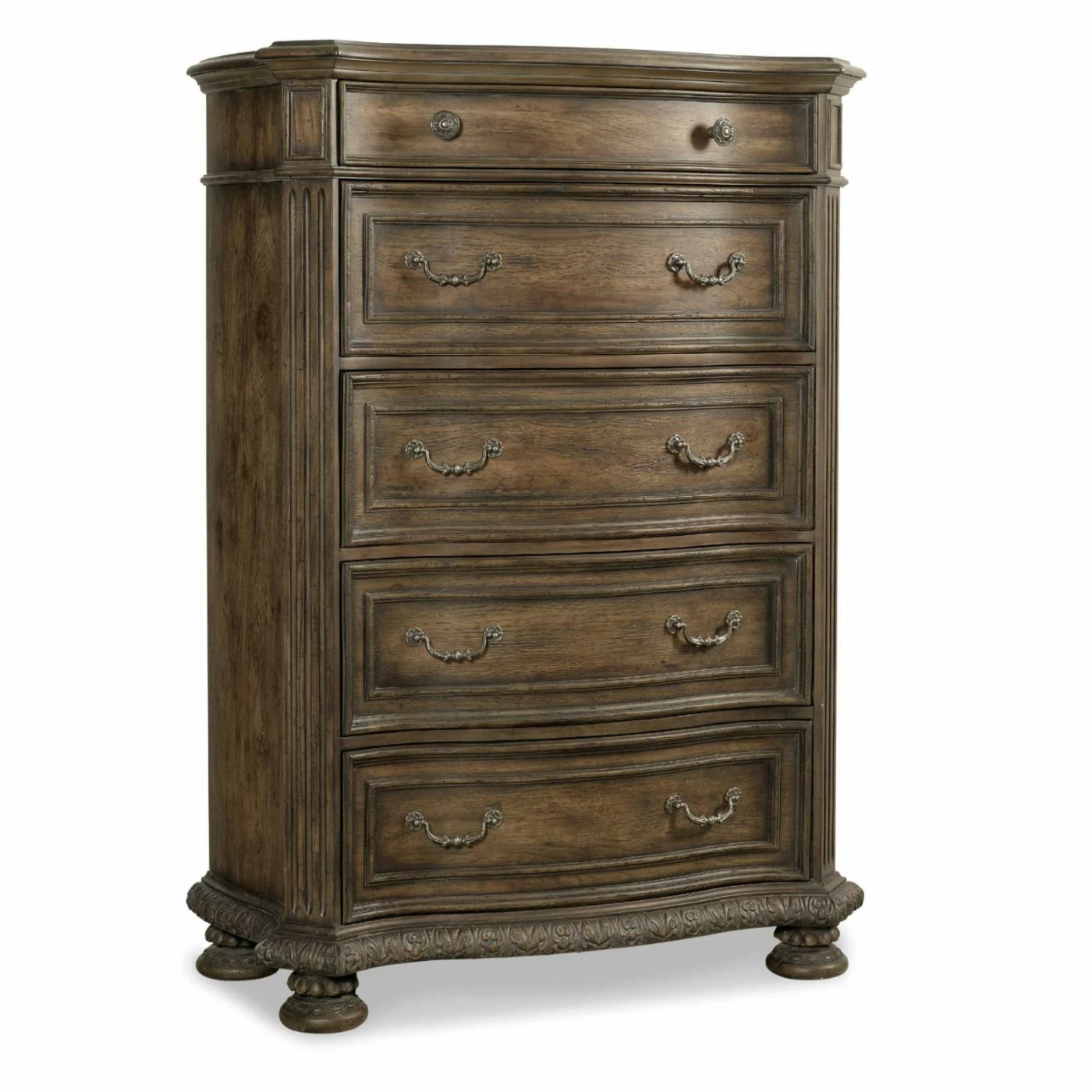 A rhapsody of classic design elements, the Hooker Furniture Rhapsody 5 Drawer Chest combines grand scale with a relaxed mindset to create a look that’s fancy but never fussy, refined yet far from extravagant. Carved details along the pilasters, base, and bun feet add to the Old World sensibility, while the walnut finish creates a down-to-earth rustic charm.