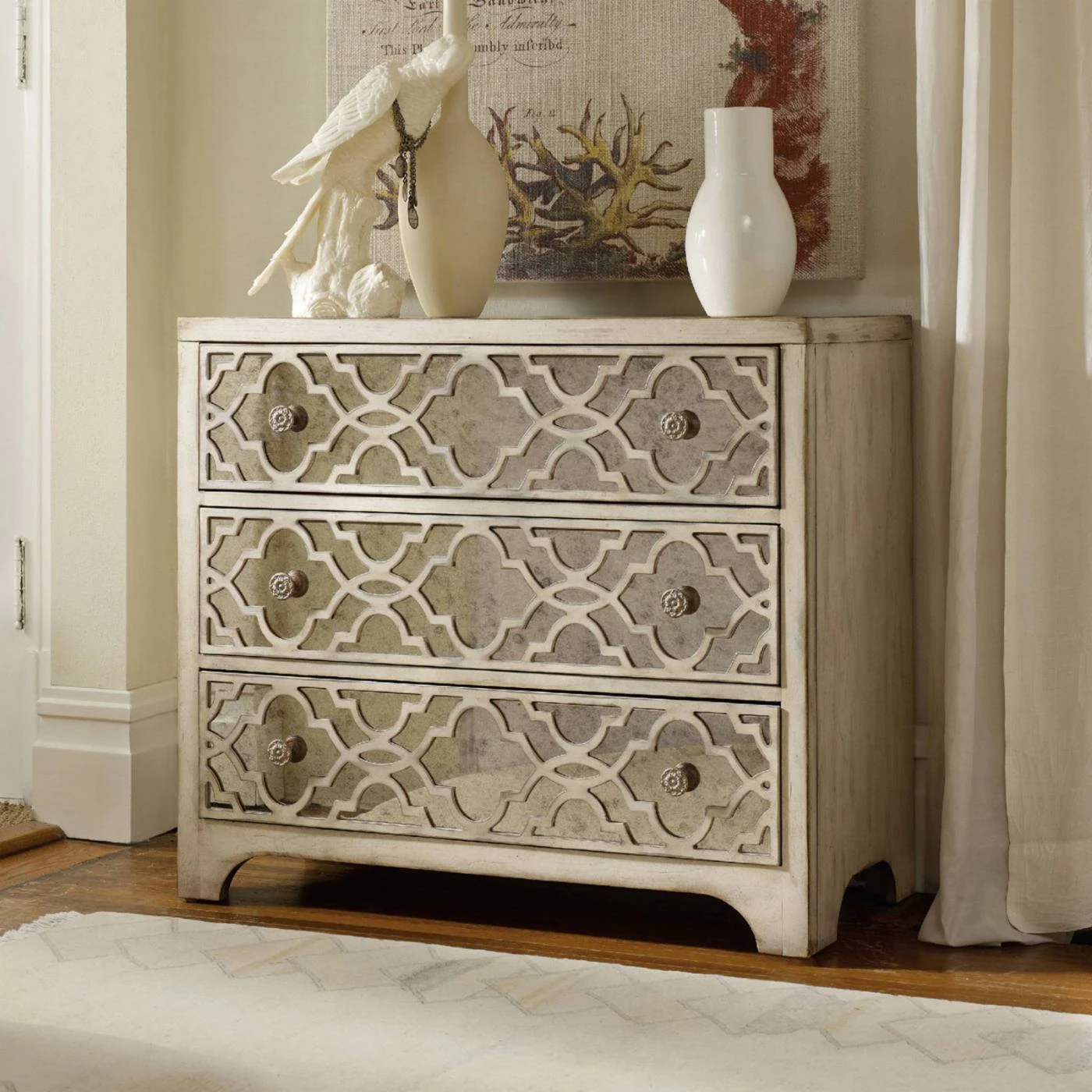 This Hooker Furniture Sanctuary Fretwork Chest makes a statement with its quality craftsmanship and detailed etching on the three drawers. Featuring glass, hardwood, oak veneer construction, it’s finished in luminous pearl essence. Sturdily built, it’s part of the Sanctuary Collection.