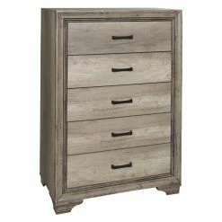 For abundant storage that doesn’t take up much floor space, choose the Liberty Furniture Industries Sun Valley 5 Drawer Chest. Its five English dovetail drawers are stacked vertically and operate on premium Kenlin glides. This contemporary chest boasts clean lines, framed drawer panels, and bracket feet. It has a solid rubberwood frame with melamine in a sandstone finish that allows the wood grain to shine.