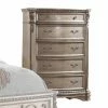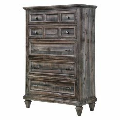 A sense of freedom and spaciousness comes with the rustic Magnussen Calistoga 5 Drawer Chest. Oversized spade feet and an intriguing rustic aesthetic will have you dreaming of Napa Valley. The distressed charcoal finish and oiled bronze hardware lend a bold yet refined look. Drawers are mounted on side mounted ball bearing glides for durability and quiet, smooth operation. The bottom of this piece is dust proofed, and the drawers feature English and French dovetails. Stow delicates with confidence thanks to a felt-lined top drawer.